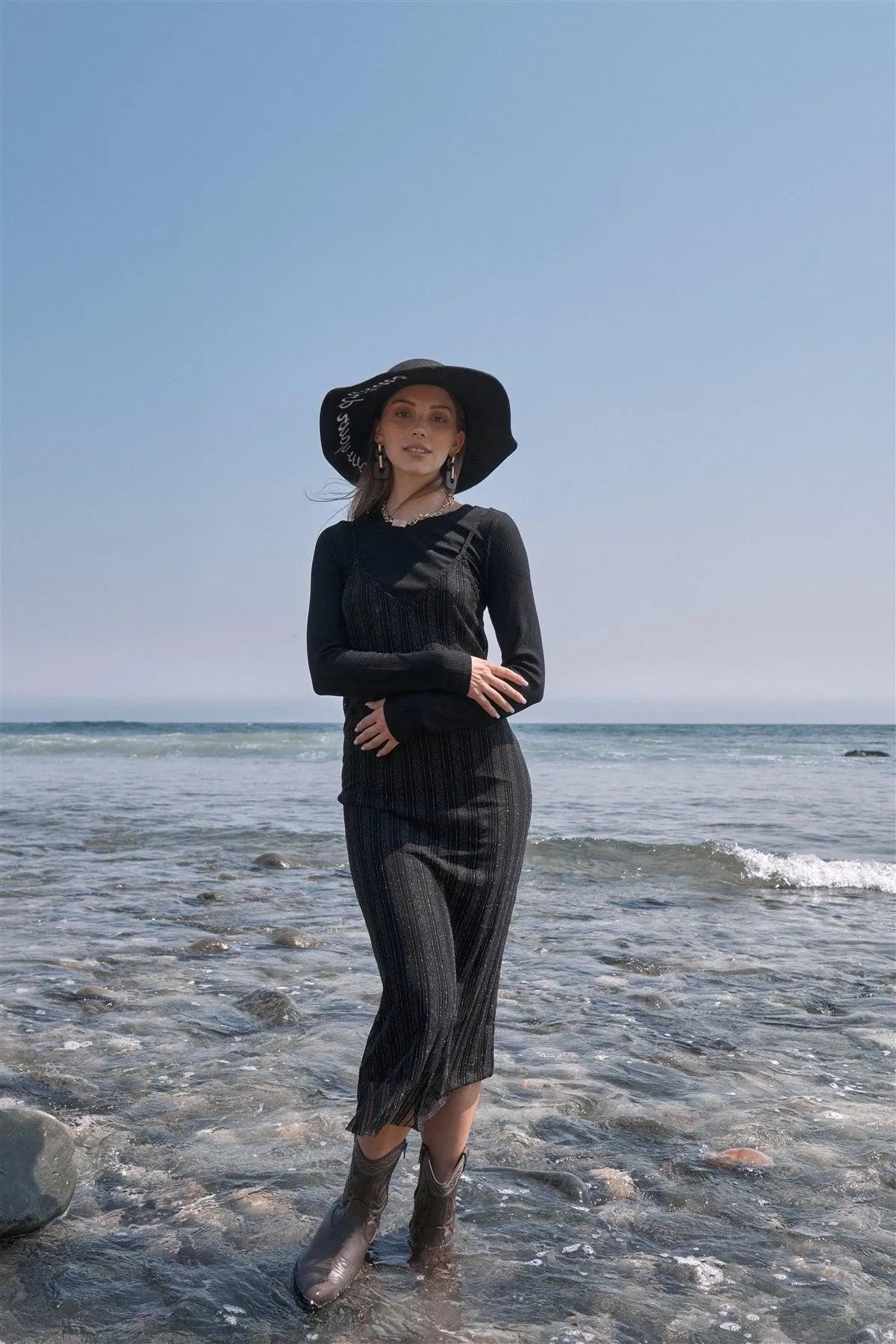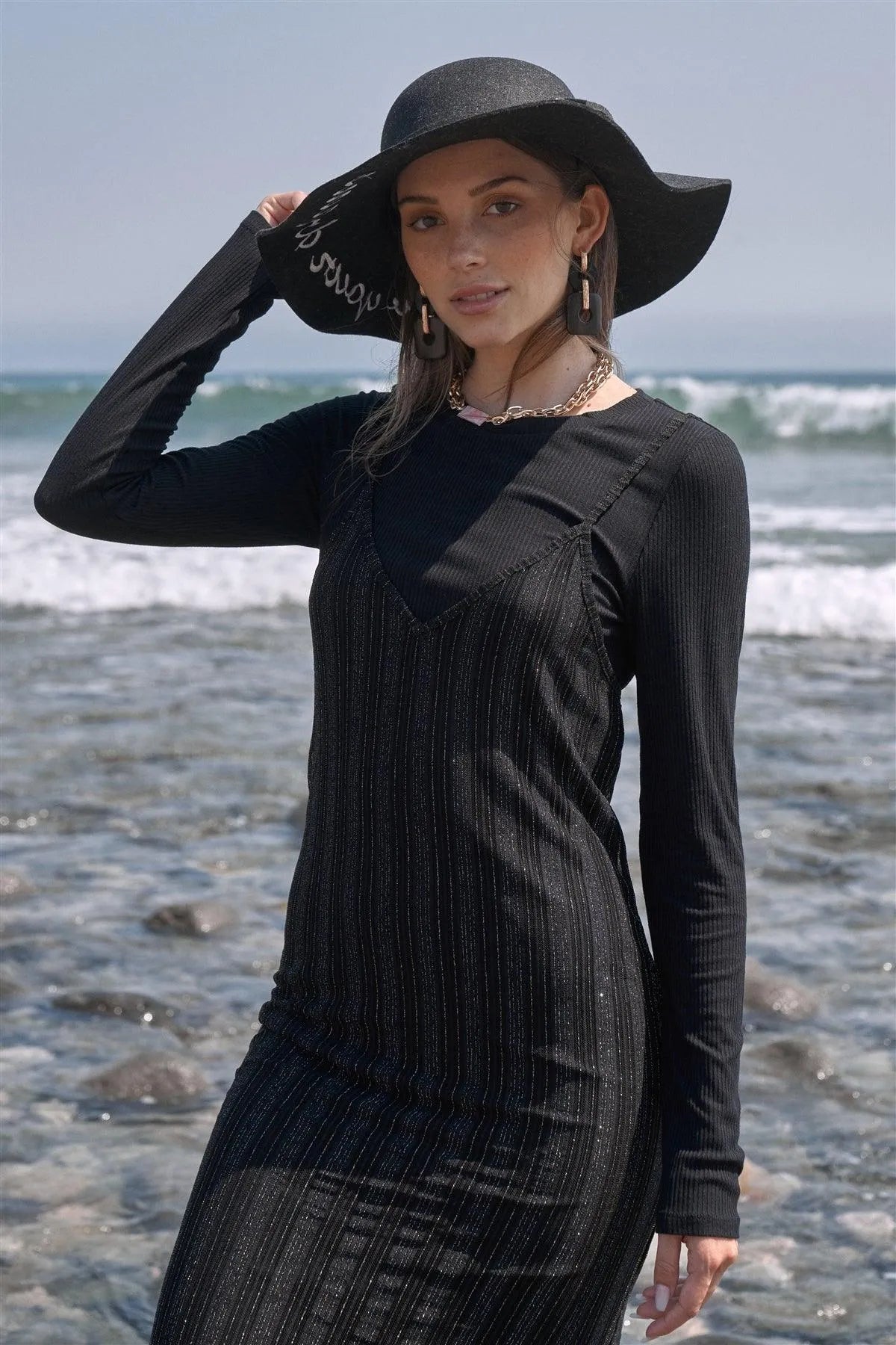 🖤 Item Features: Black and silver, shimmery striped mesh top layer with non-adjustable shoulder straps and V-neckline, sheer; black solid ribbed bottom layer with long sleeve and round neckline, non-sheer; maxi length, fitted, stretchy, casual chic, elegant, festival vibe, stylish, fall/winter collection