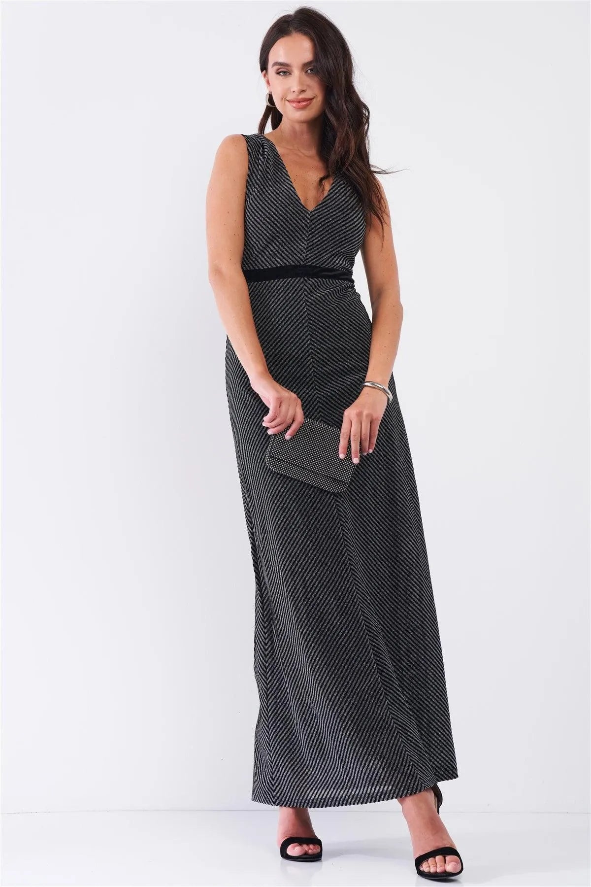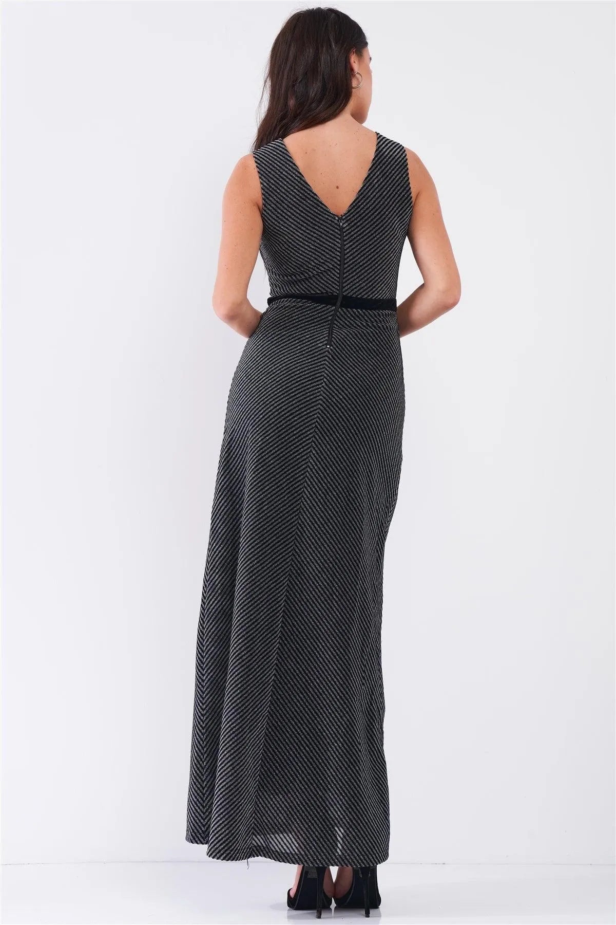 Black Silver Striped Sleeveless V-Neck Velvet Waistband Detail Fitted Maxi Dress /3-2-1