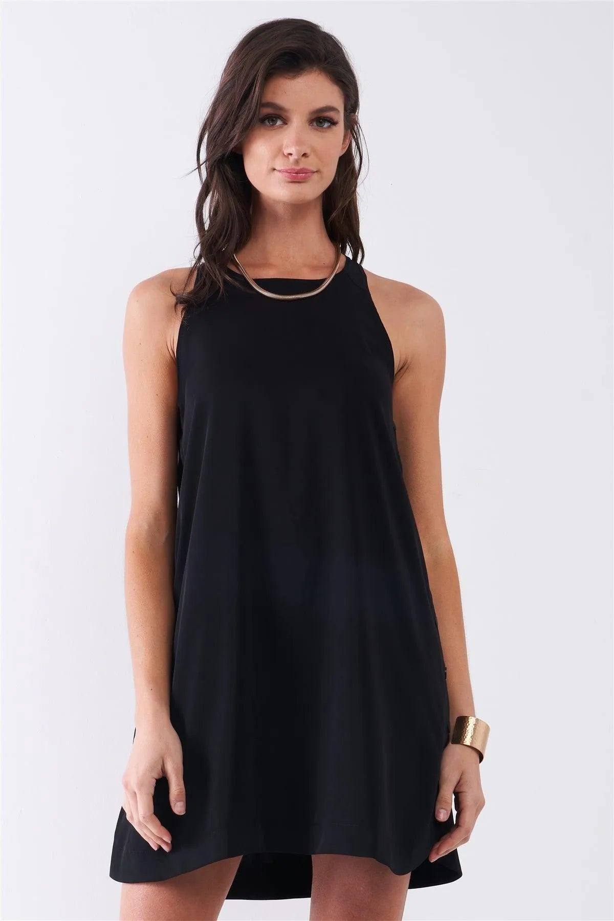 Black Sleeveless Crew Neck Side Snap Button Down Racerback Mini Tent Dress /1-2-1-1