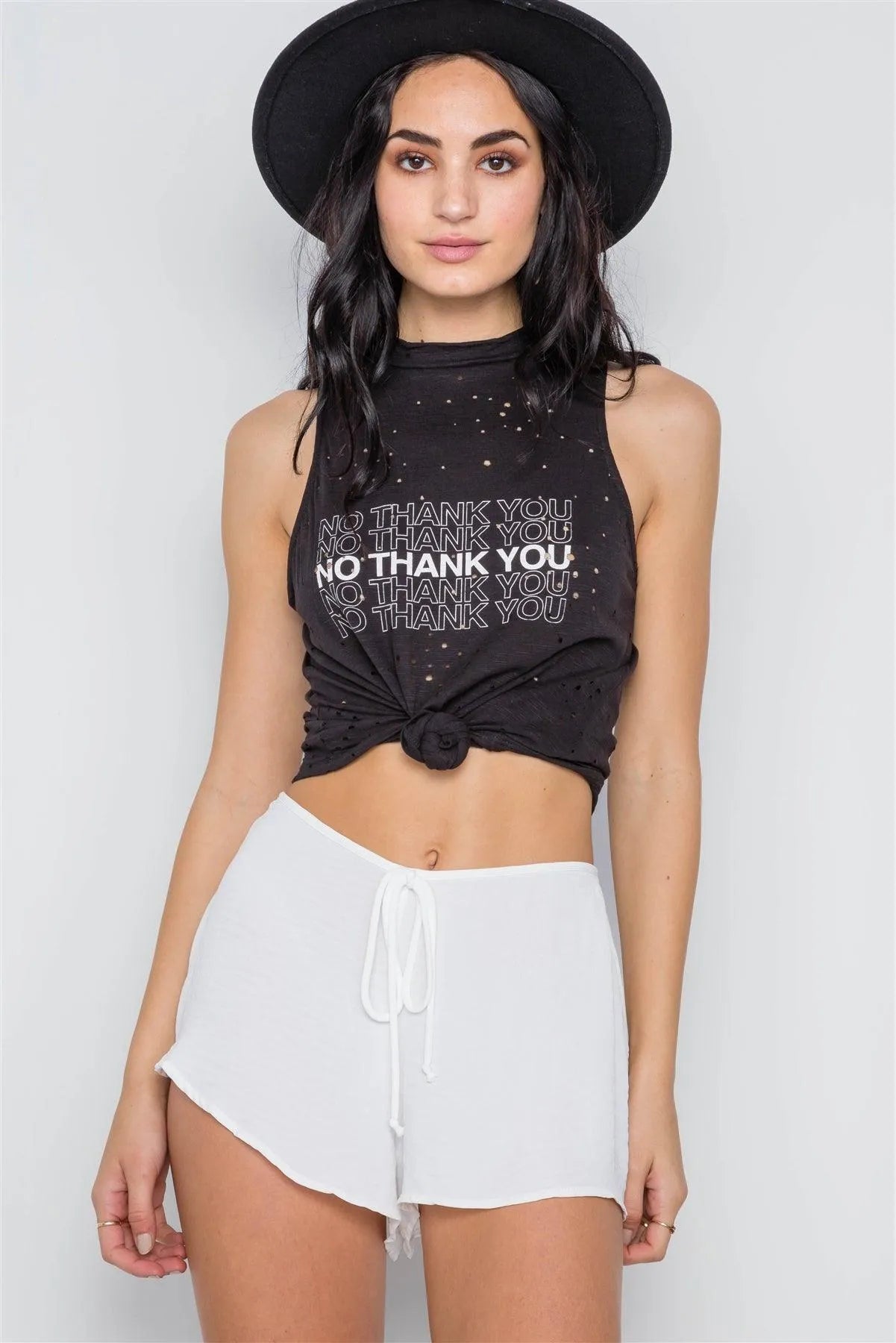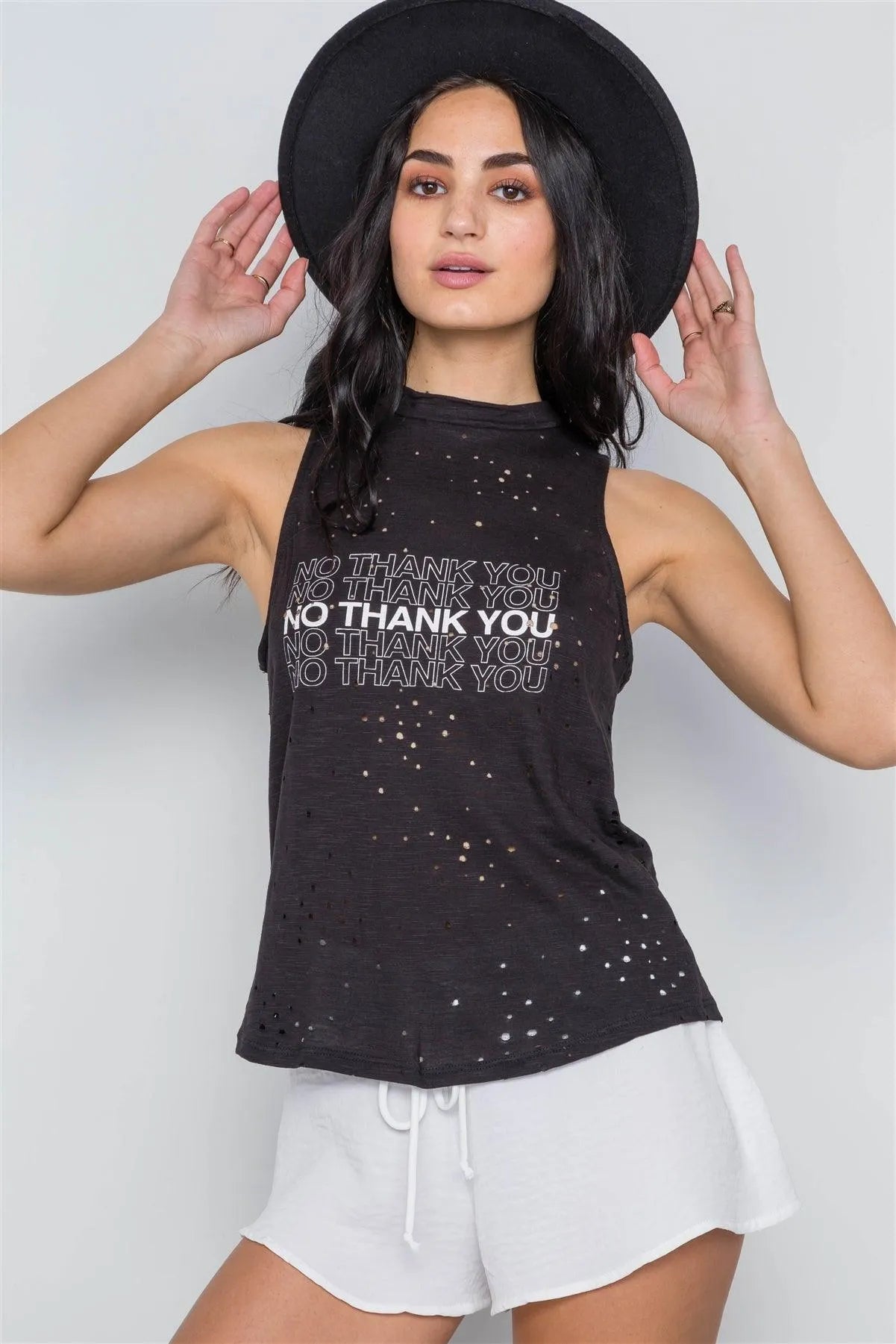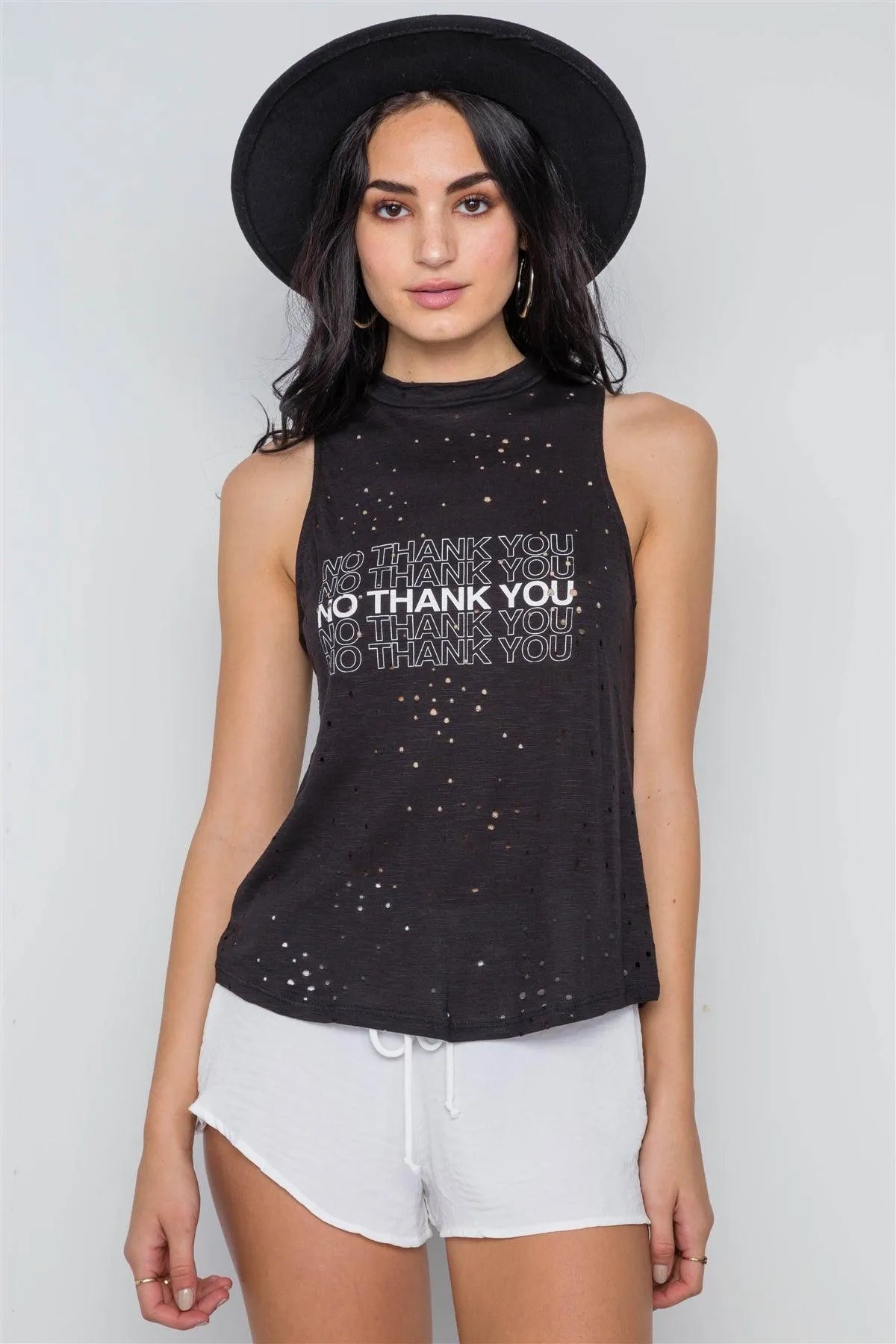 Top features: sleeveless, distressed detailing allover, graphic print: "No Thank You" Model is 5'8 and wearing Small (Waist: 24", Bust: 32A, Hips: 34")Item Measurements: Length: 22", Waist: 34"True to size