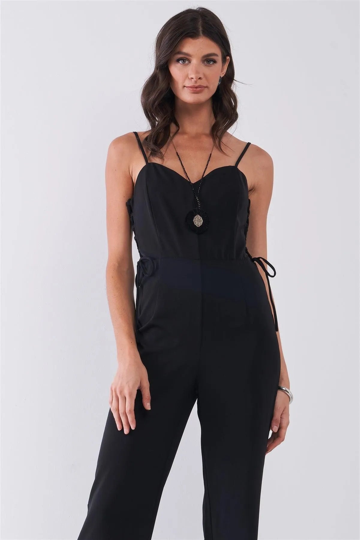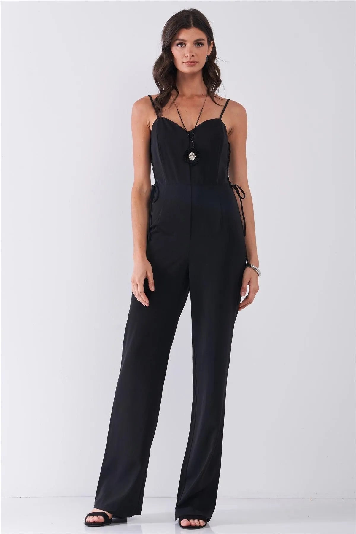 Black Sleeveless Sweetheart Neck Side Lace-Up High-Waisted Straight Leg Jumpsuit /1-2-2-1