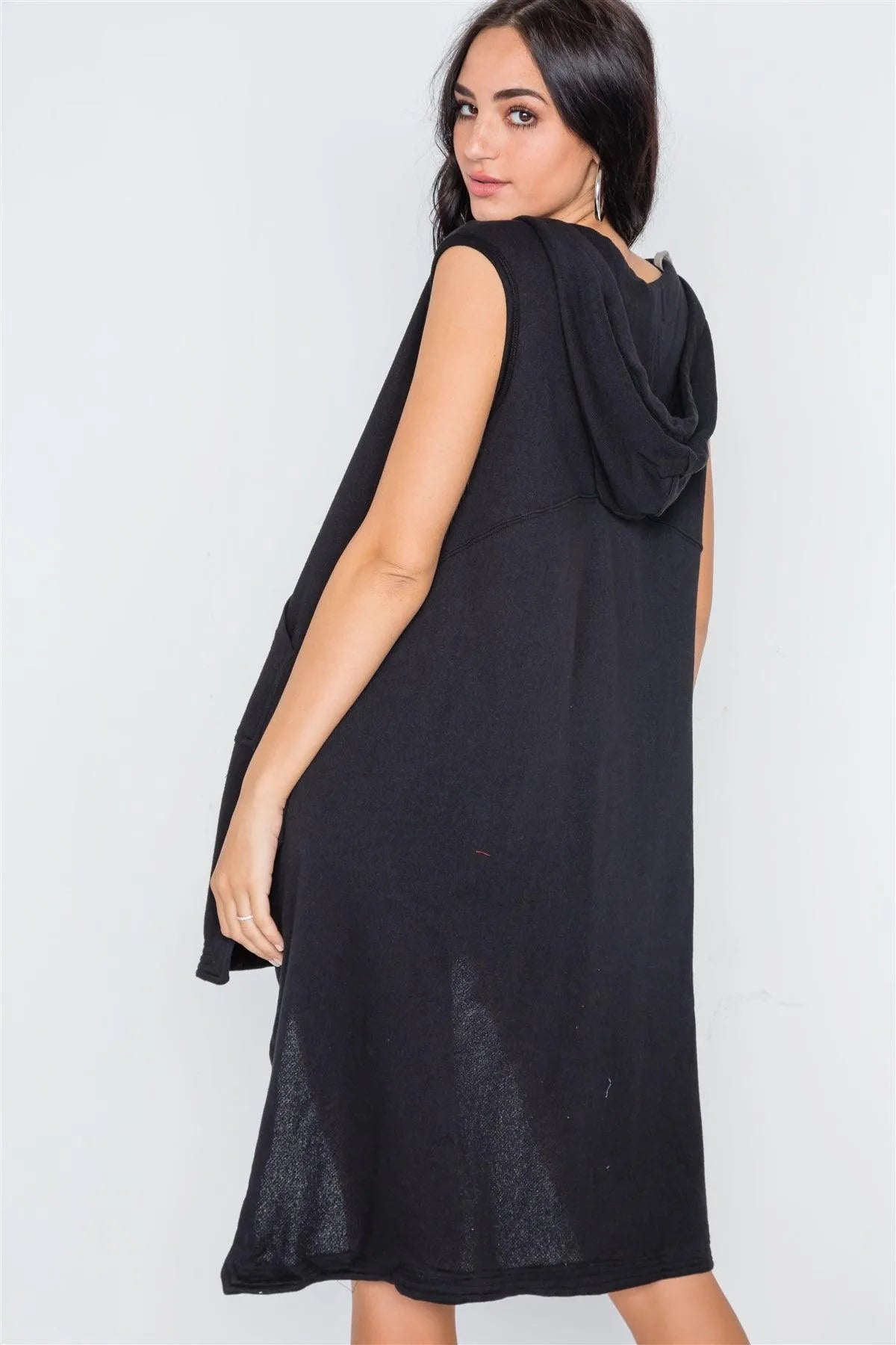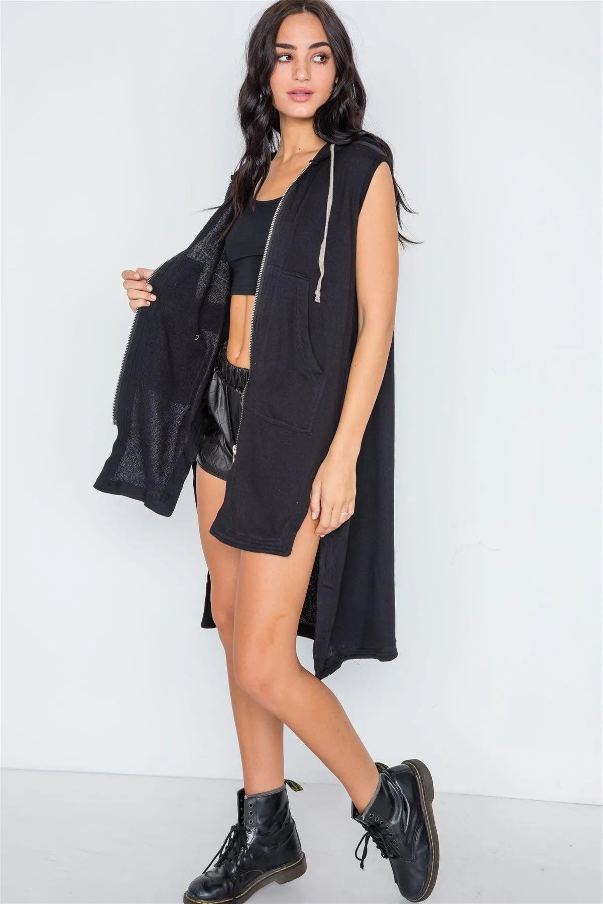 🖤 Item Features: sleeveless, high-low hem, front zip closure, drawstring hood, front slit pockets.