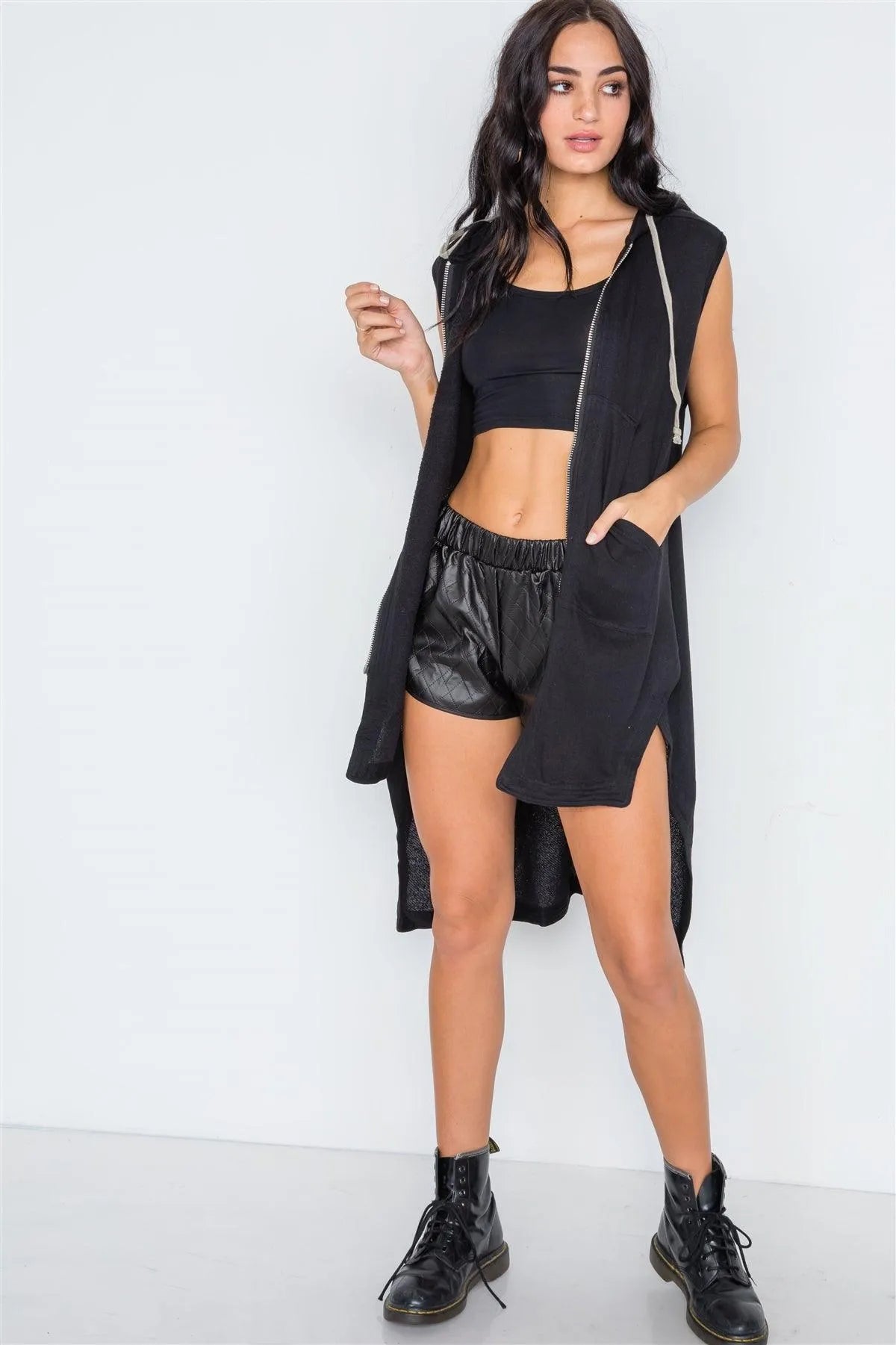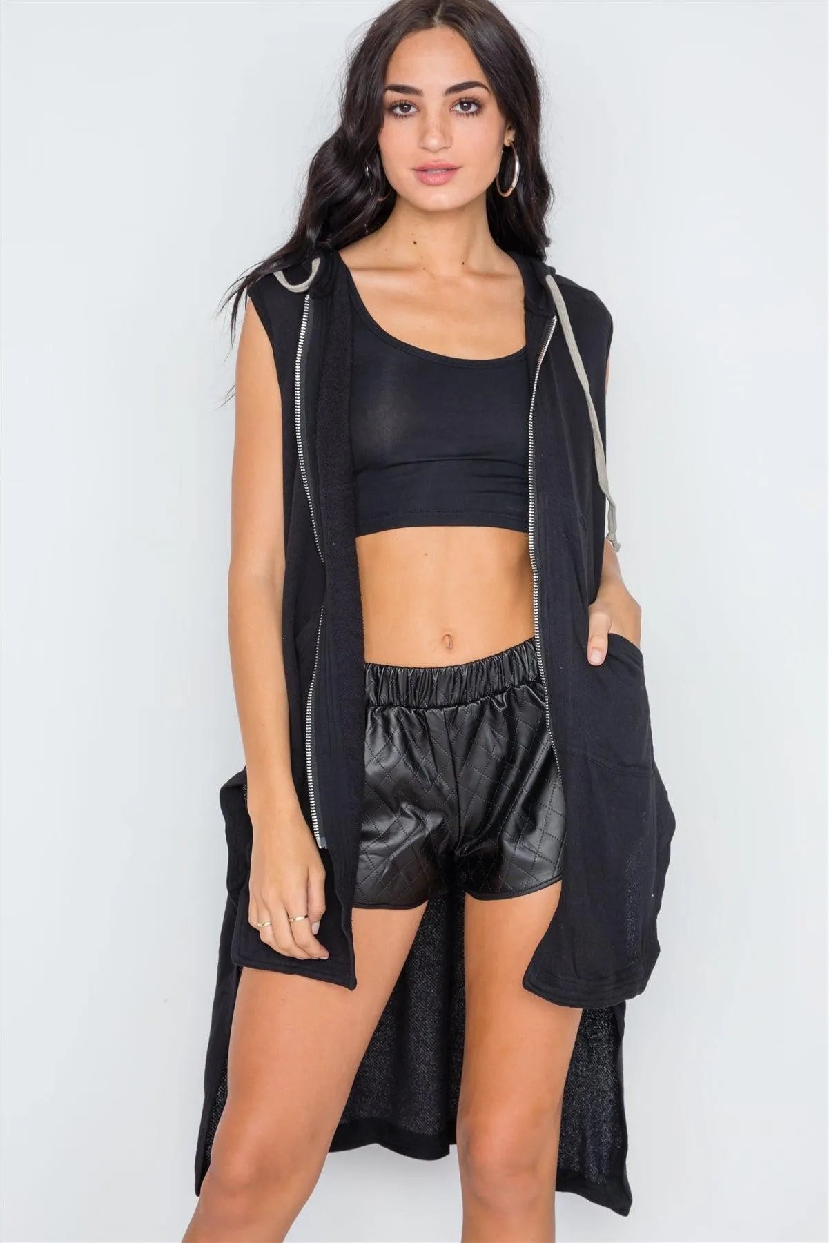 Black Sleeveless Zip-Up Hooded Knit Vest /3-2-1