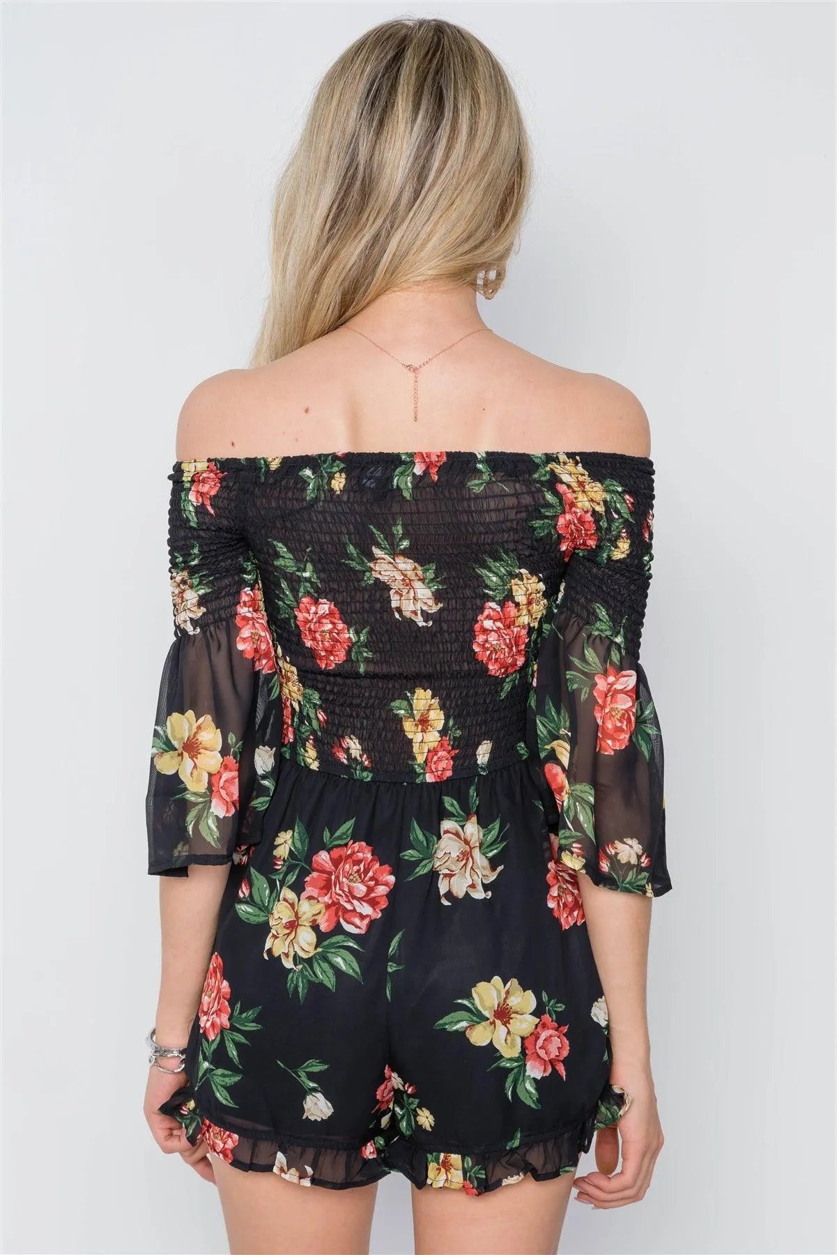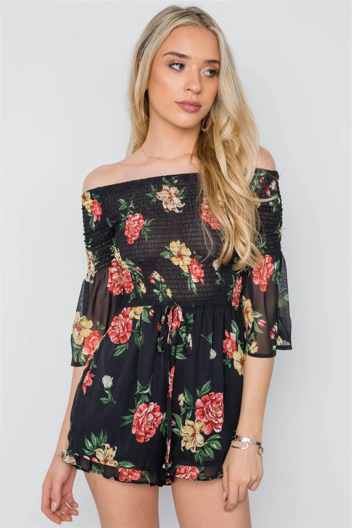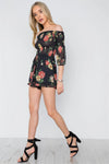 Black Smocked Floral Print Off-The-Shoulder Romper /1-3