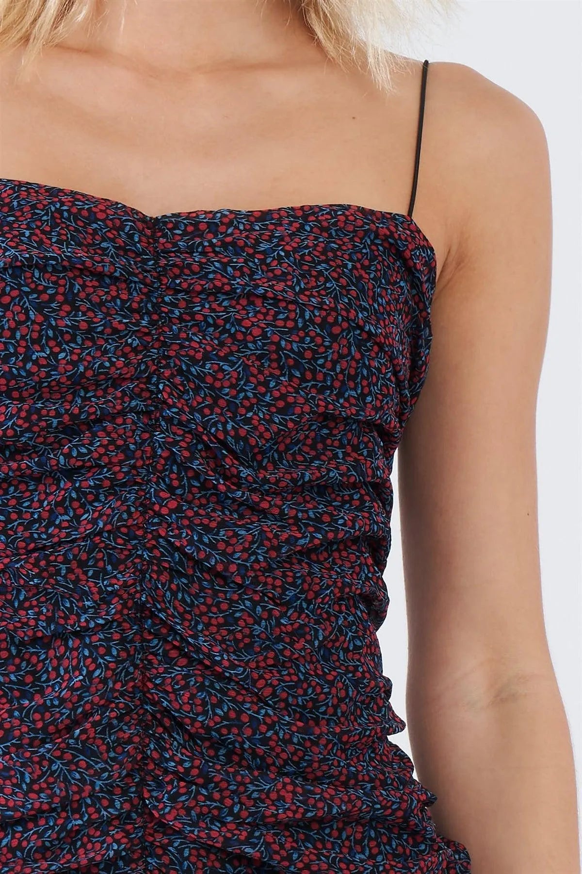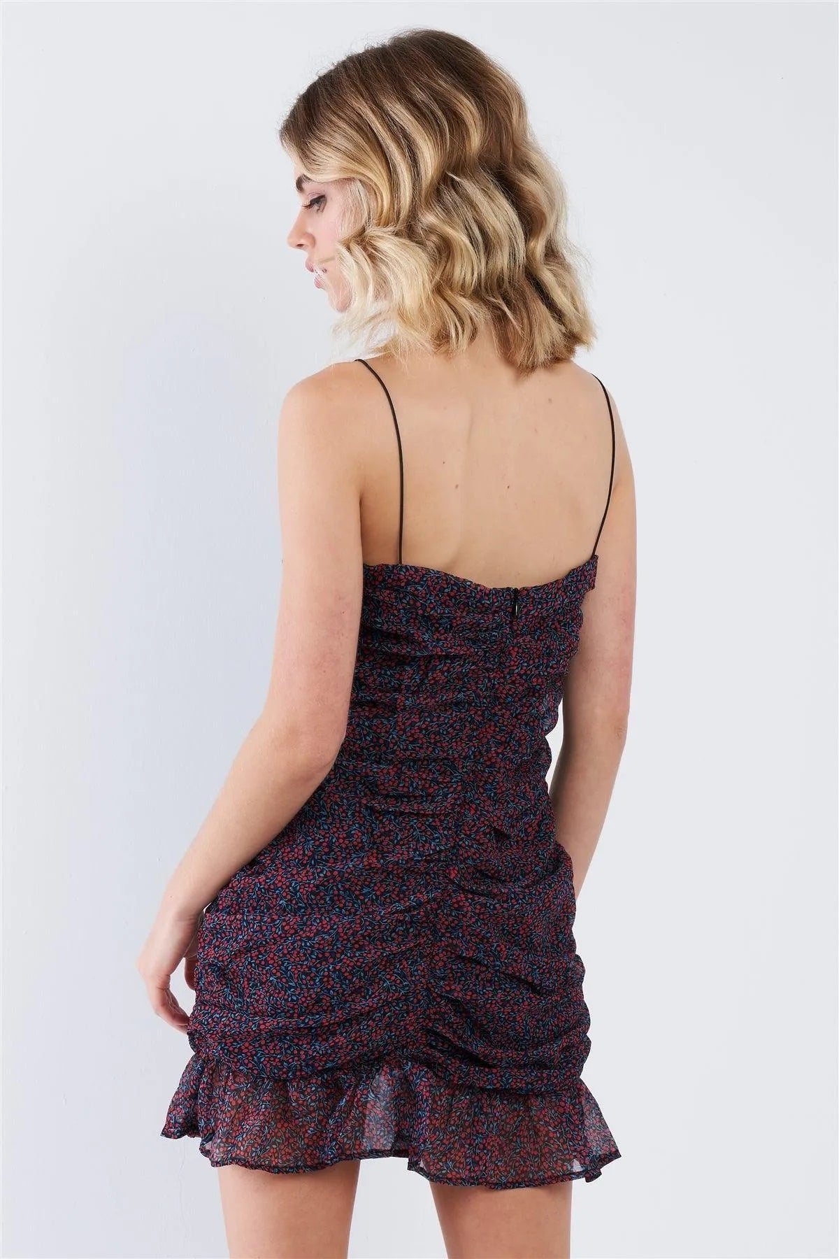 Dress features: chic, mini, red and blue floral print, chiffon, lined sheer, mini length, elastic spaghetti straps, hidden back zipper closure, lined, stretchy.Model is 5'5" and wearing a Small (Waist: 23", Bust: 32A", Hips: 24")Item Measurements: Length: 35.5" , Bust: 28"Item comes pre-packed with hang tagsTrue to size