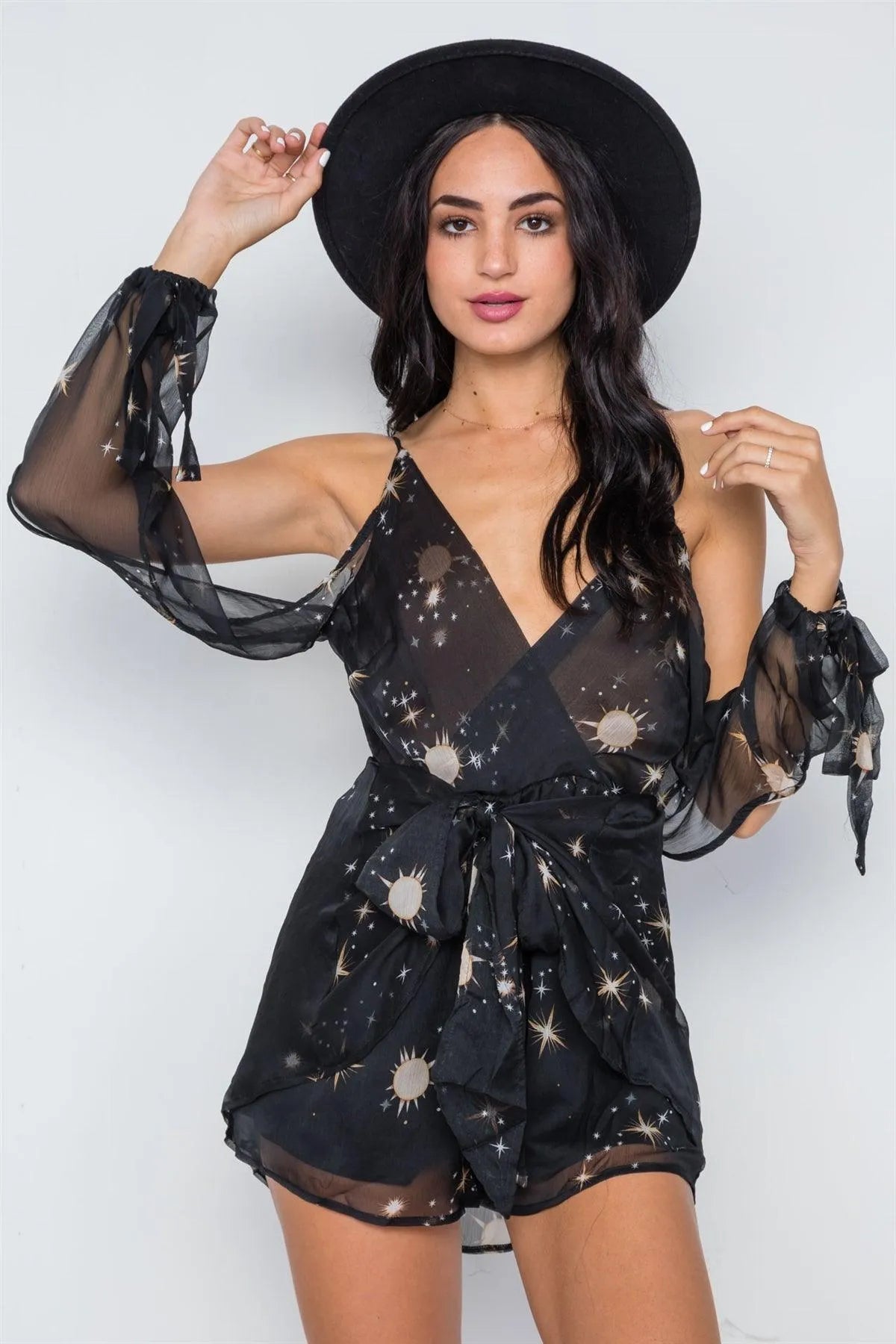 Black Star Dust Print Chiffon Cold Shoulder Romper /1-3-2-1