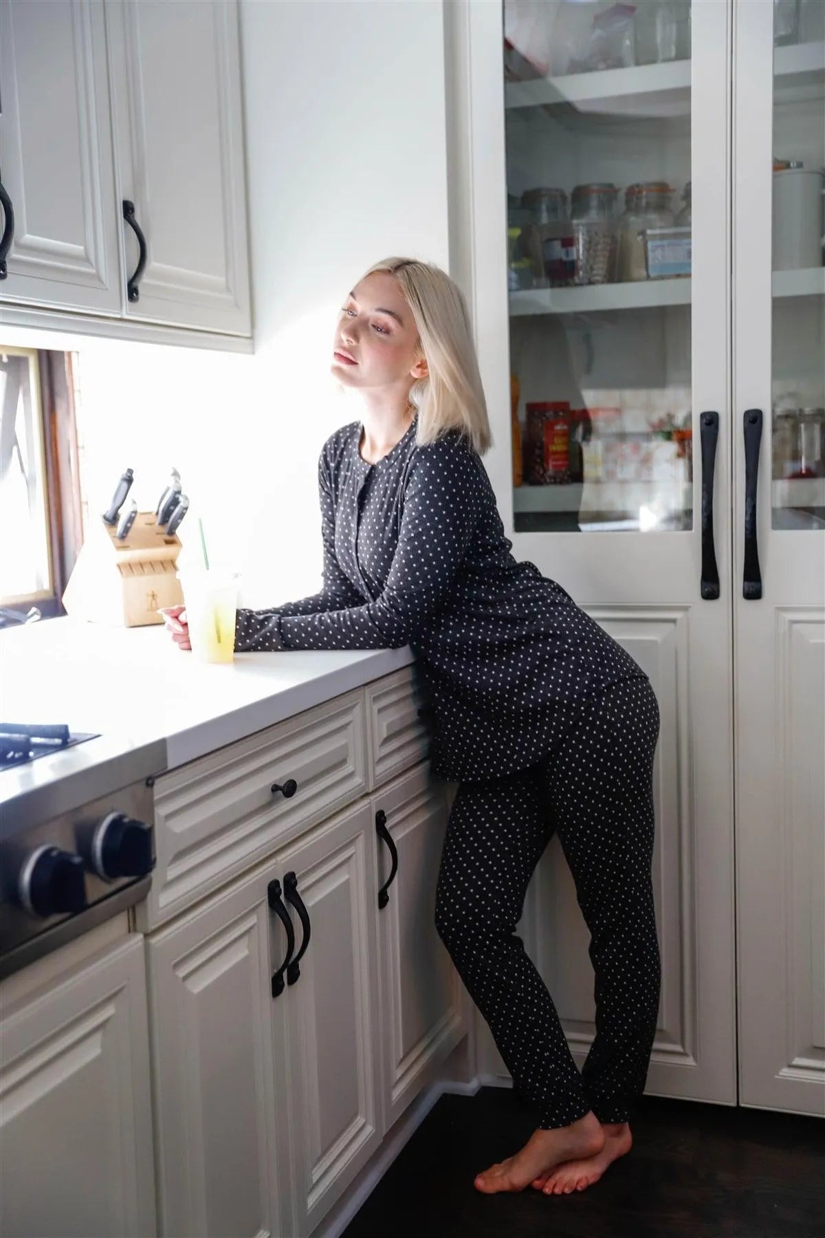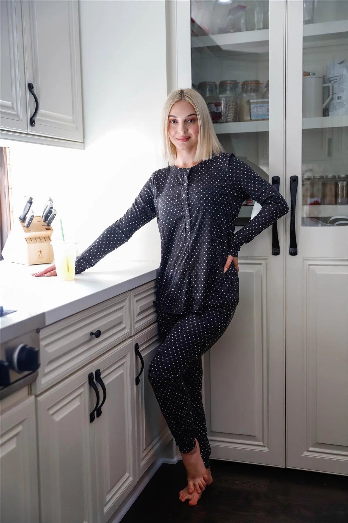 🖤 Item features: Black, star print, crewneck, Long sleeve, hem detail, button up, crew neckline, long sleeves, slim fit sweatpants, elasticized waistline with drawstring, cuffed hem, no pockets, stretchy, unlined, comfy, loungewear, stylish, trendy, must have