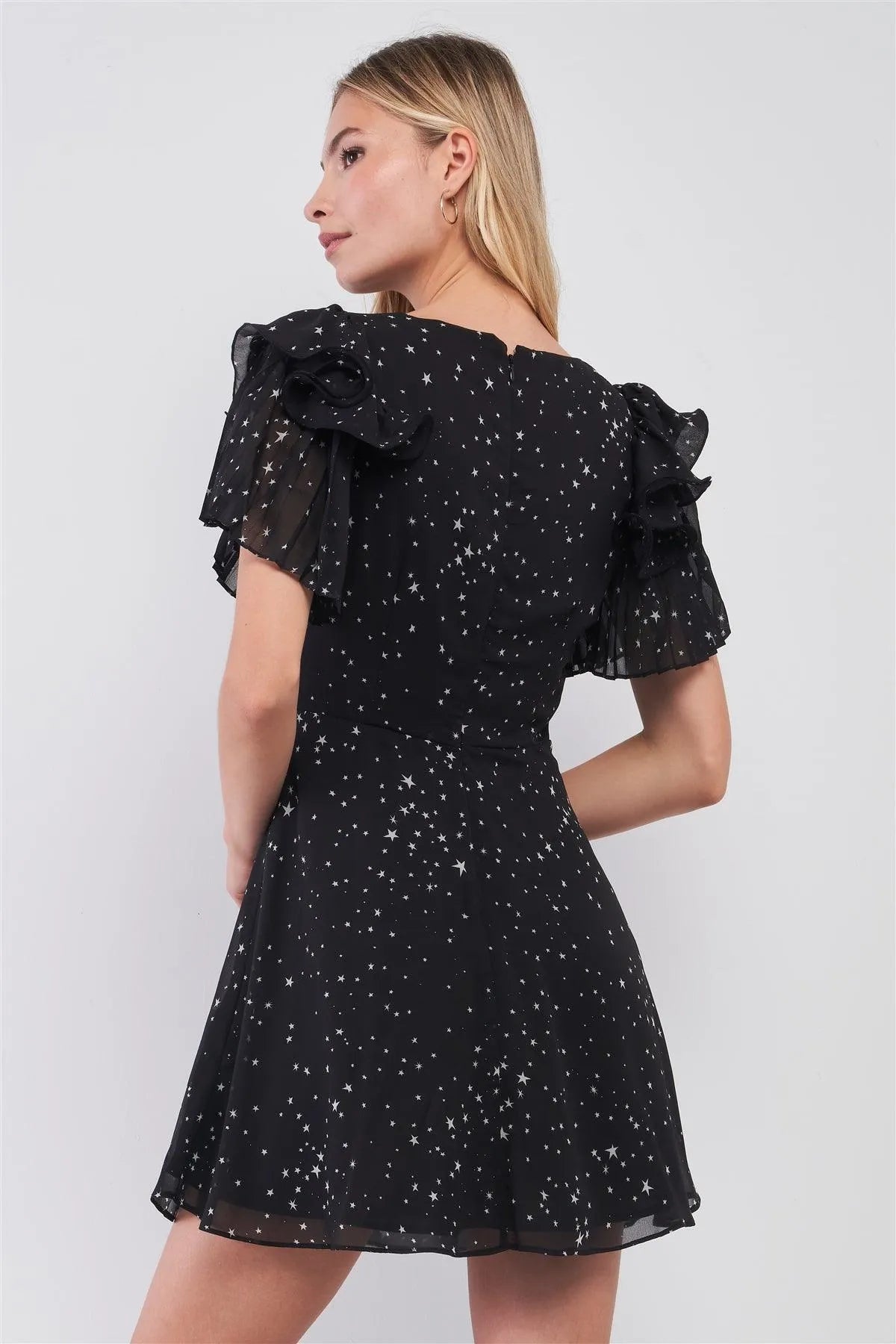 Your Lucky Star Black & White Starry Print Ruffle & Pleat Short Sleeve Flare Mini Dress /2-3-2