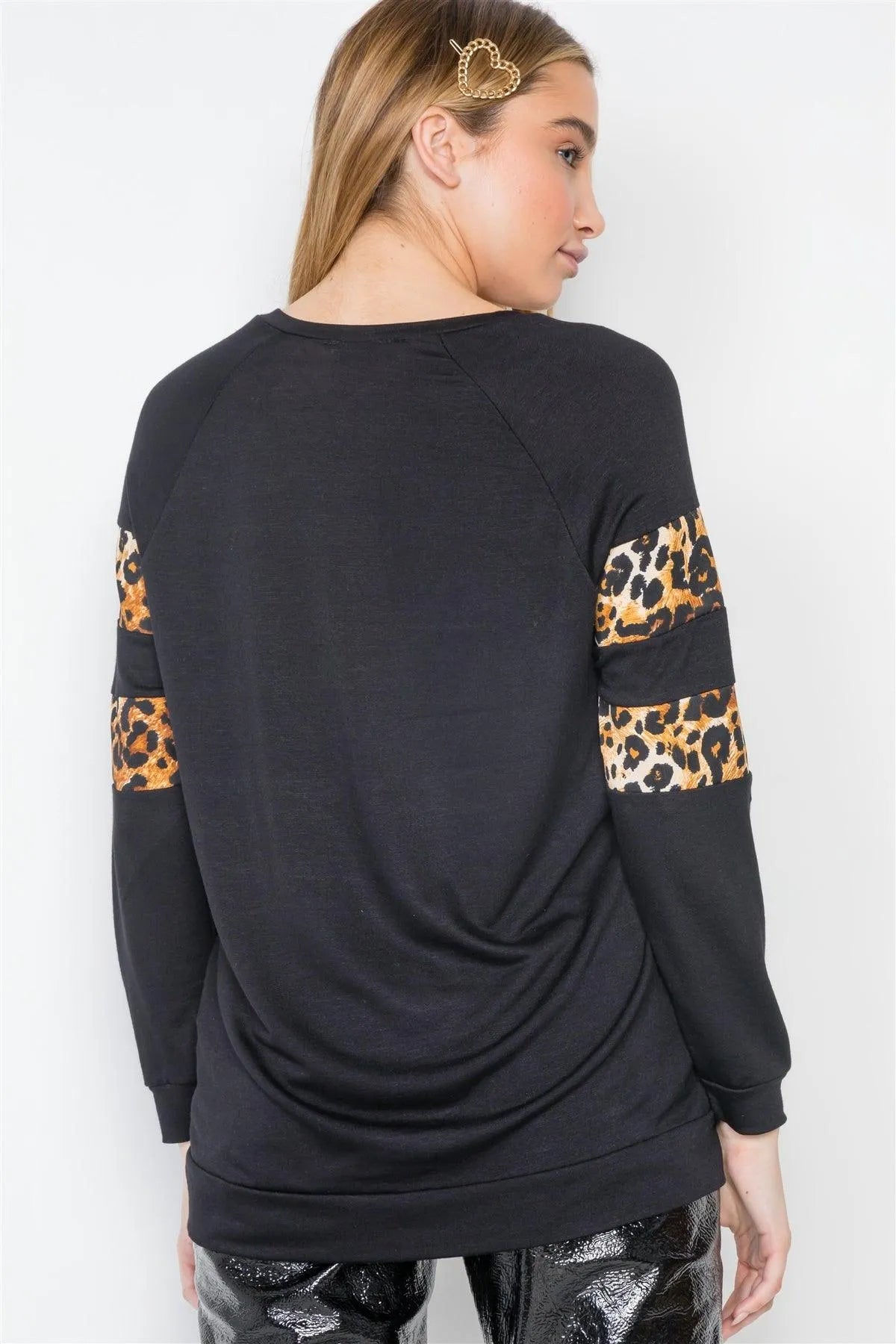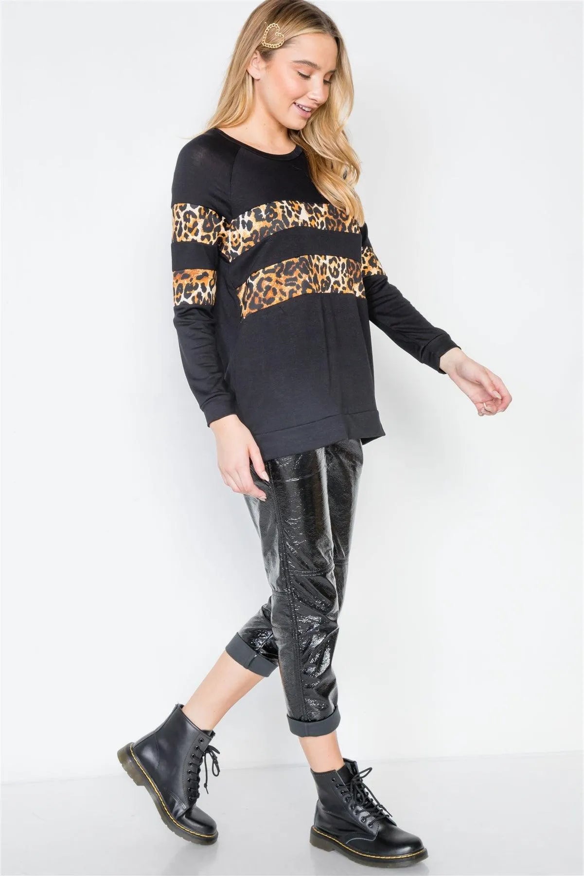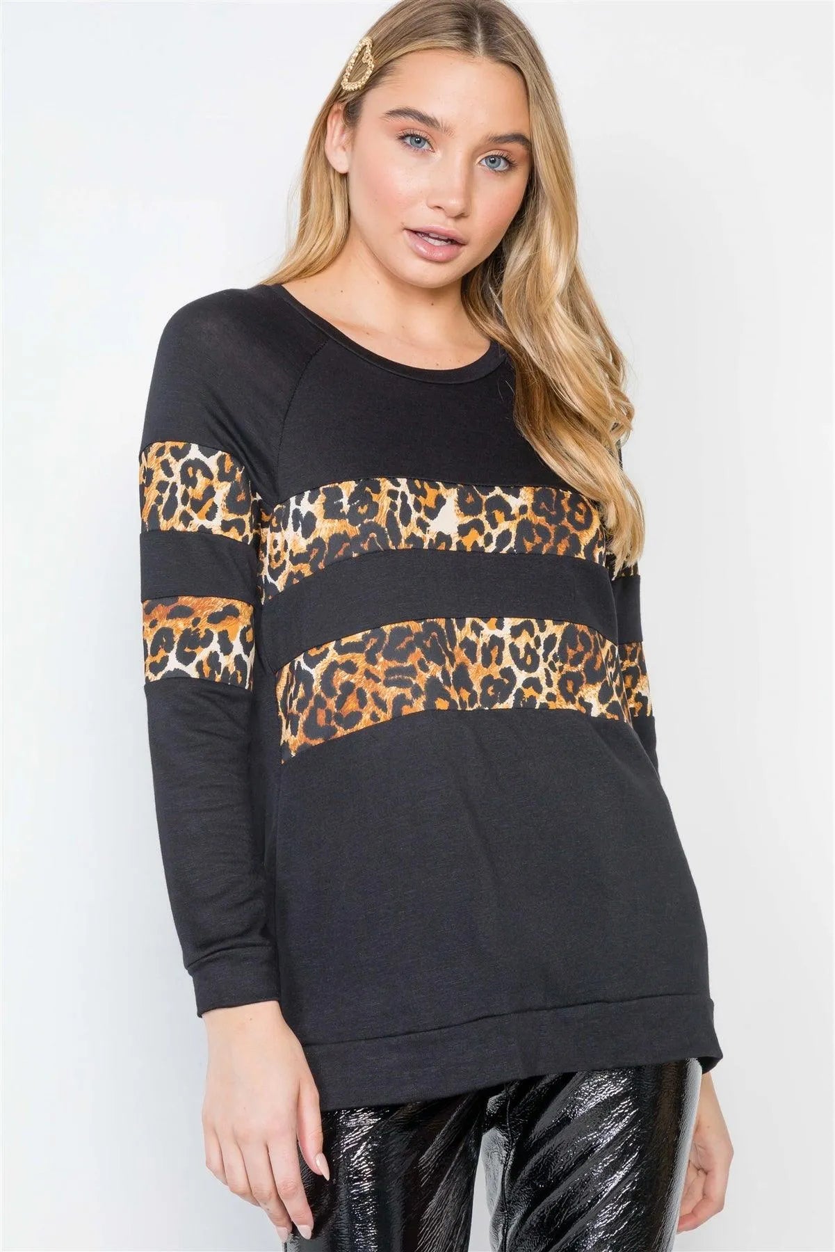 Black Stripe Animal Print Casual Knit Sweater /2-2-2