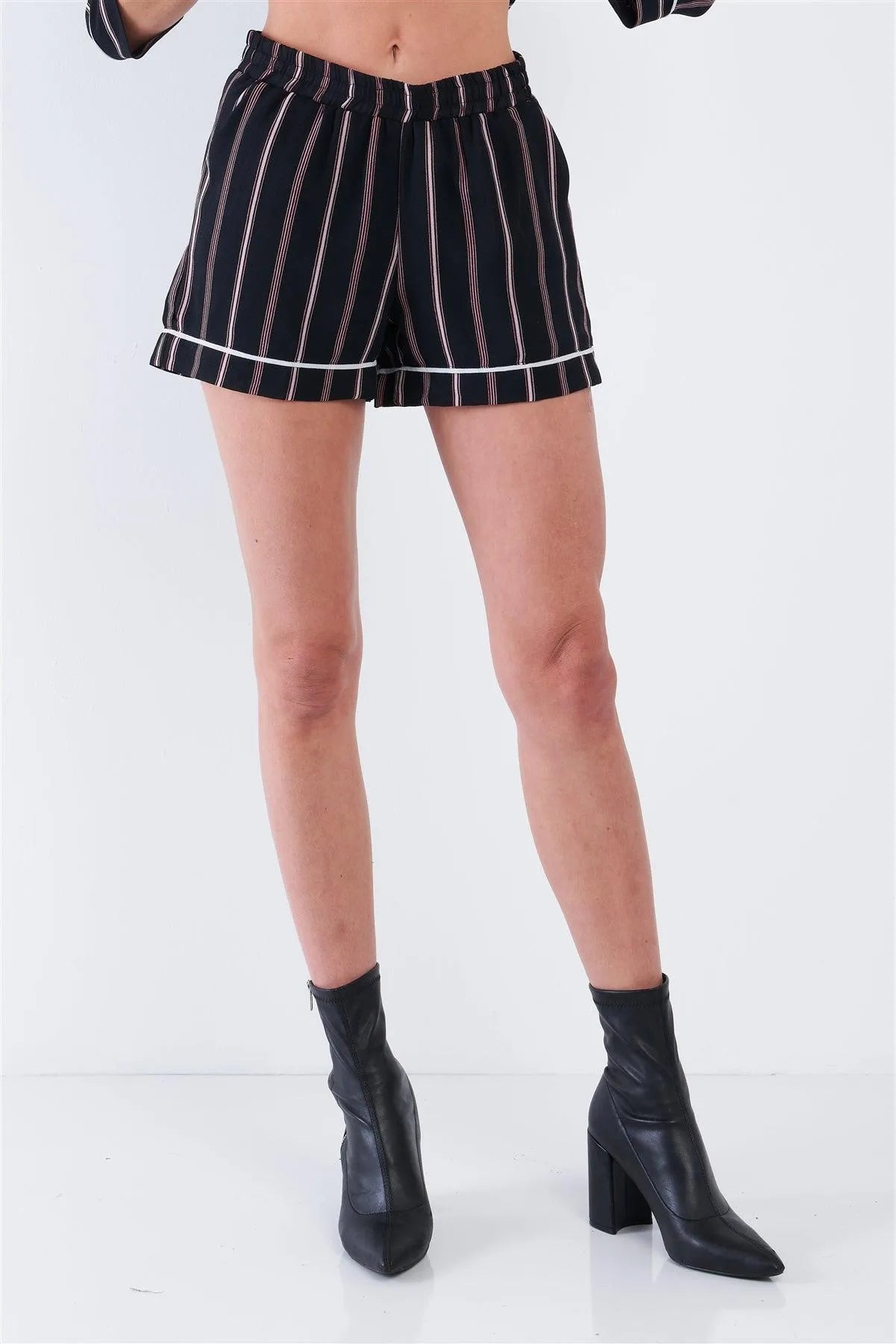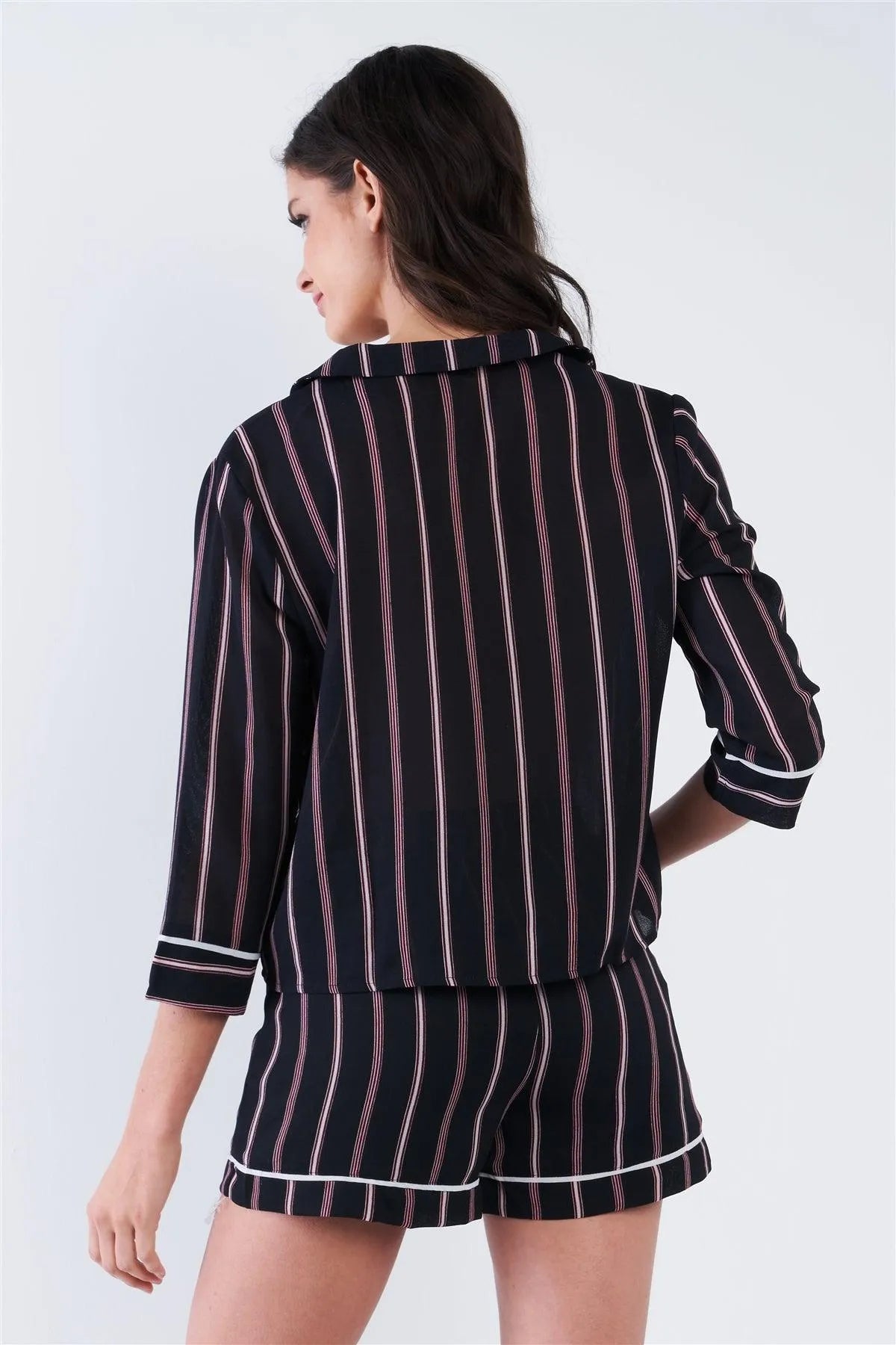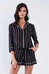 Black Stripe Chiffon Long Sleeve Button Top & Shorts Loungewear Set /2-2-2