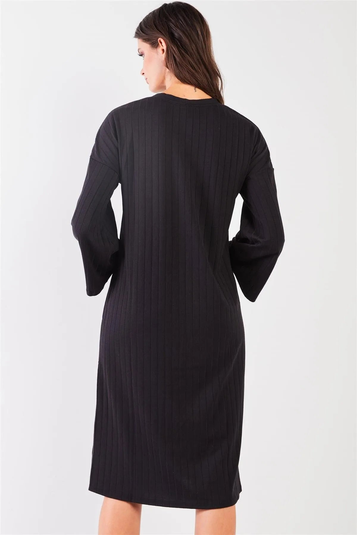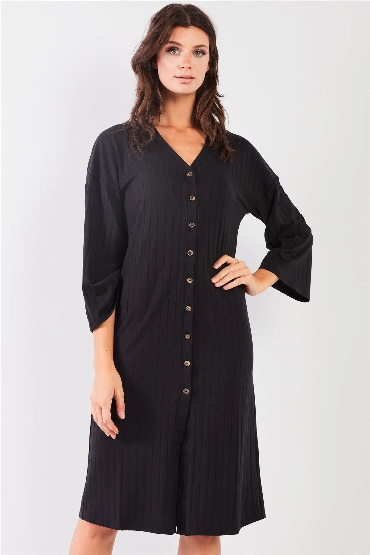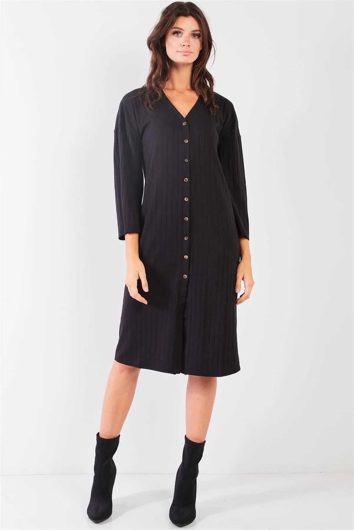 Black Striped Ribbed V-Neck 3/4 Sleeve Button-Down Straight Fit Relaxed Midi Dress /1-3-2