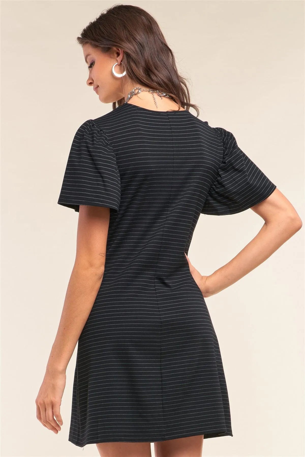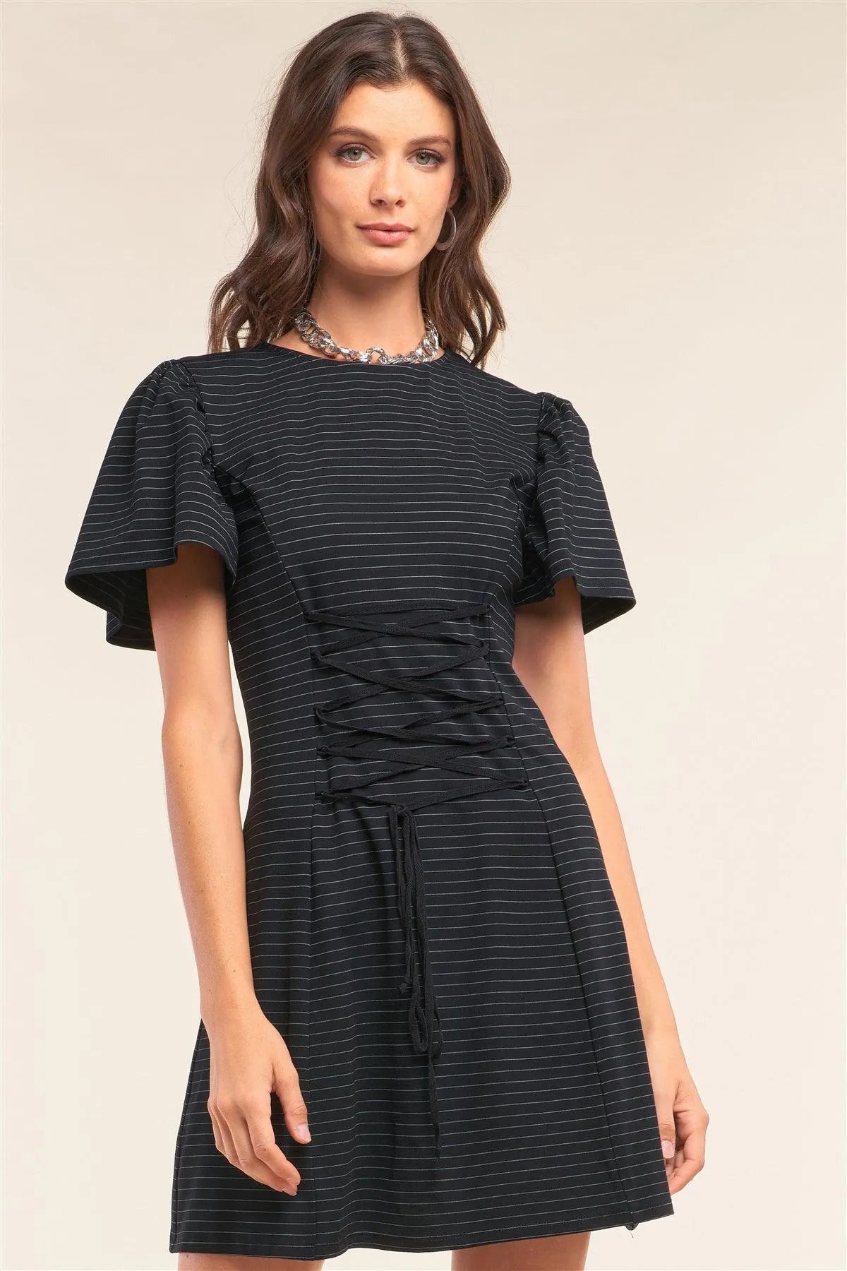 Black Striped Flare Short Sleeve Crew Neck Criss-Cross Lace-Up Detail Fitted Mini Dress /1-2-2-1