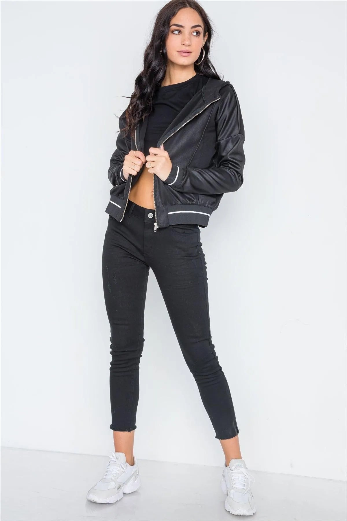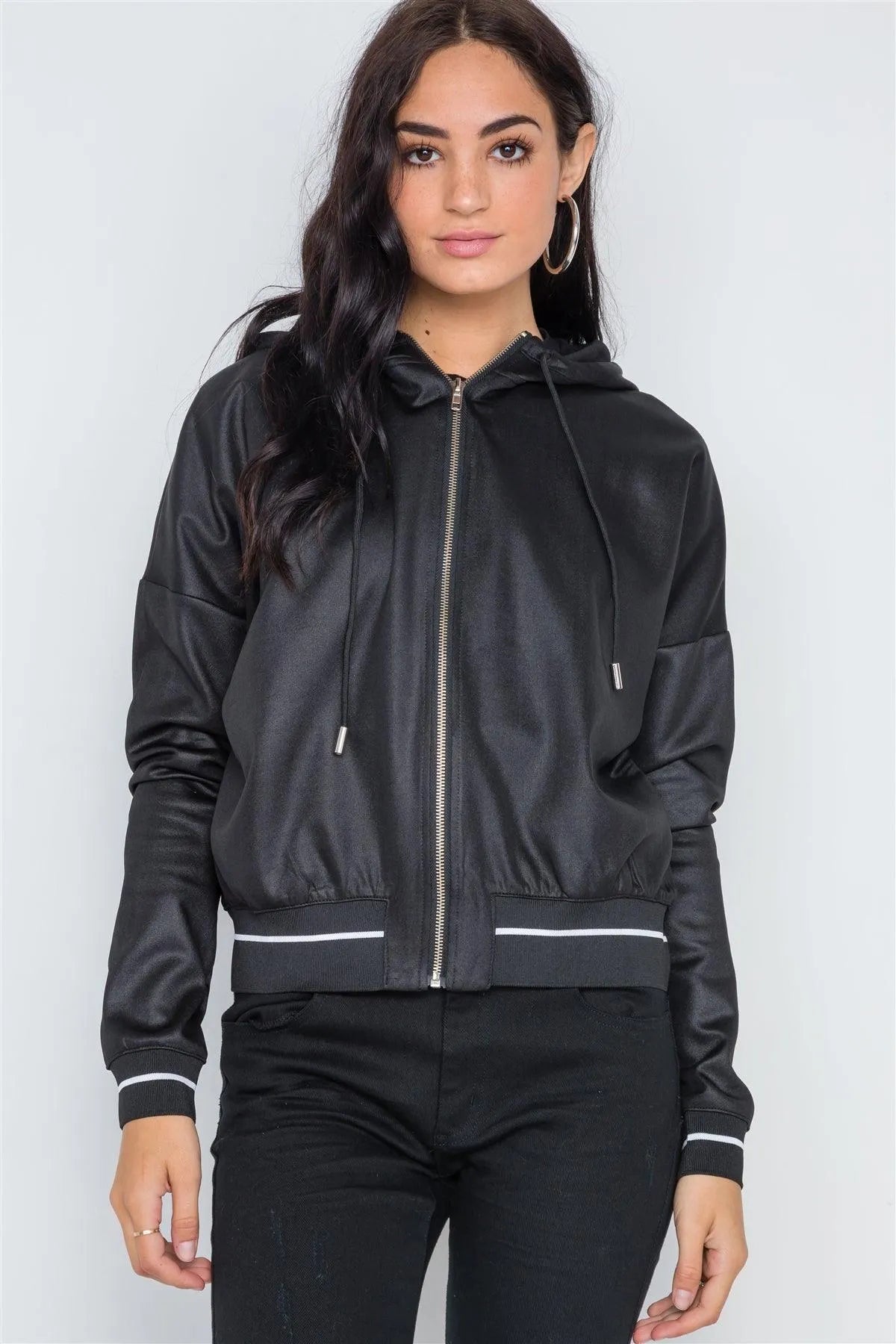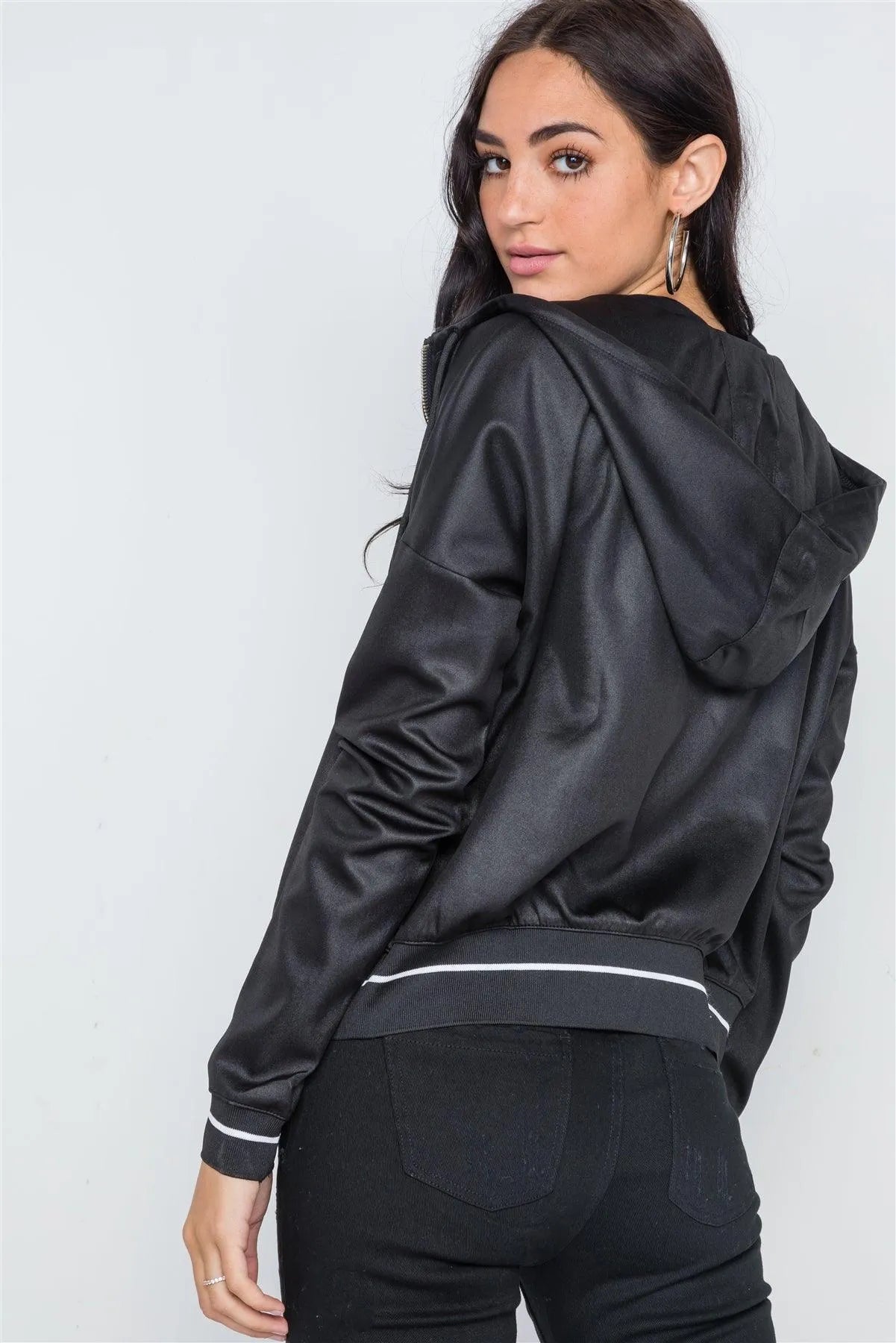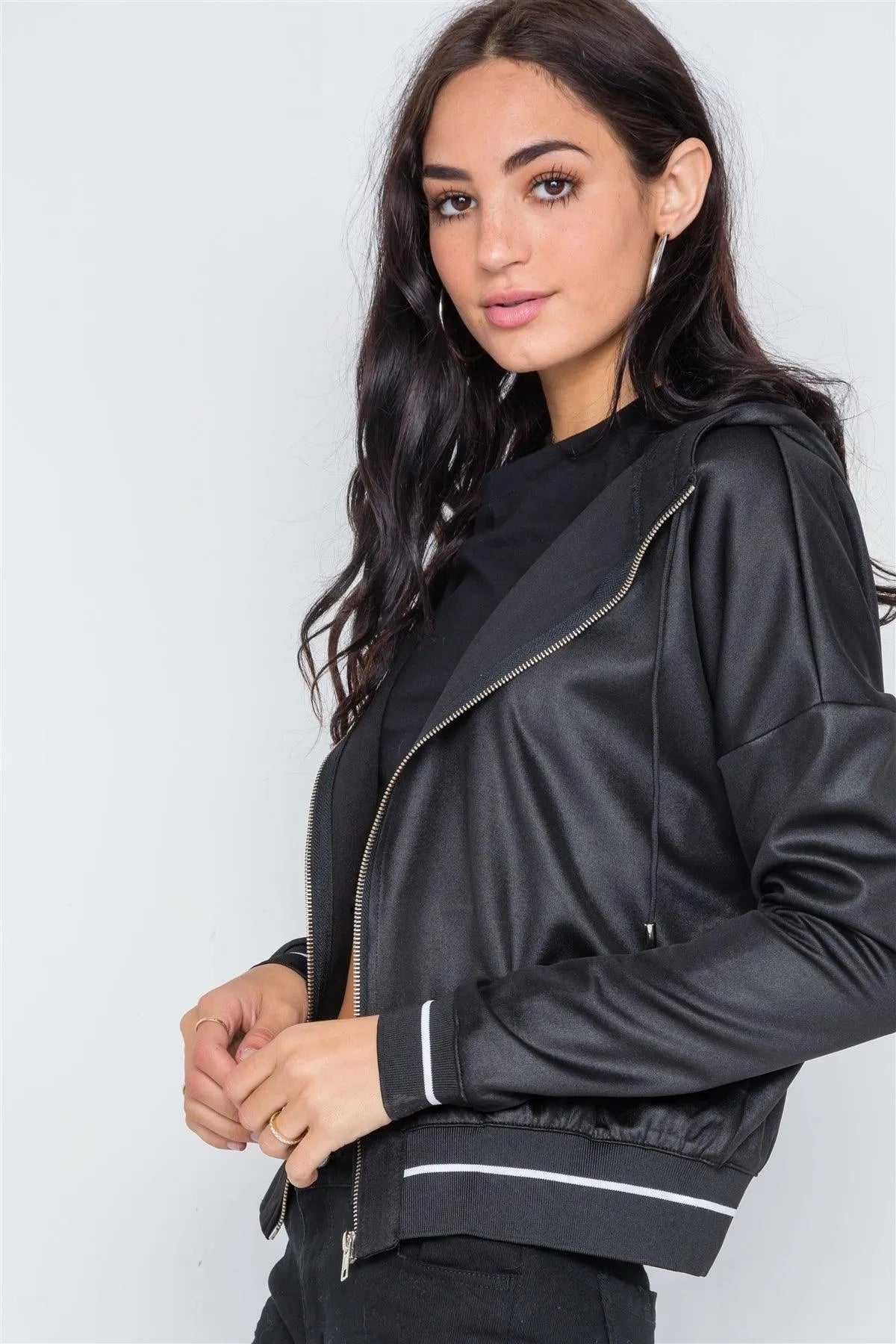Black Striped Trim Hooded Long Sleeve Jacket /3-2