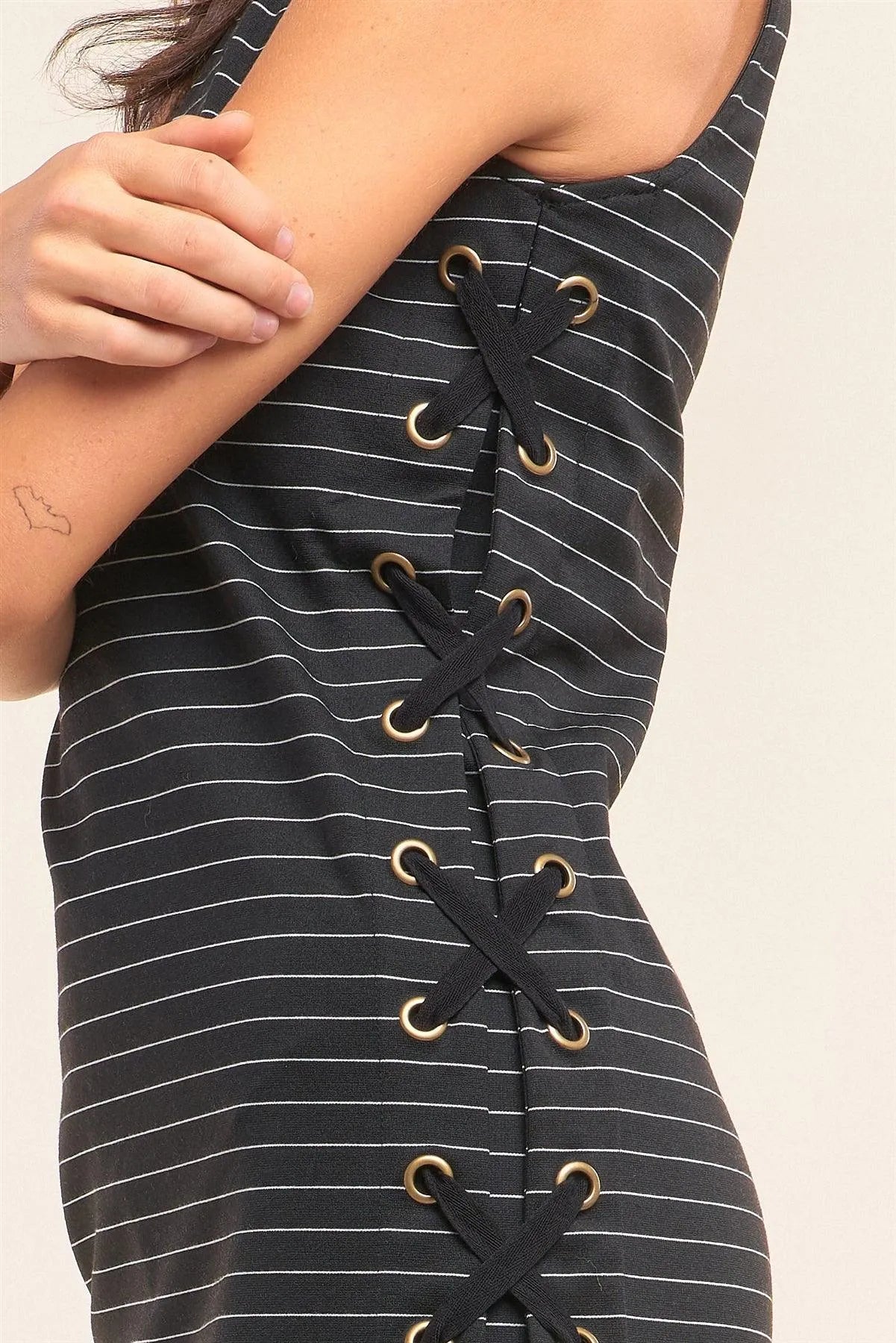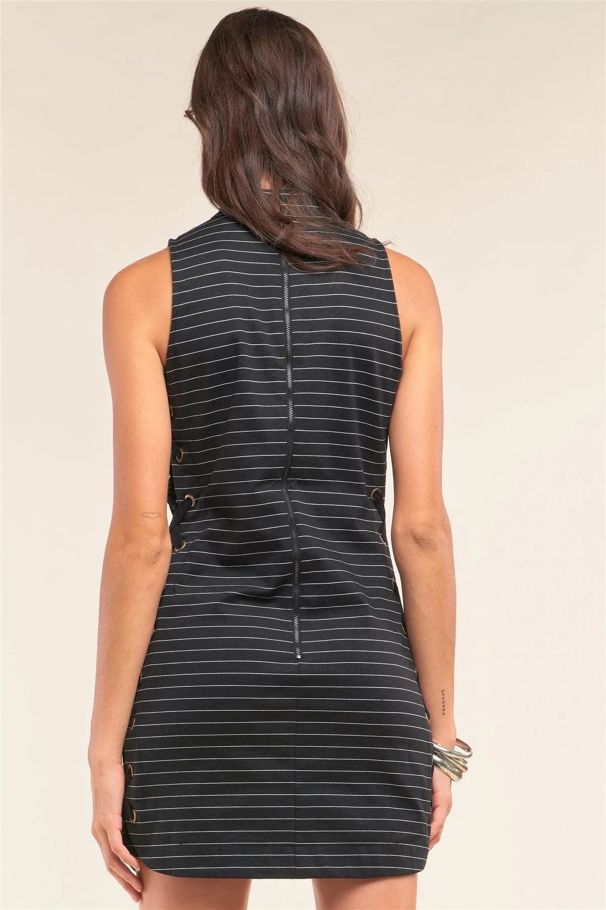 Black Striped Sleeveless Turtleneck Tight Fit Criss-Cross Lace-Up Detail Mini Dress /1-2-3-1