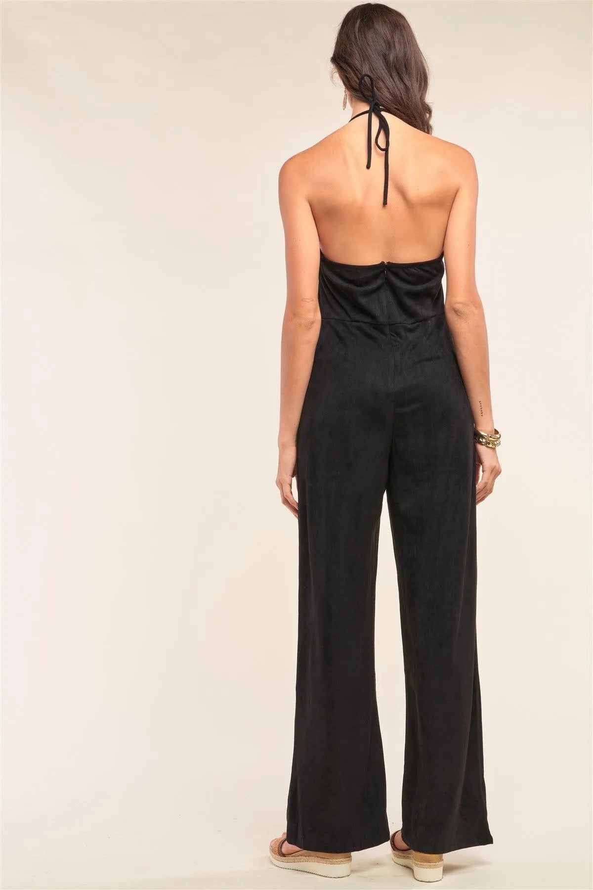 Black Suede Eyelet Embroidered Trim Self-Tie Halter Neck Open Back Jumpsuit /1-2-2-1