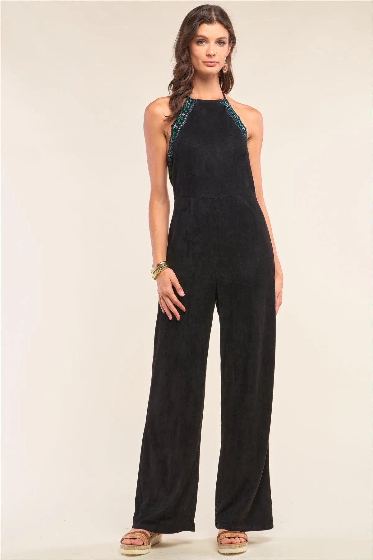 🖤 Item Features: Black, suede, multicolor eyelet embroidered chest trim, self-tie square halter neckline, open back, regular fit, back zipper closure, wide leg, stretchy, unlined, casual, sexy, comfy, stylish, trendy, fall/winter
