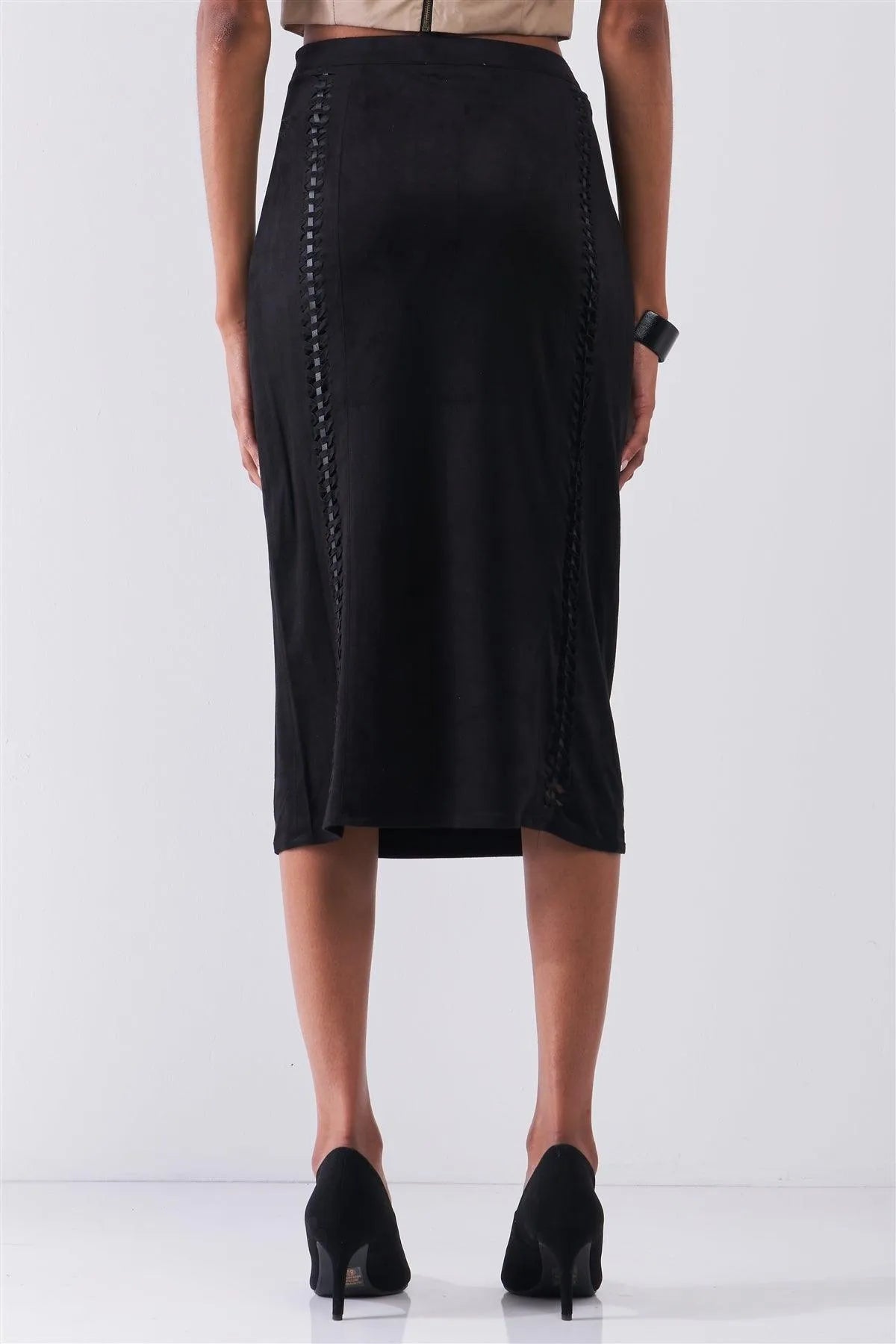 Black Suede High-Waist Side Trim Detail Pencil Fit Midi Skirt /1-2-2-1