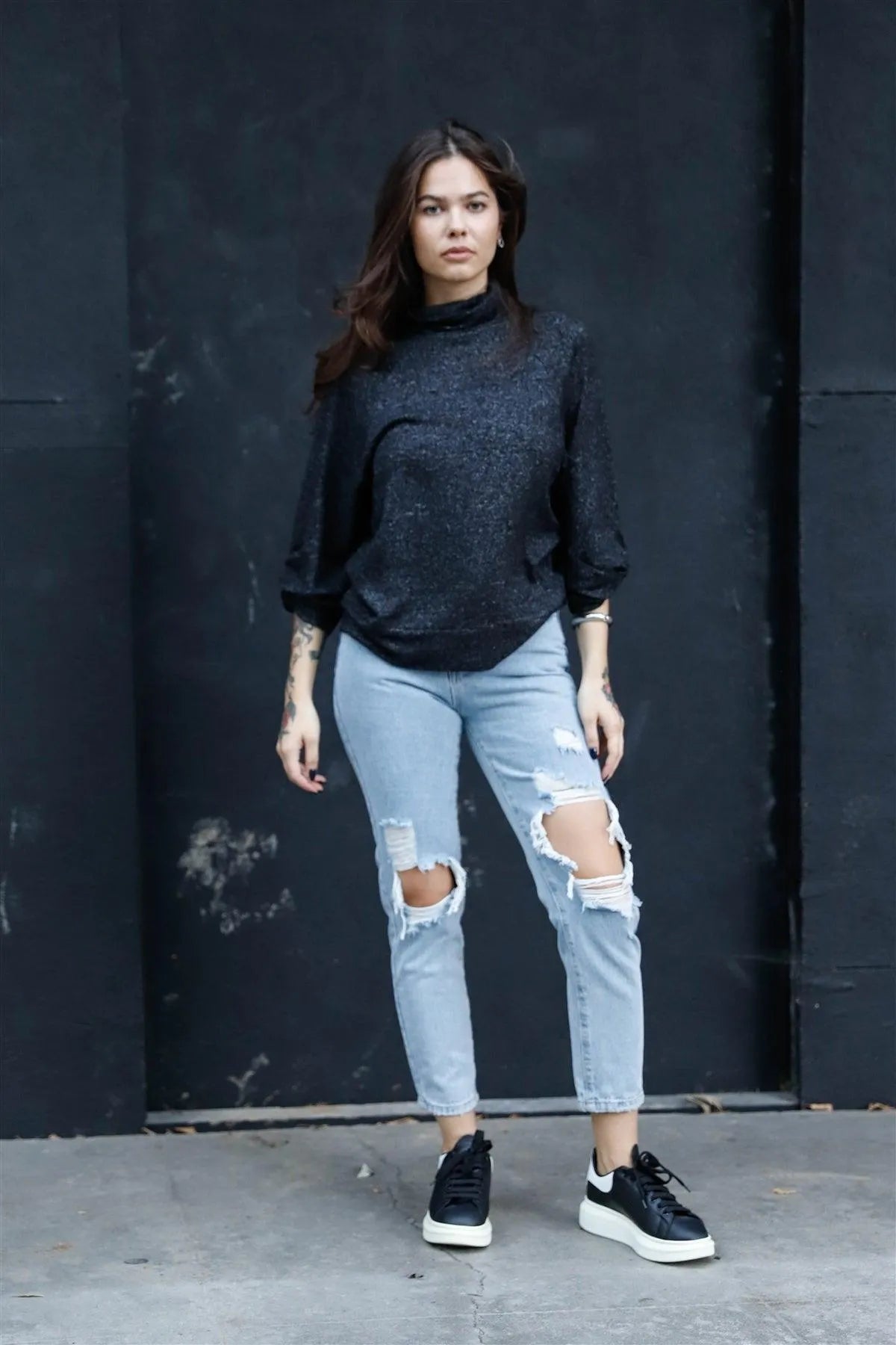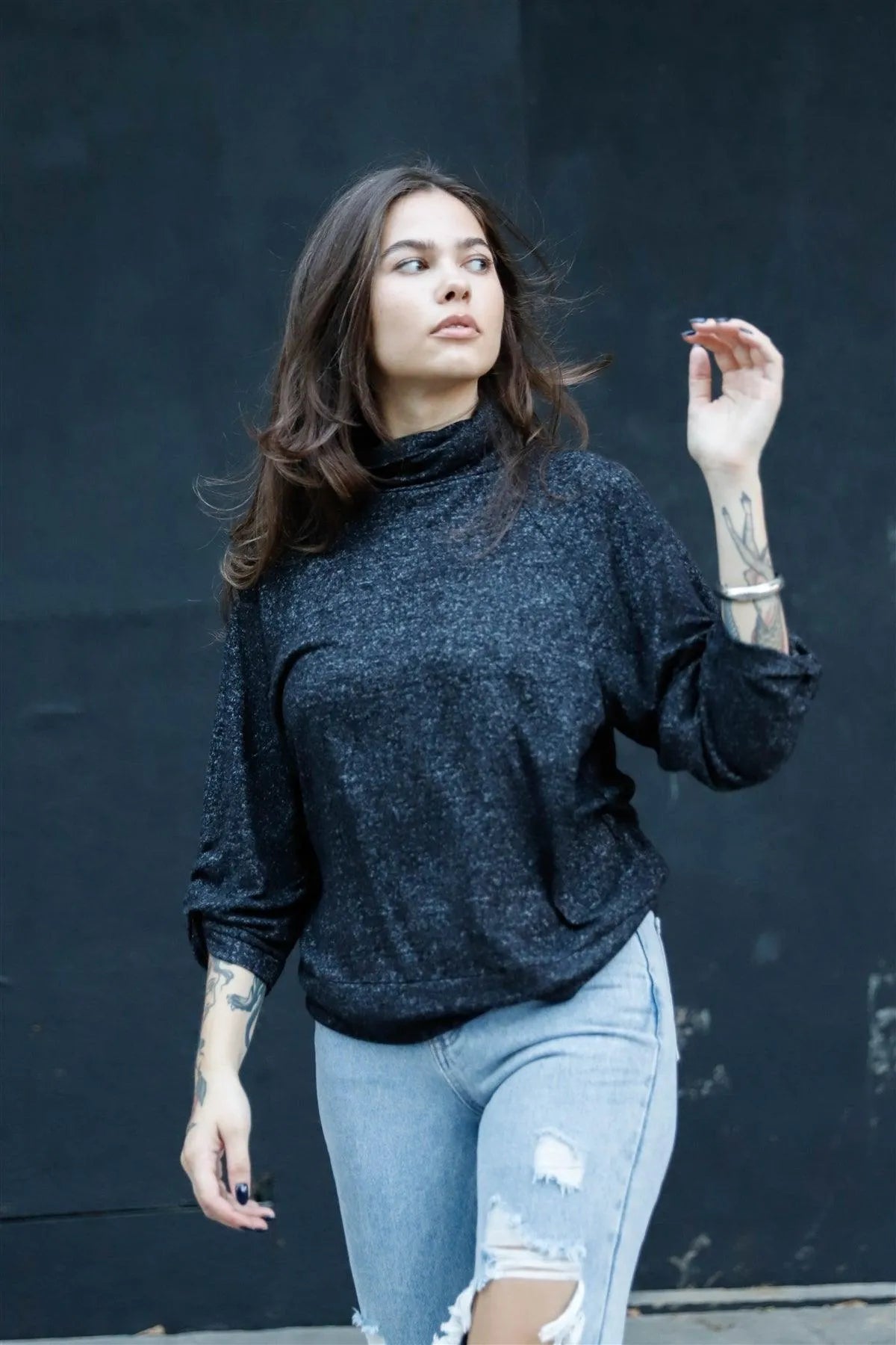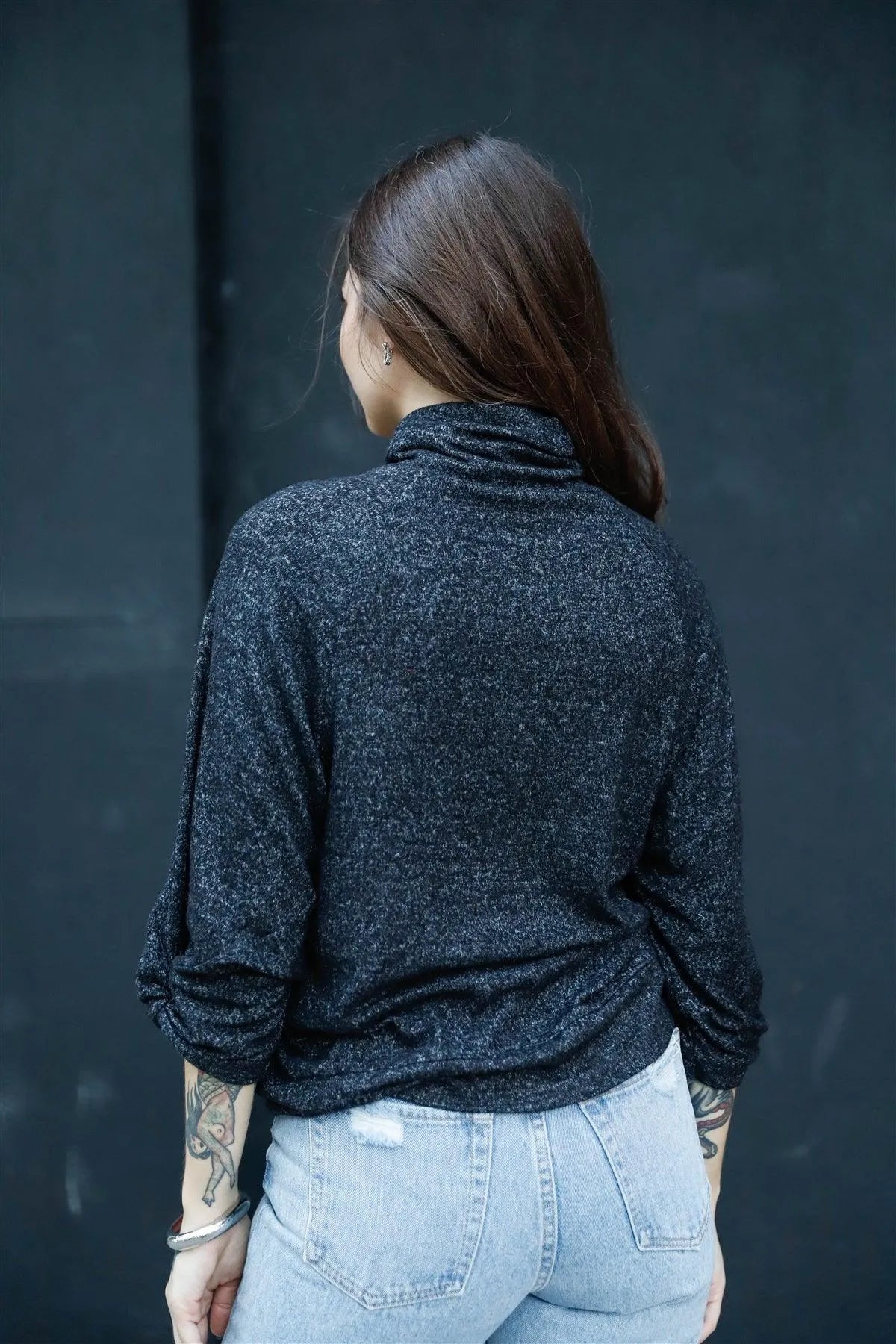 Black Turtleneck 3/4 Twisted Sleeve Detail Top /1-2-1