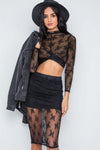 Two Piece Set features:Top features: fully sheer, long sleeves, Mock_neck, twisted front detailing, stretchy Skirt features: high waisted, midi length, elasticized waist, partly lined, stretchy Model is 5'9 and wearing Small (Waist: 24", Bust: 32A, Hips: 34")Item Measurements Top: Length: 13", Bust: 30", Sleeves: 22"Item Measurements Skirt: Length: 29", Waist: 26"True to size