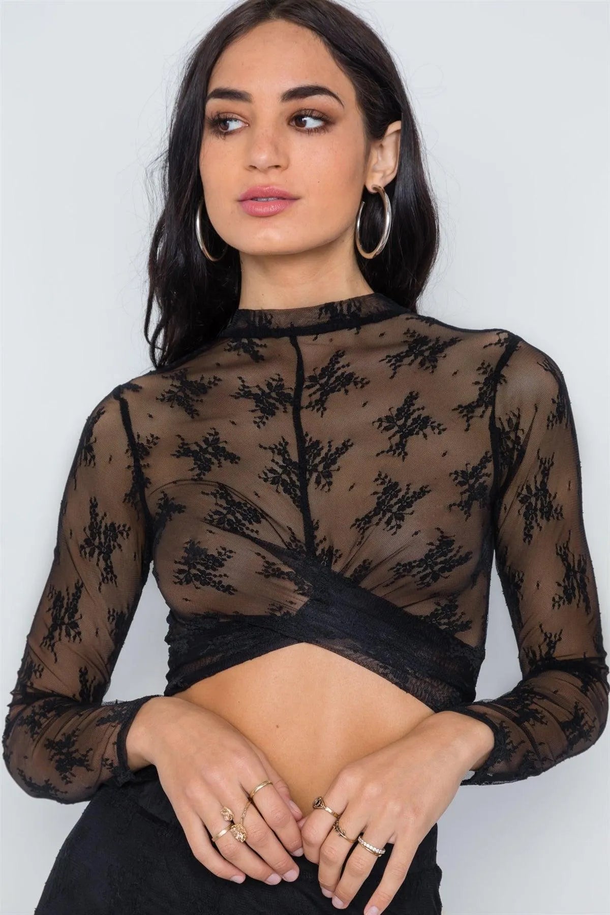Black Two Piece Floral Lace Crop Top Skirt Set /2-2-2