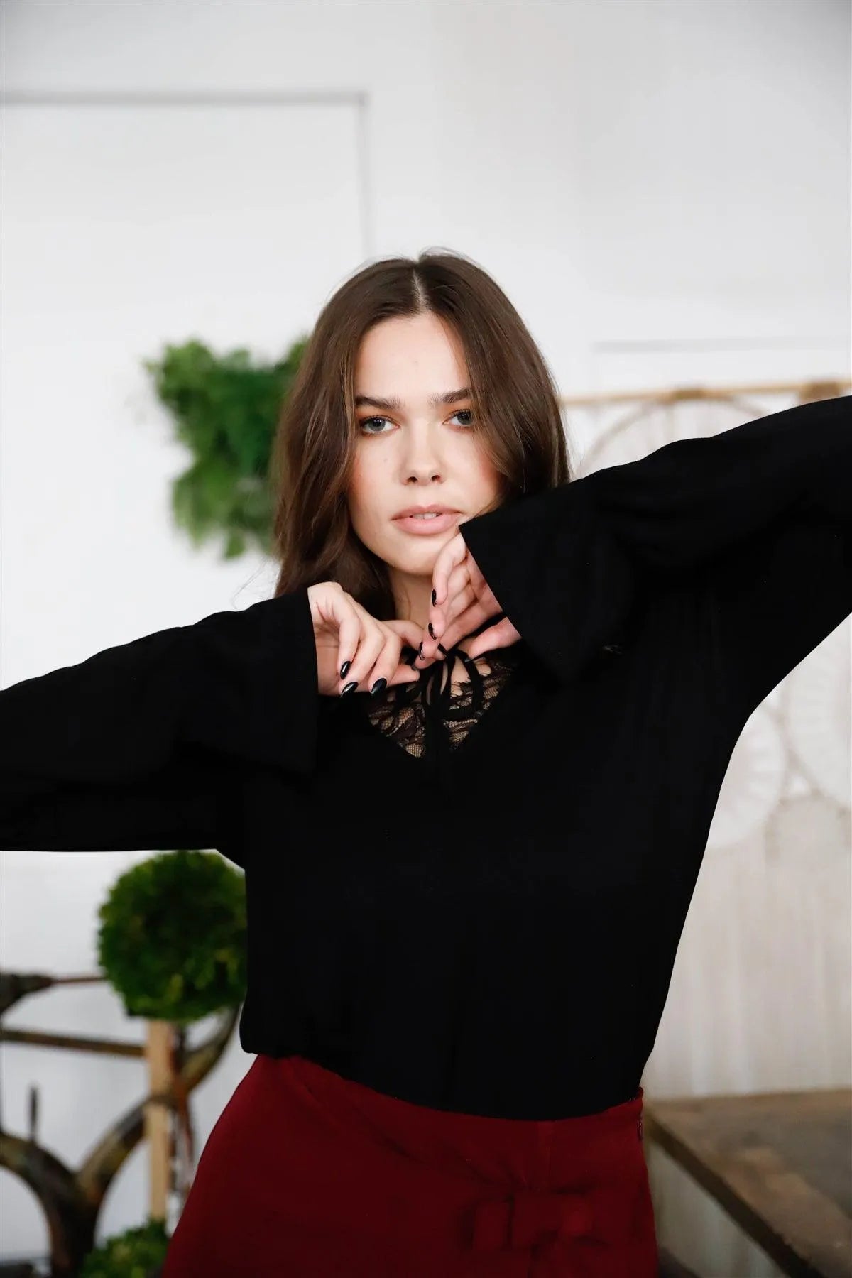 🖤 Item features: Black, solid color, v-neckline with lace trim, front self-tie detail, flounce long sleeves, relaxed fit, stretchy, unlined, relaxed fit, casual, chic, elegant, stylish, trendy, soft to touch