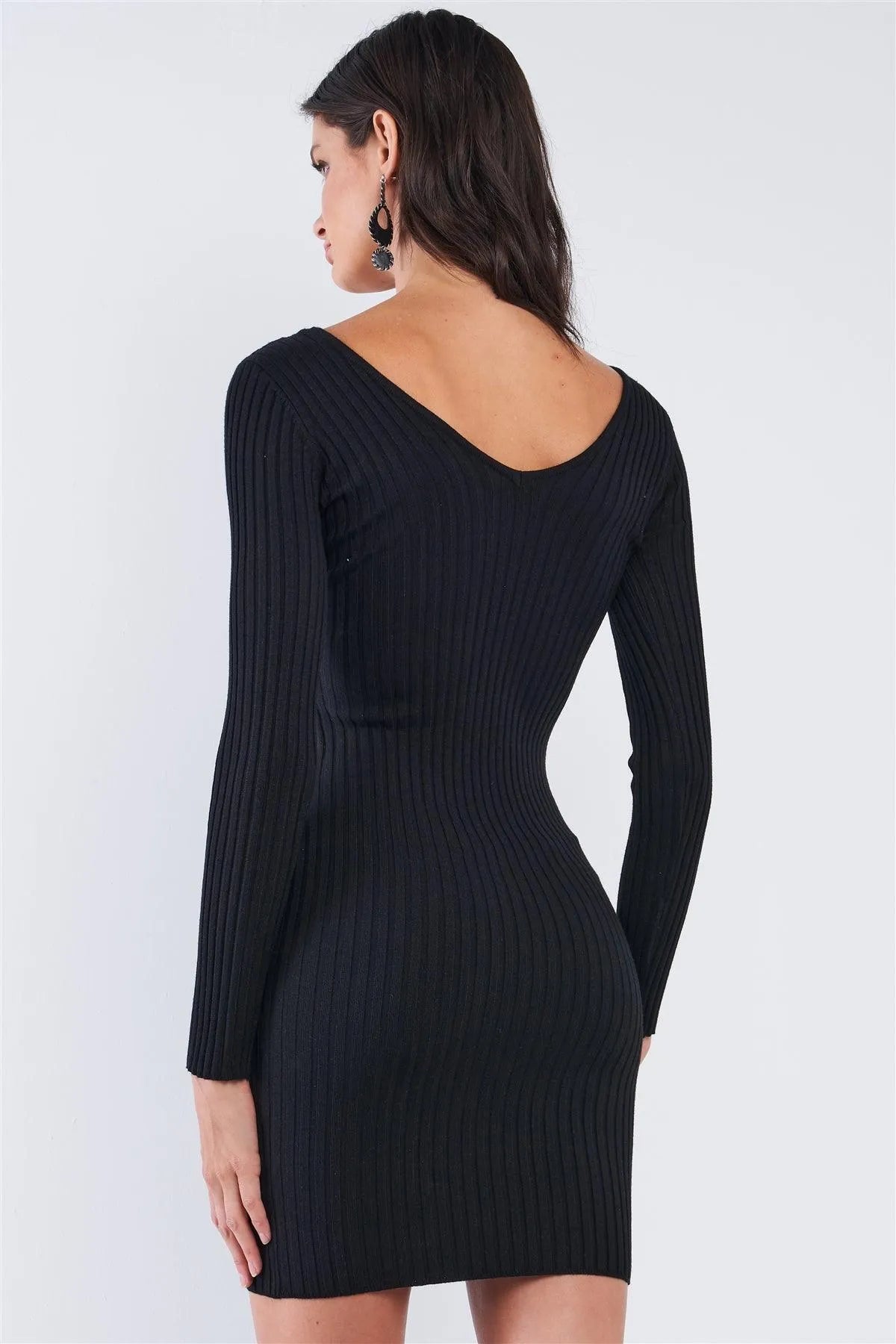 Black V-Neck Long Sleeve Ribbed Knit Sweater Mini Dress /3-3