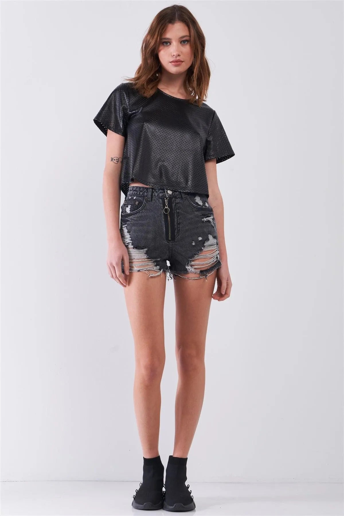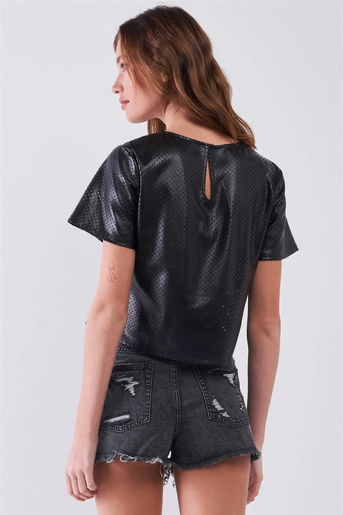 Black Vegan Leather Laser Cut Round Neck Wide Short Sleeve Cropped Top /2-1-2-1