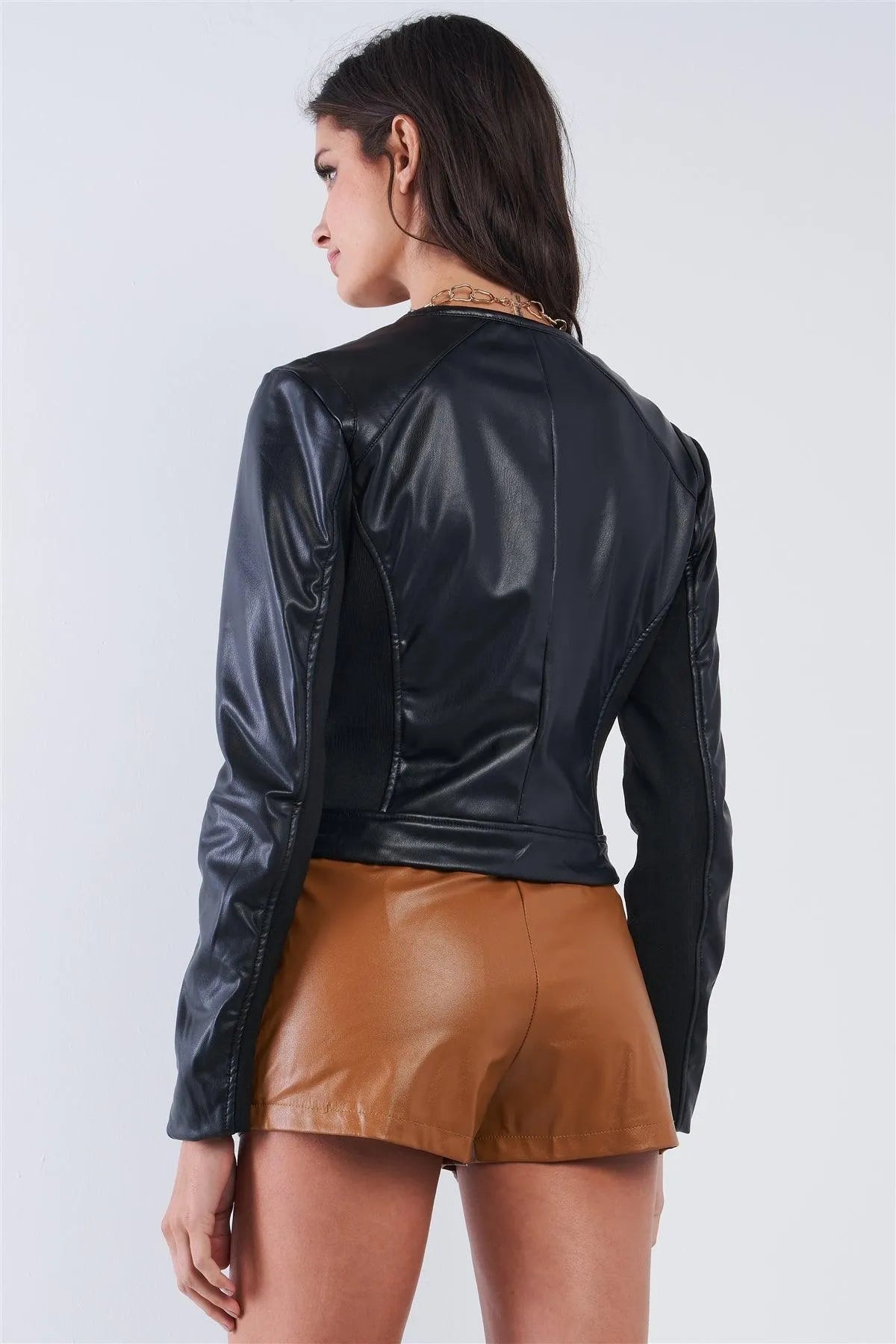 🖤 Item features: Black, vegan leather, crew neckline, long sleeve, cropped length, front zipper closure, subtle shoulder pad, two side pockets, lined, regular fit, night out, casual
