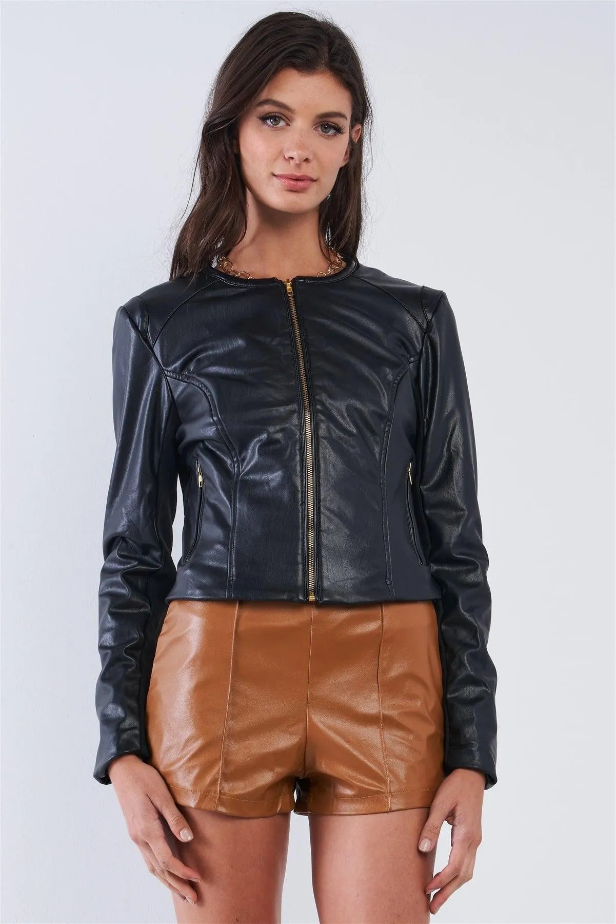 Simple Black Vegan Leather Crew Neck Centered Zipper Closure Jacket With Front Zipper Pockets /2-2-2