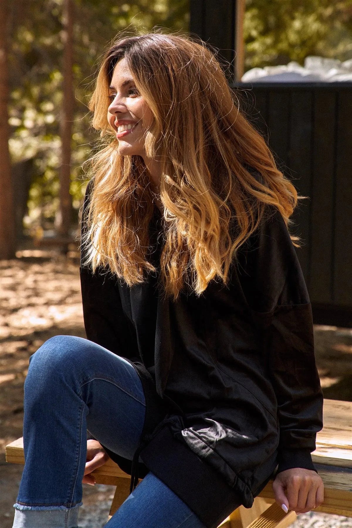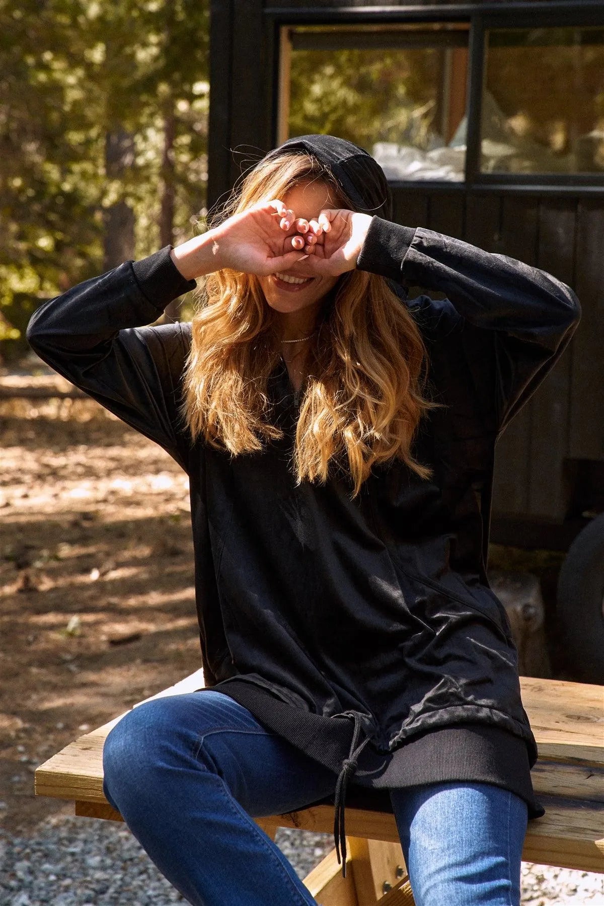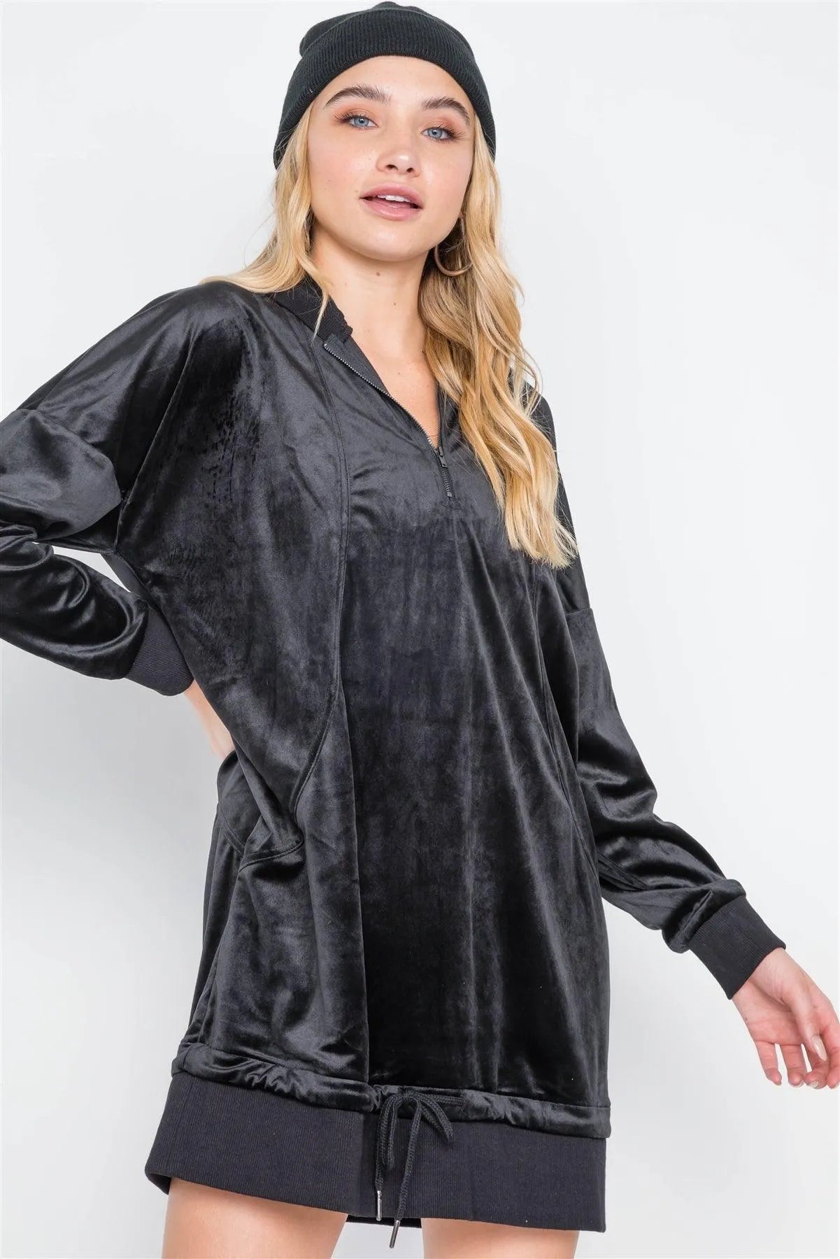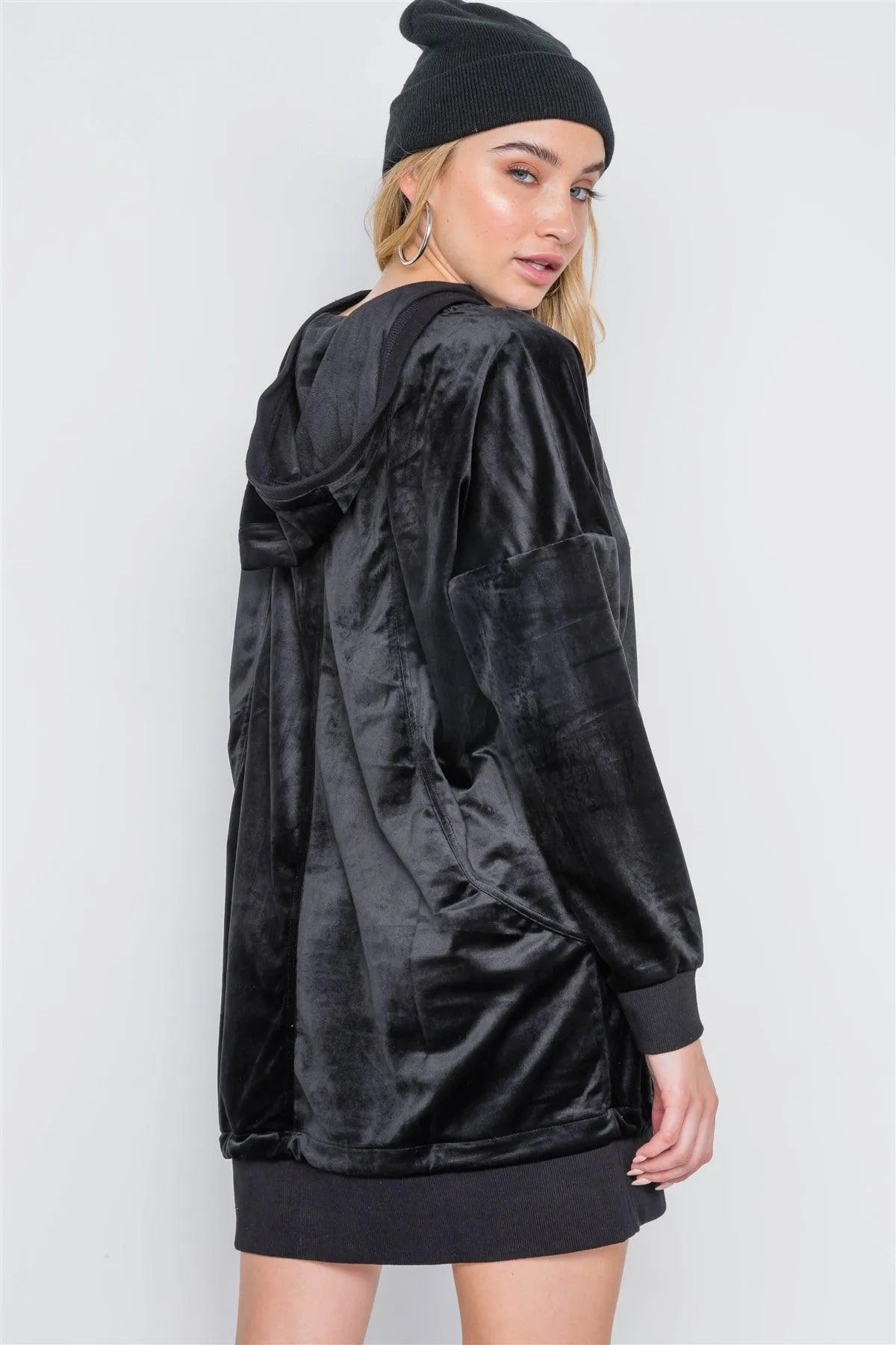 Black Velvet Long Sleeve Hooded Mini Shirt Dress /3-2-1