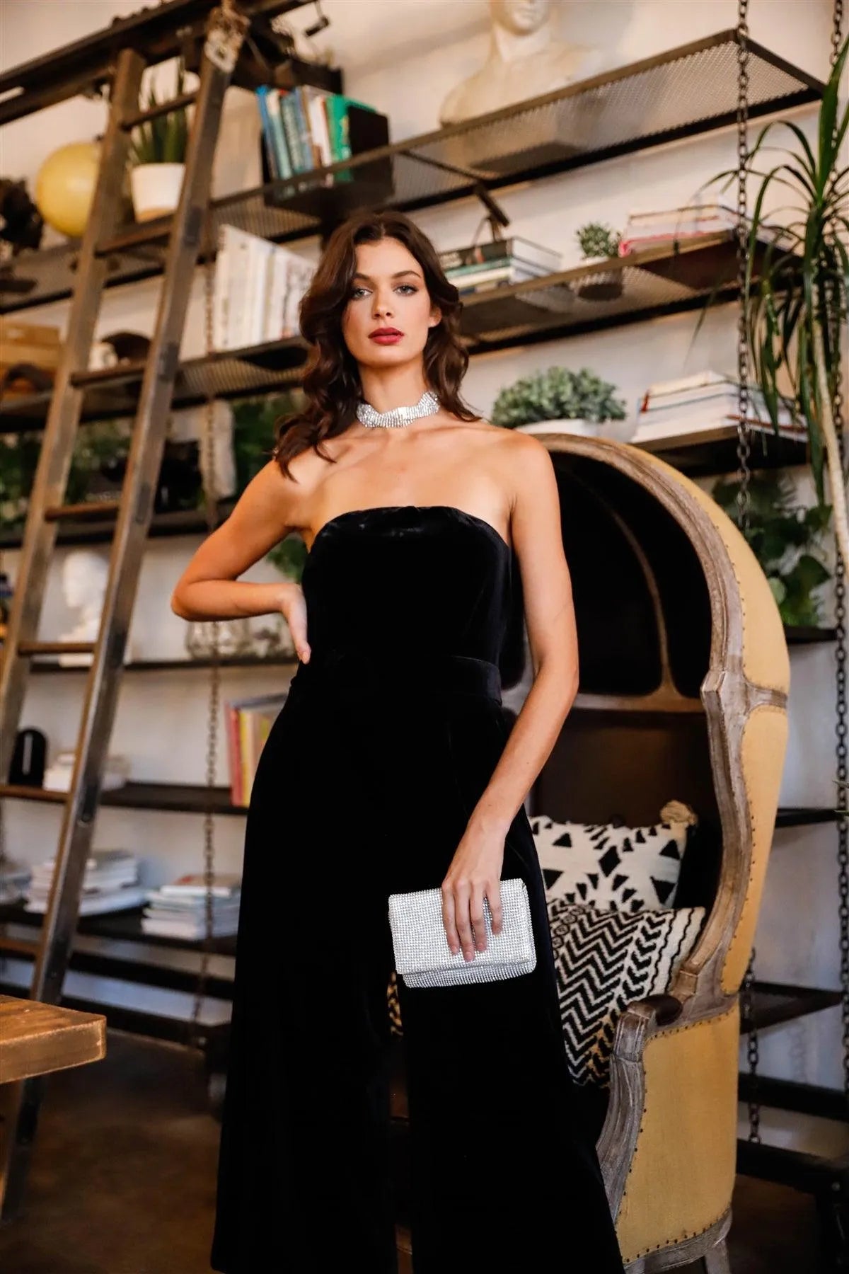 Black Velvet Off-The-Shoulder Front Buckle Belt Jumpsuit