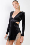 🖤 Item Features: Black, velvet, v-neckline, long sleeve, side cut-out, shoulder pad, side slits with rhinestone fringe trim, mini length, back hidden zipper and hook & eye closure, stretchy, lined, sexy, shiny, bossy, hot, elegant, night-out, clubwear, holiday look