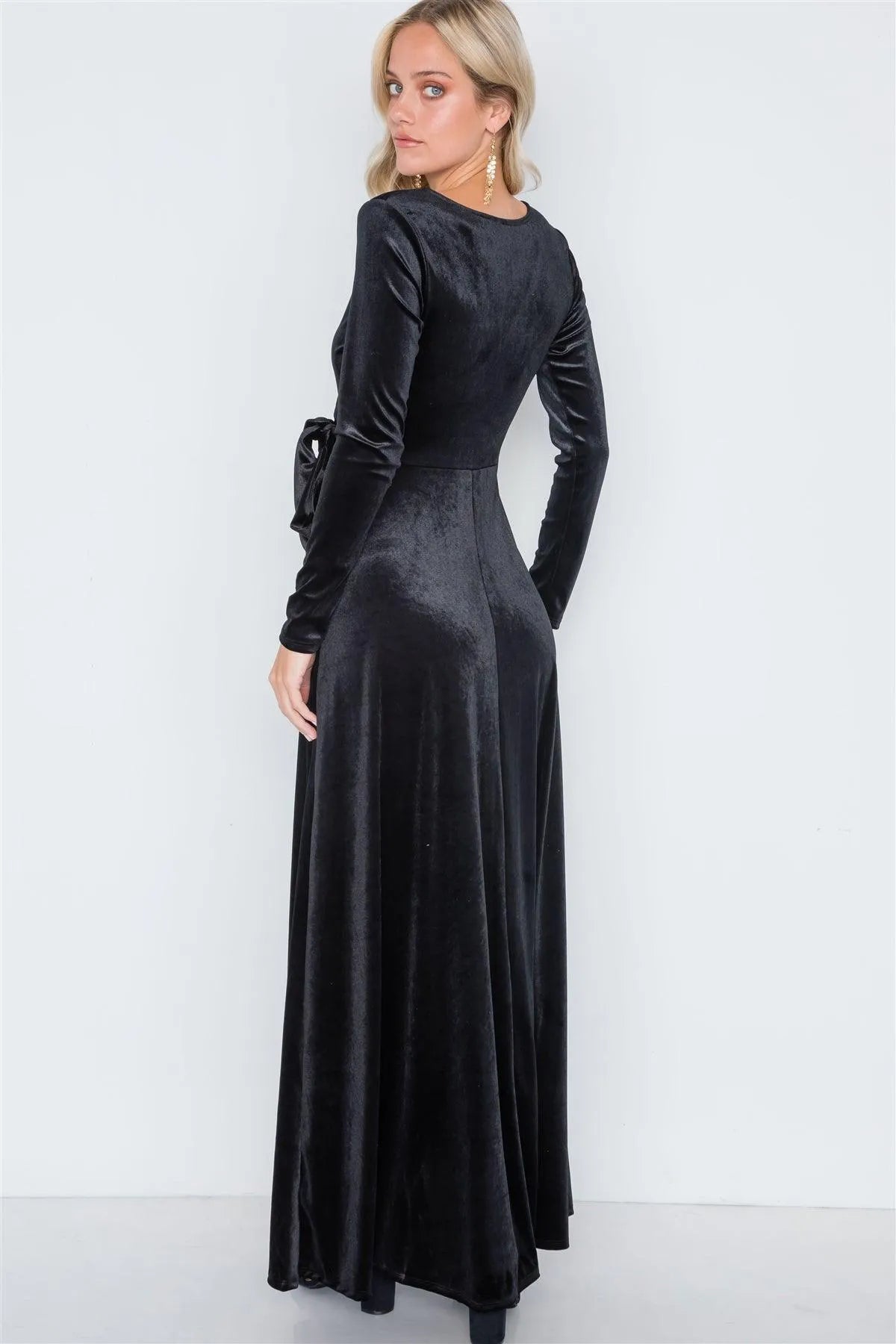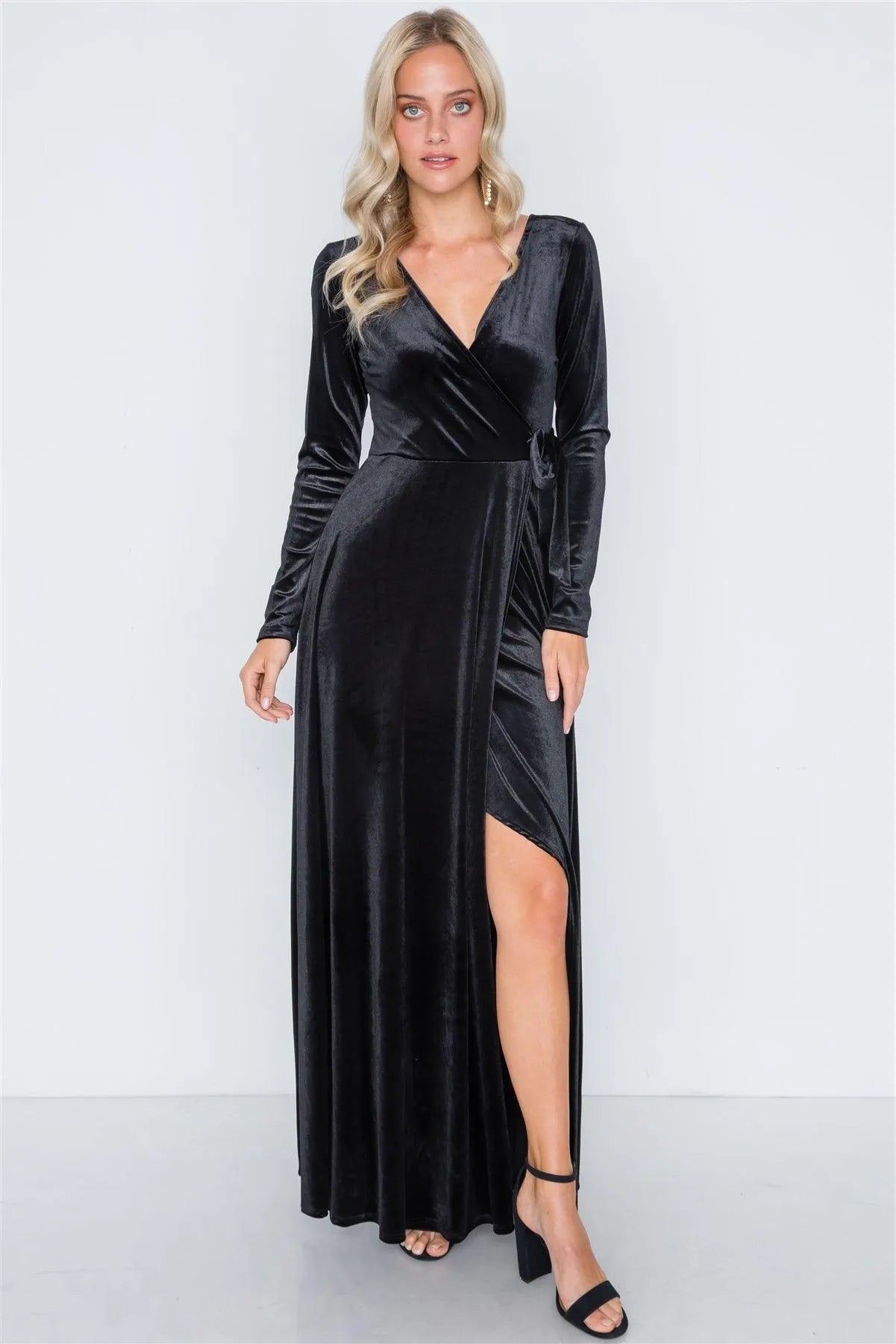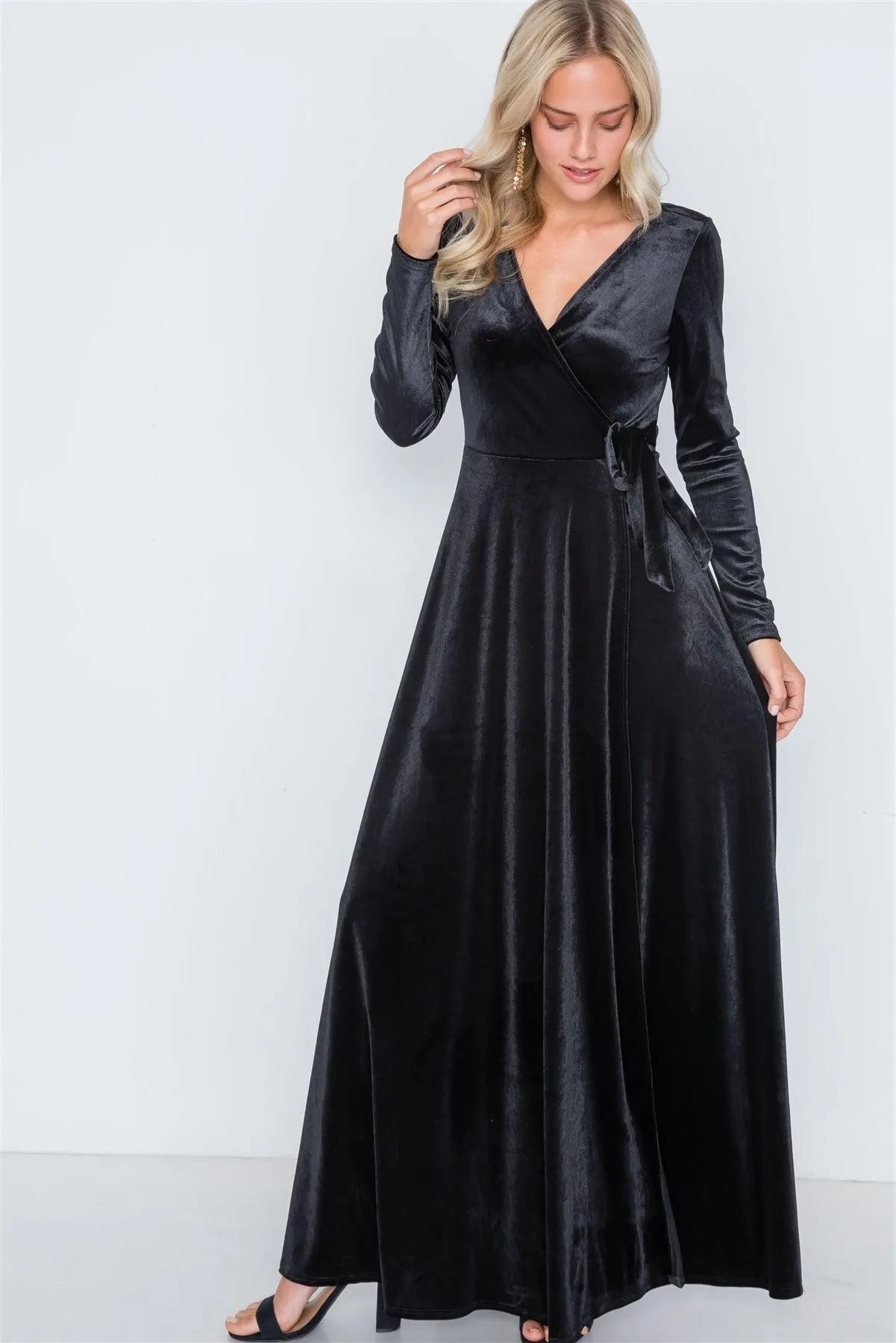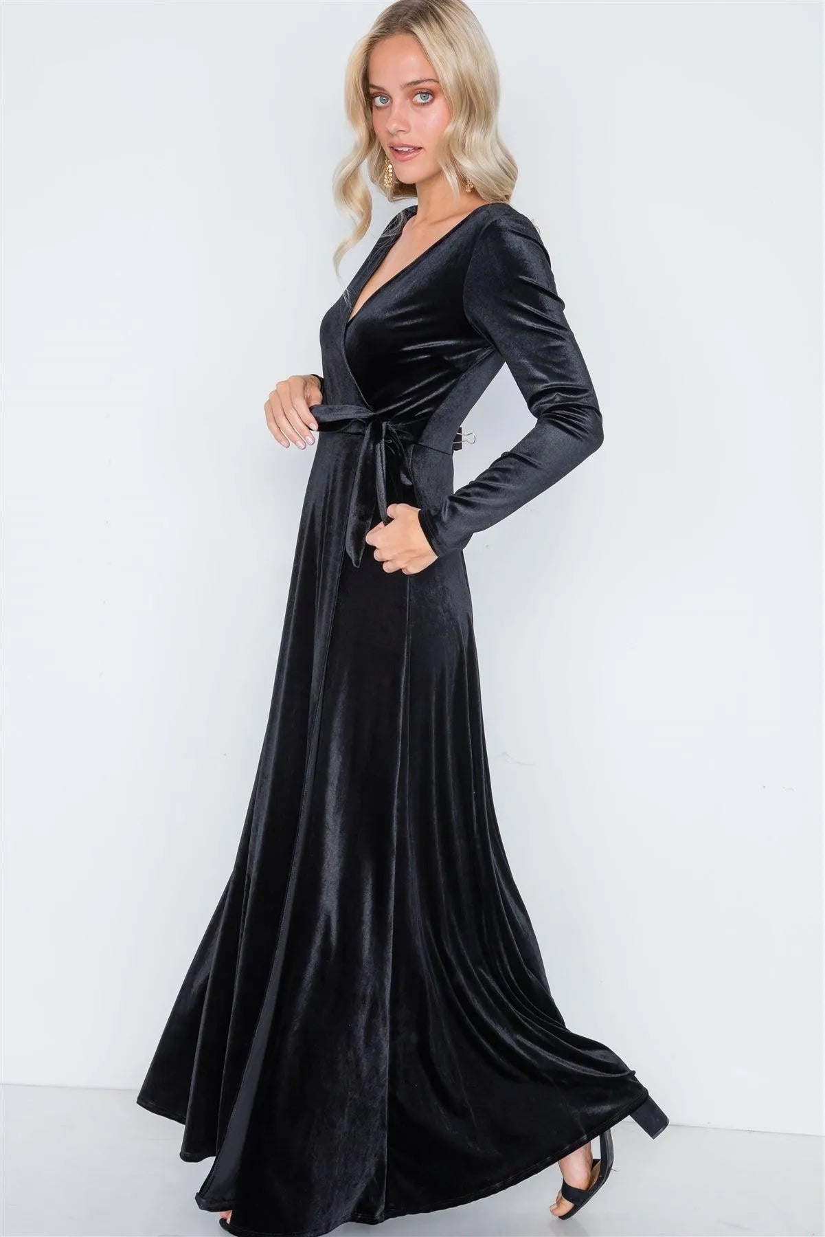 Black Velvet Surplice Neck Maxi Evening Dress /2-2-2
