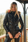 Black Vinyl Glossy Finish Fitted Faux Fur Hood Chevron Padded Puffer Jacket /1-1-1-1