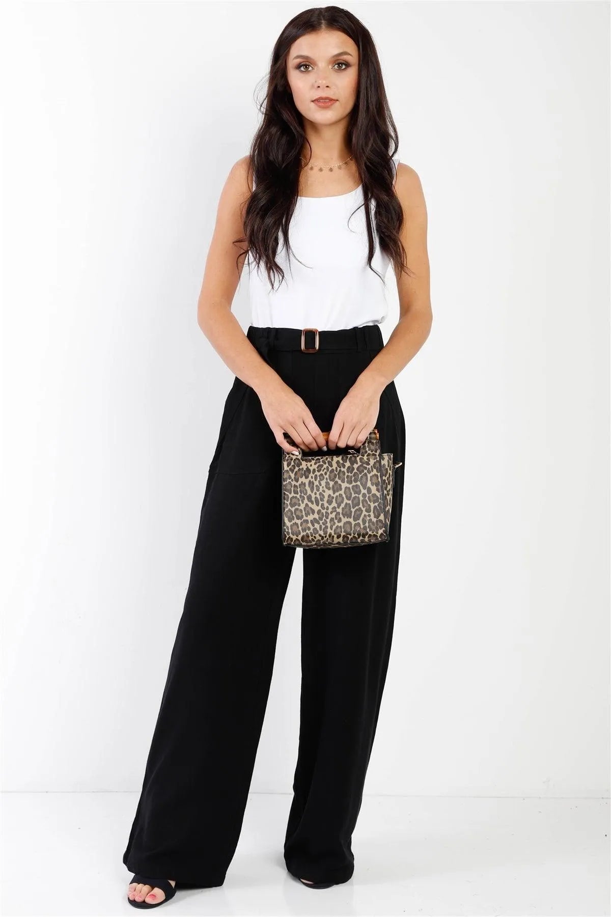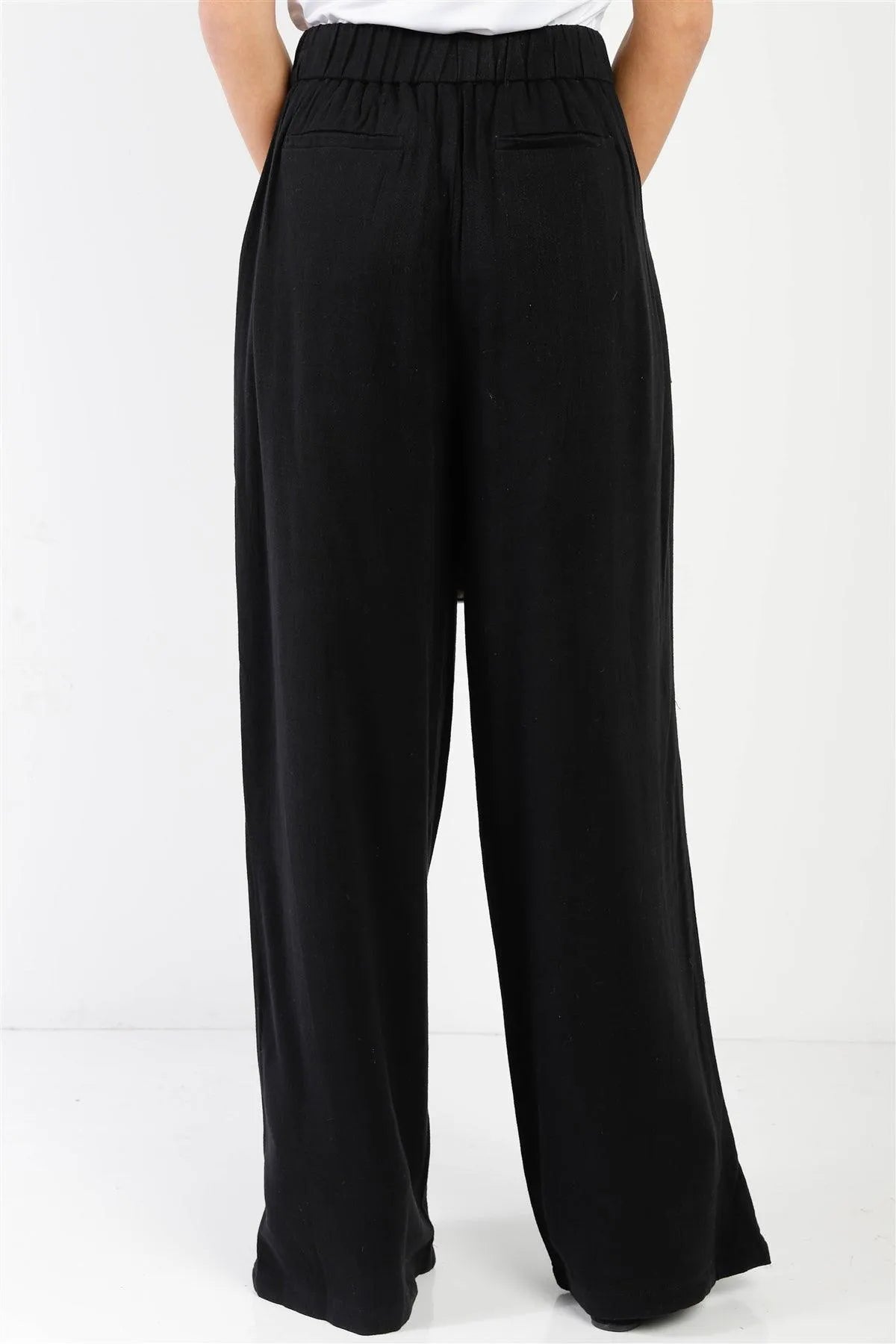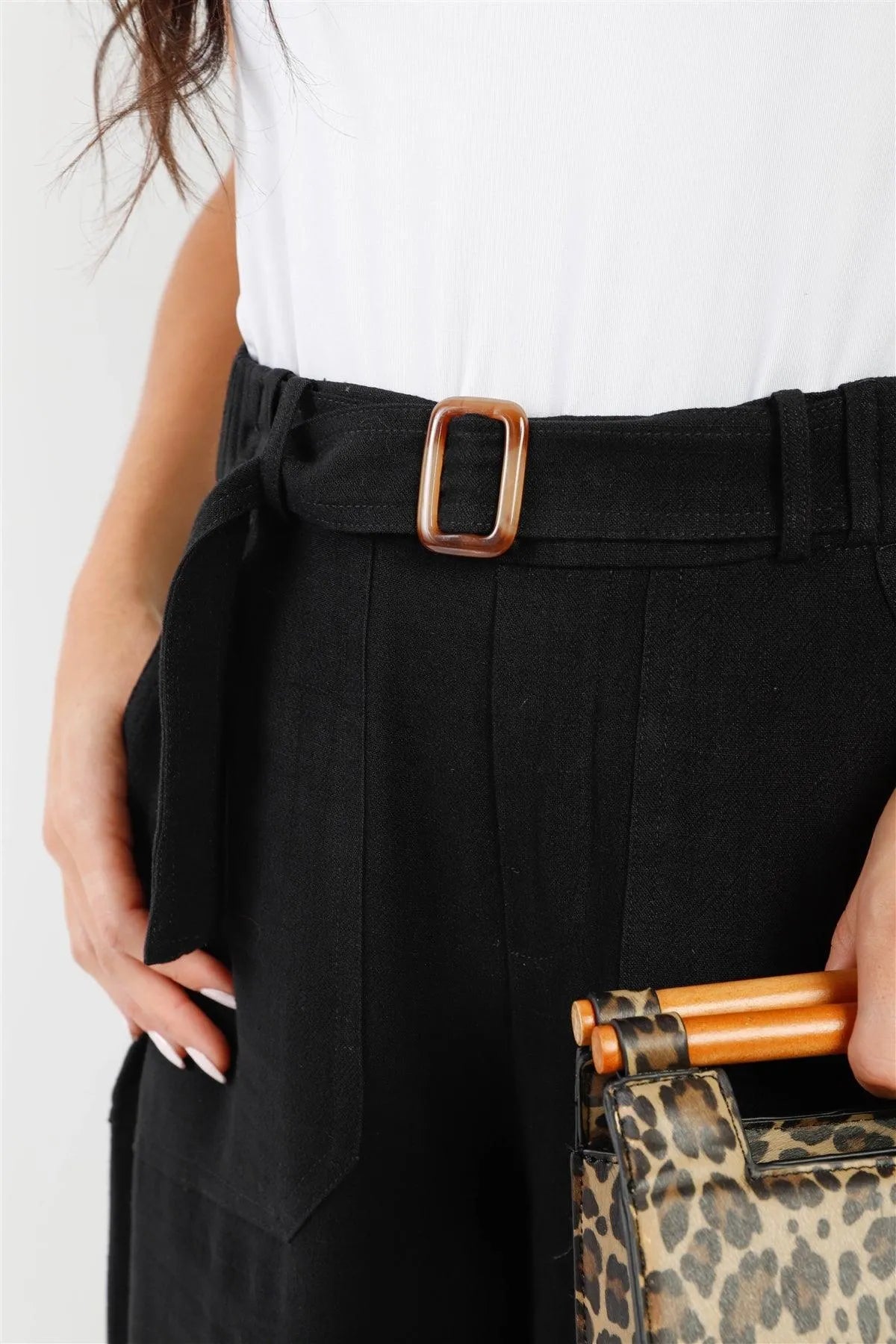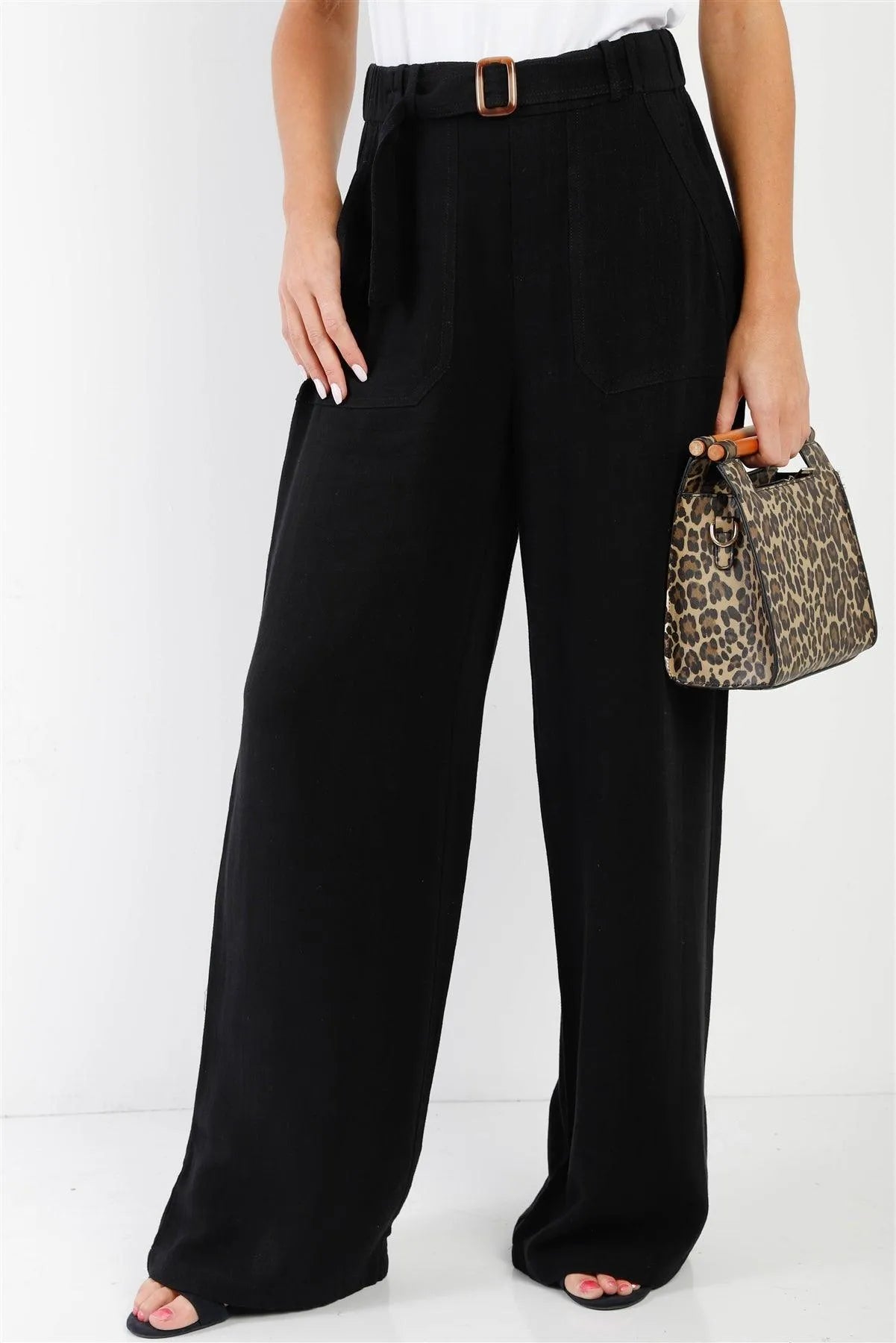 Black Viscose & Linen Blend Belted Wide Leg Pants /1-2-2-1