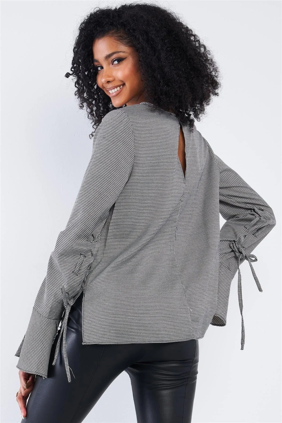 Black & White Mini Houndstooth Print Floral Embroidered Long Flutter Hem Sleeve Blouse Top