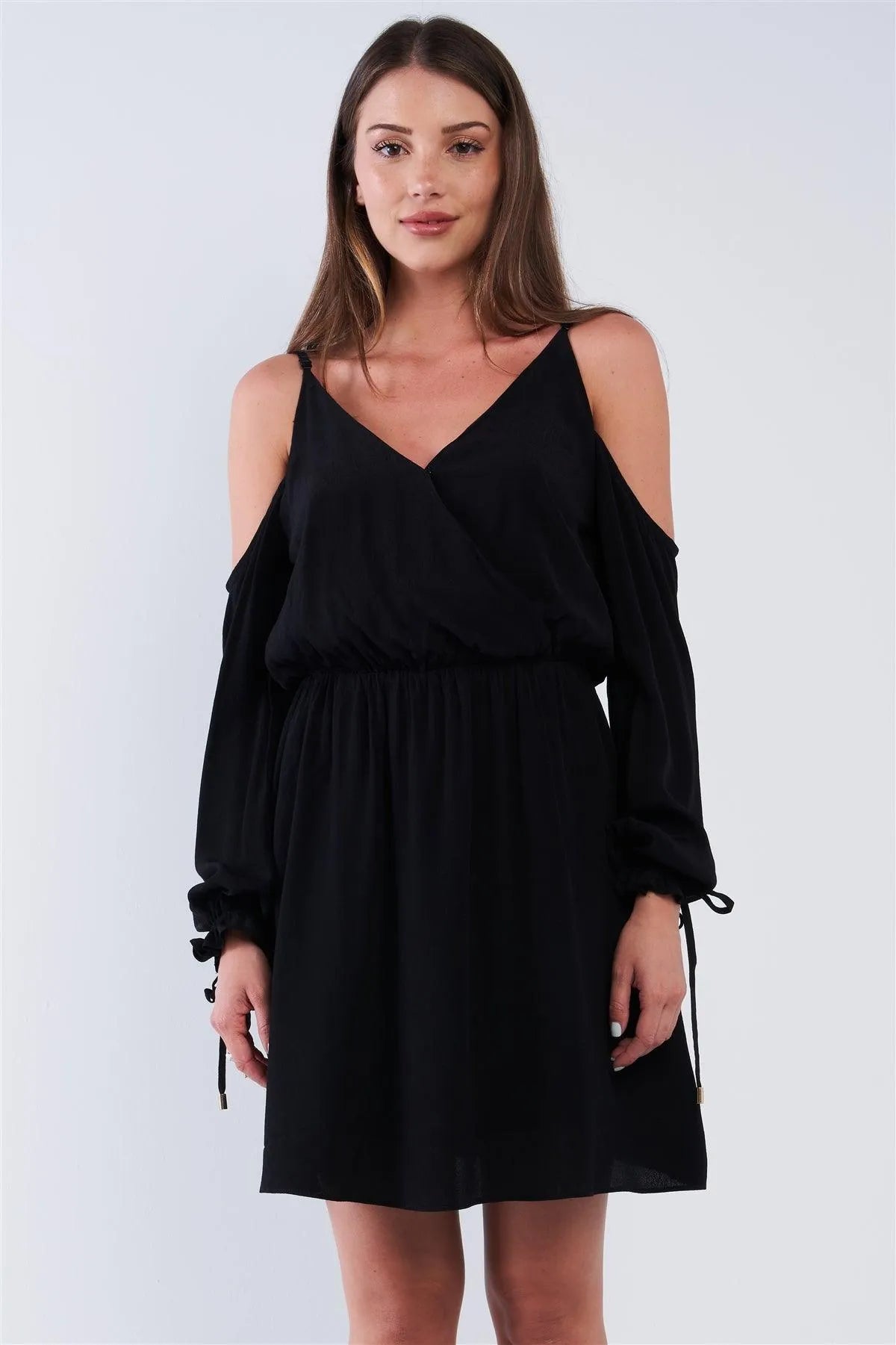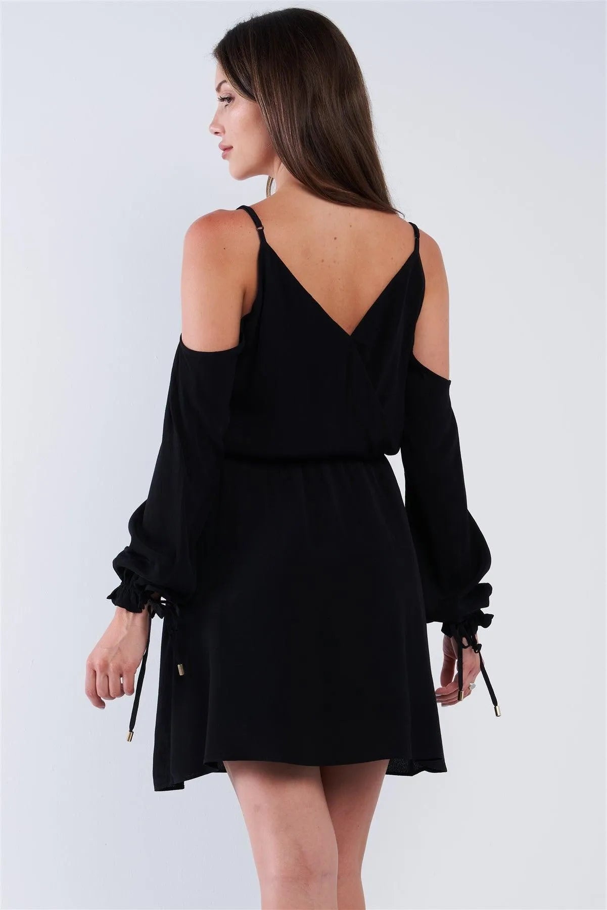 Black Wrap V-Neck Long Off-The-Shoulder Draw String Tie With Aglet Tip Sleeve Mini Dress /1-2-2-1