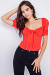 Blood Orange Sweetheart Neckline Puff Sleeve Open Bow Back Cotton Top /3-2-1