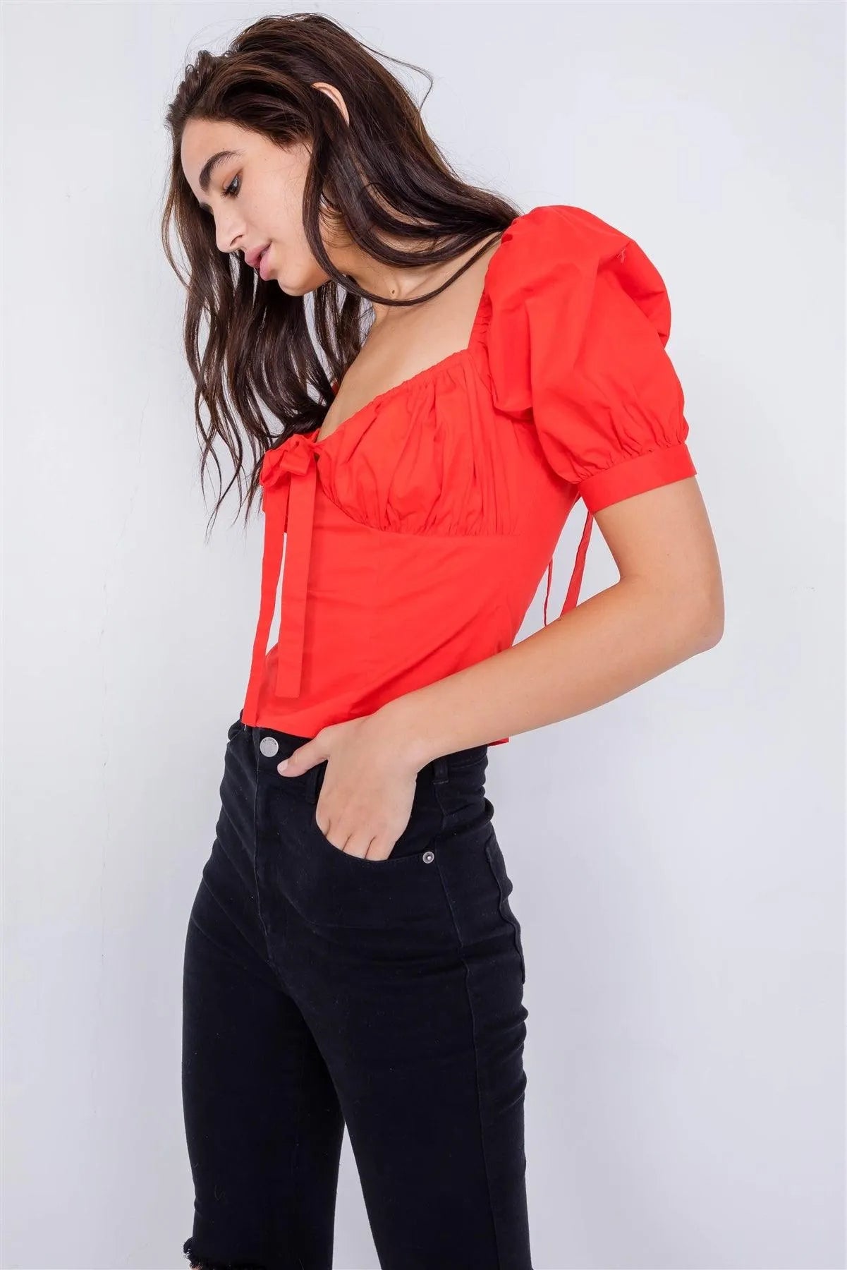 Blood Orange Sweetheart Neckline Puff Sleeve Open Bow Back Cotton Top /4-2-1