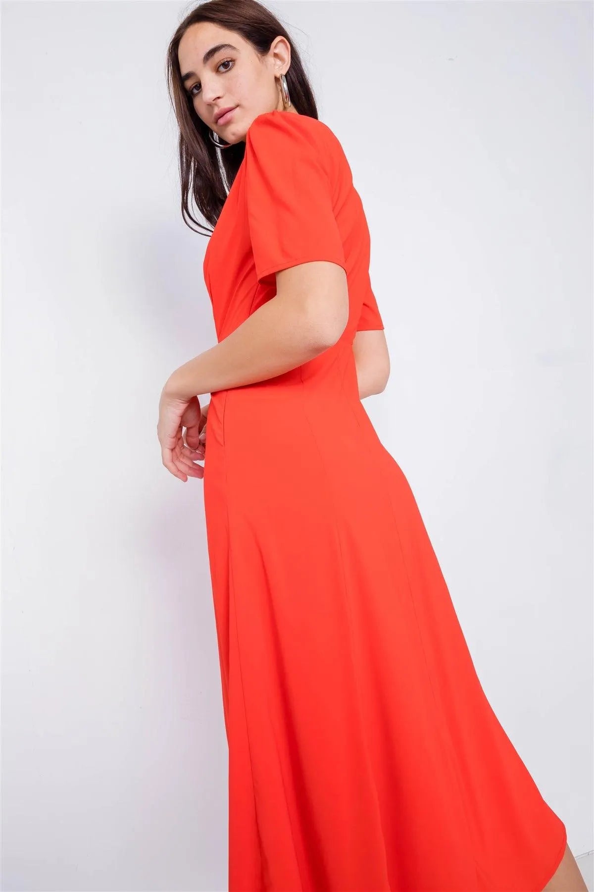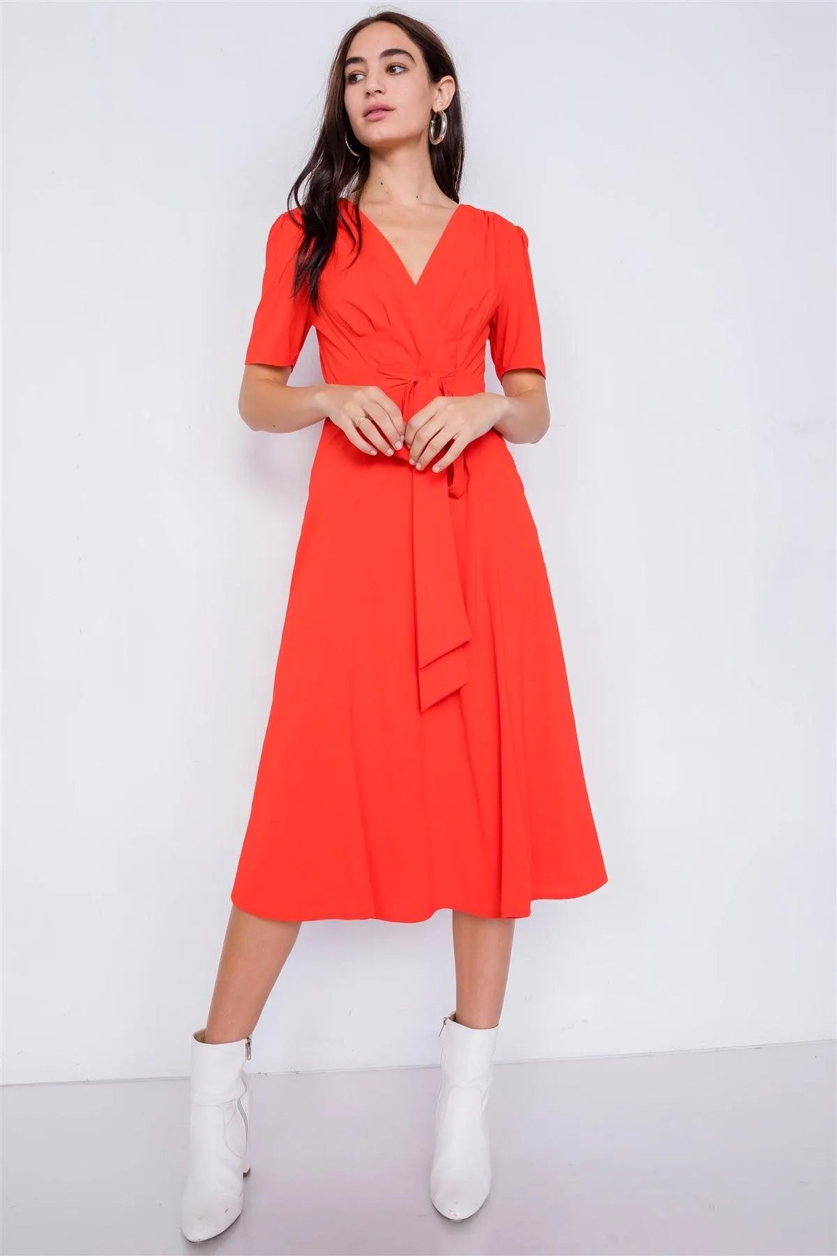 Blood Orange V-Neck Mock Wrap Modern Midi Dress /3-2-1