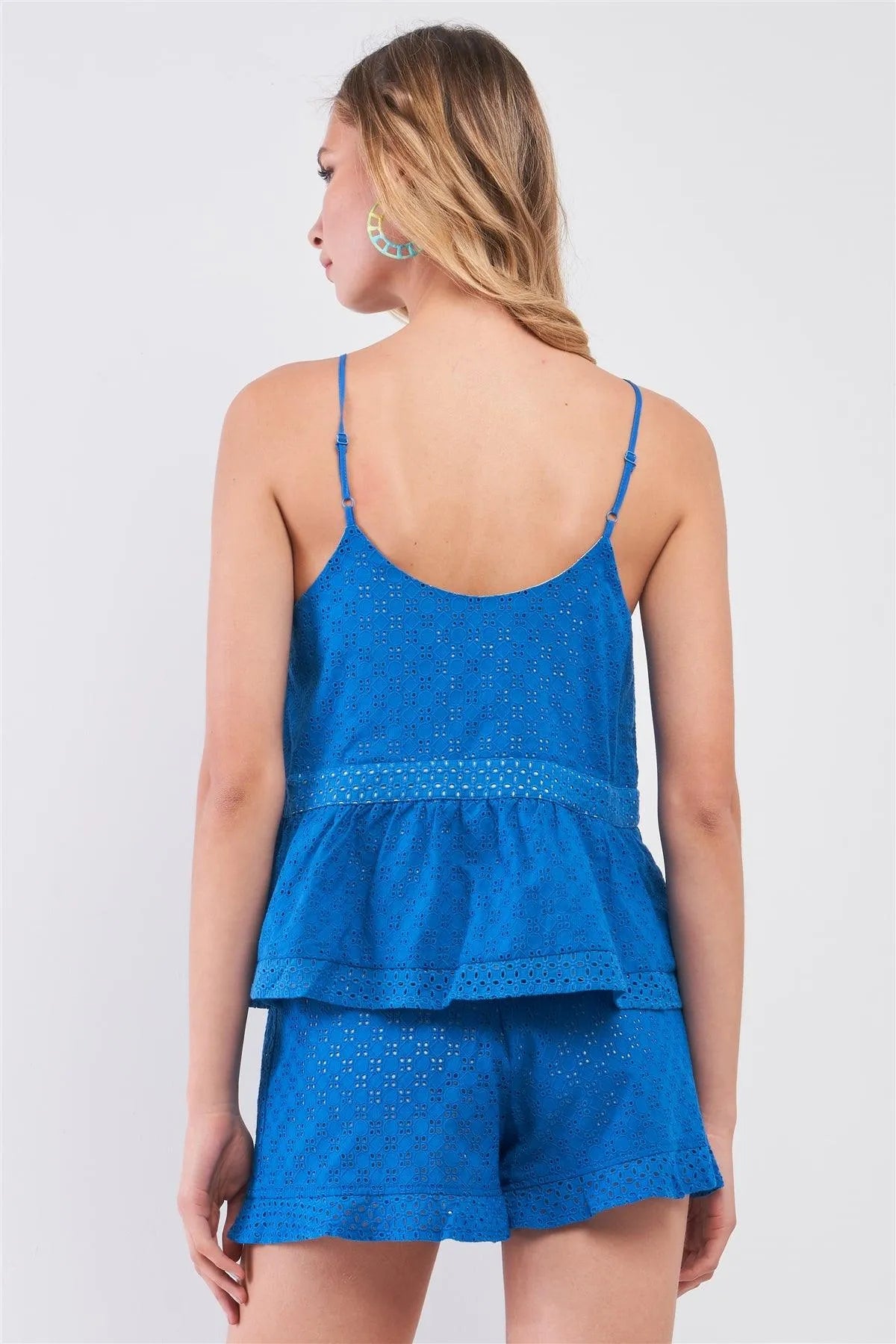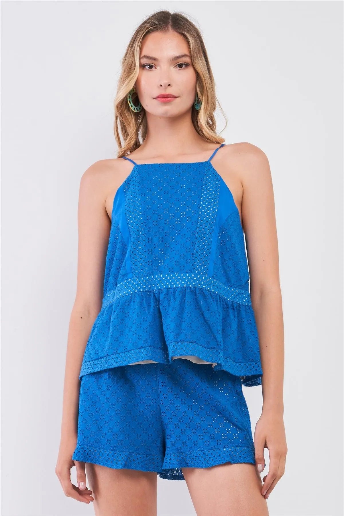 Laguna Blue Crochet Sleeveless Square Neck Flare Top & High Waist Frill Hem Shorts Two-Piece Set /1-2-2-1