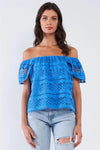 Blue Crochet Off-The-Shoulder Angel Wing Mini Sleeve Multi Pattern Lined Top