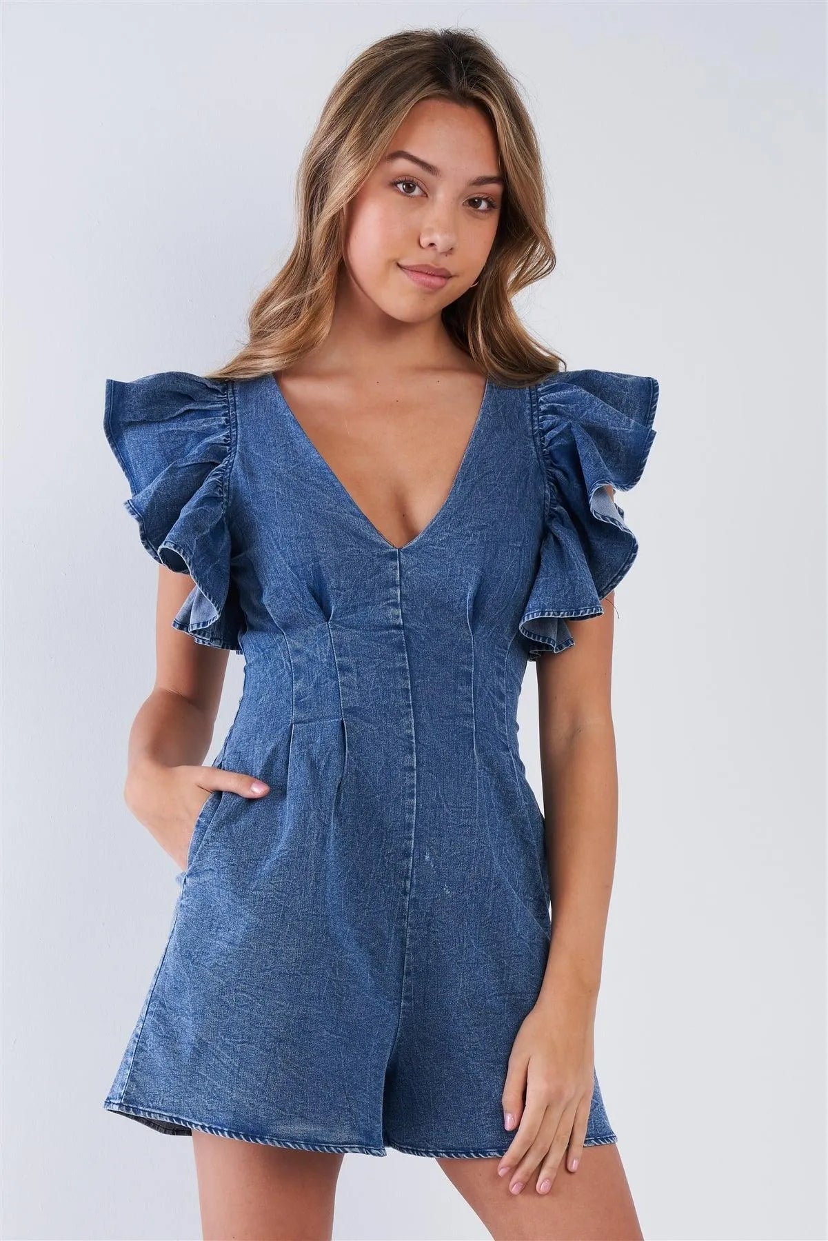 Romper Features: Solid, denim, cinched waistline, v-neck, zipper back, dramatic ruffle sleeves, front pockets, loose fit shirts, mini length, unlined, semi-stretchy, high quality denim, spring, summer Model is 5'10" and wearing size Small (Waist: 26", Bust: 33B, Hips: 35")Item Measurements: Length: 21" , Bust: 30"Item comes pre-packed True to size