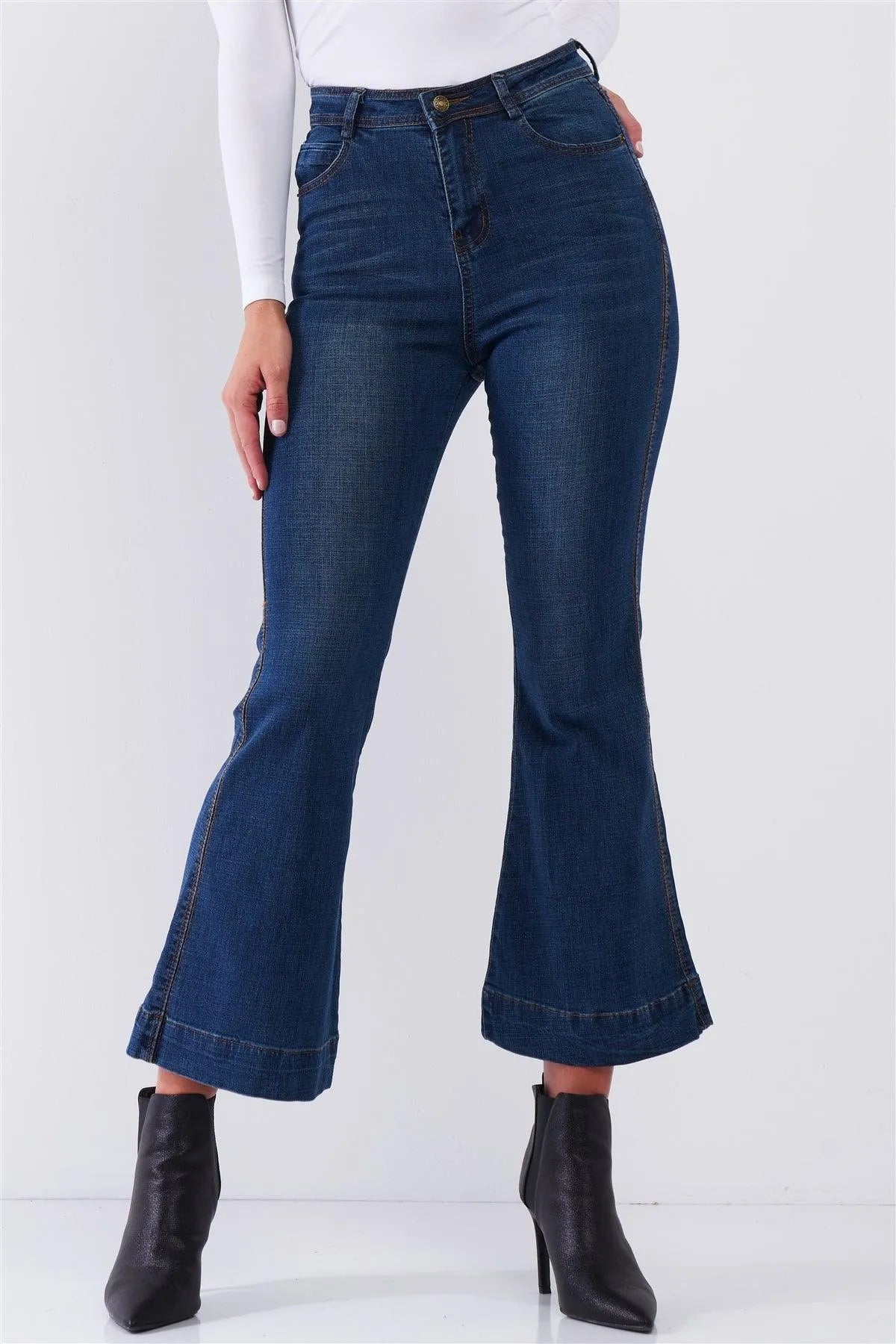 Blue Denim High Waisted Ankle Length Bell Bottom Flare Jeans