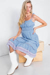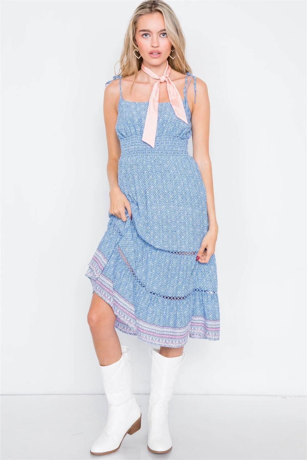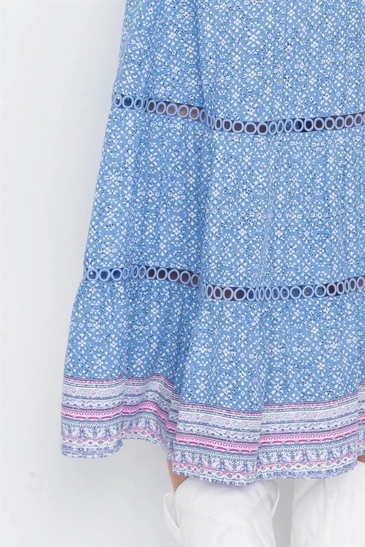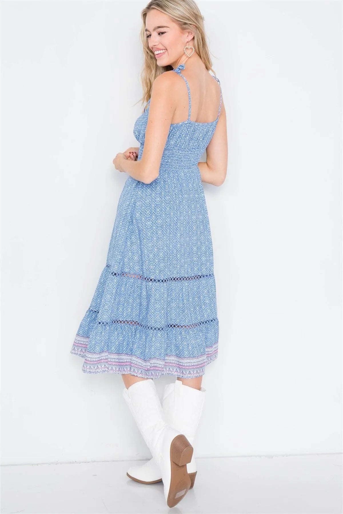 Blue Eyelet Marble Floral Boho Chic Midi Dress /2-2-2
