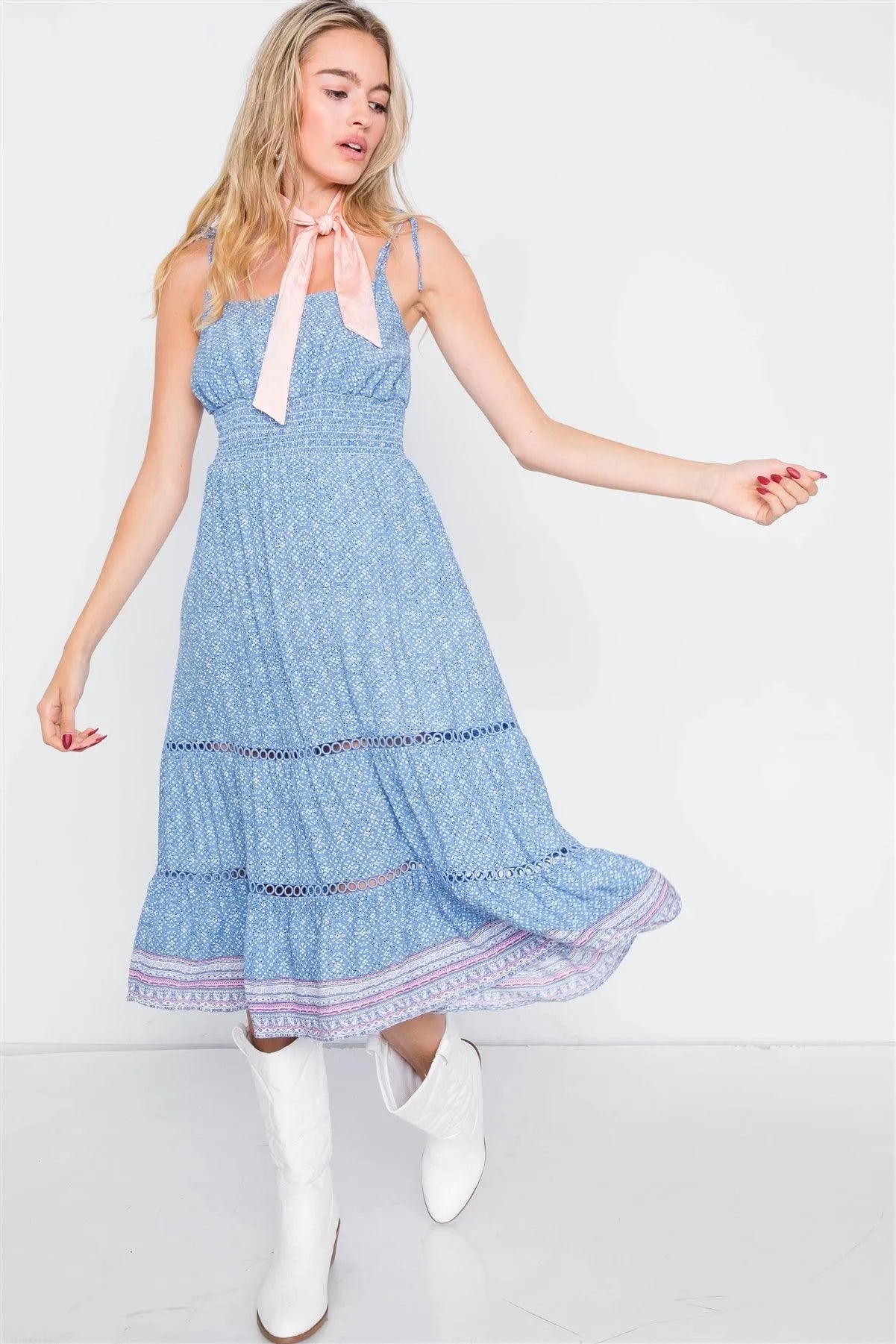 Dress features: eyelet layer, ruched elastic waist, front button detail, adjustable tie cami straps, mini marble floral spec details, pink white and blue boho print hem, midi length, stretchy, partially lined.Model is 5'8 wearing a size Small ( Waist: 26", Bust: 32B, Hips: 34")Item Measurements: Length: 37", Bust: 30"True to size