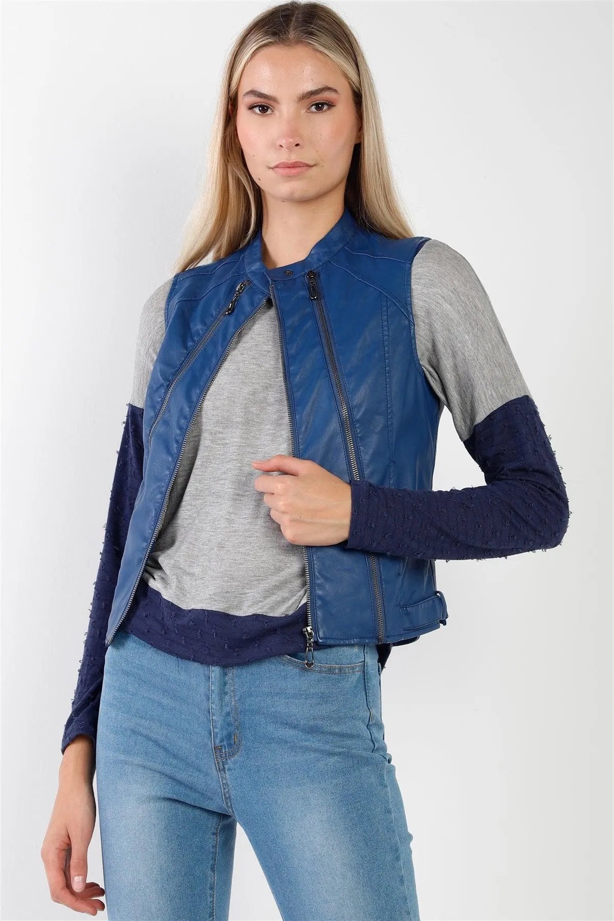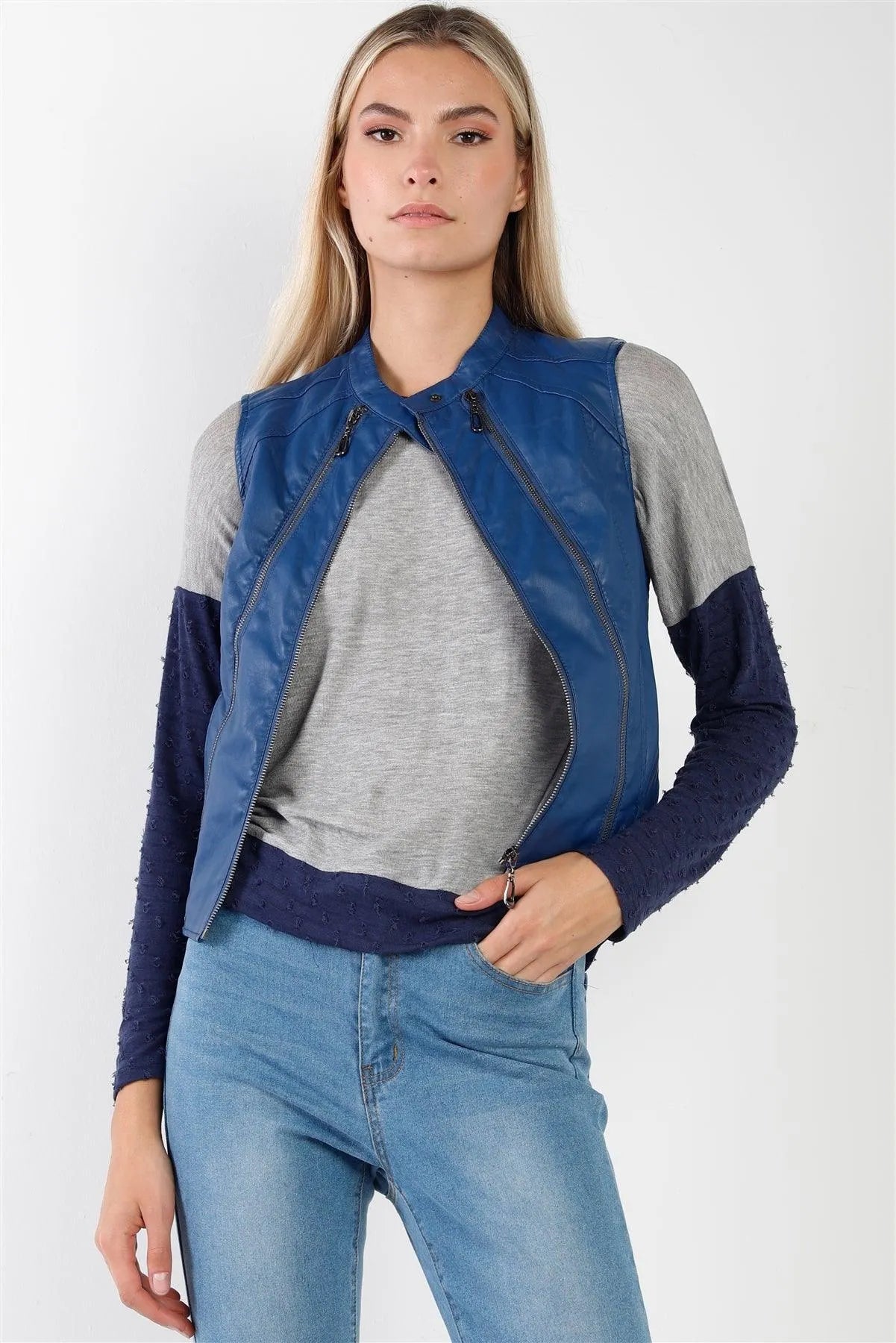 Blue Vegan Leather Faux Fur Lining Triple Zip-Up Detail Moto Vest /2-2-2