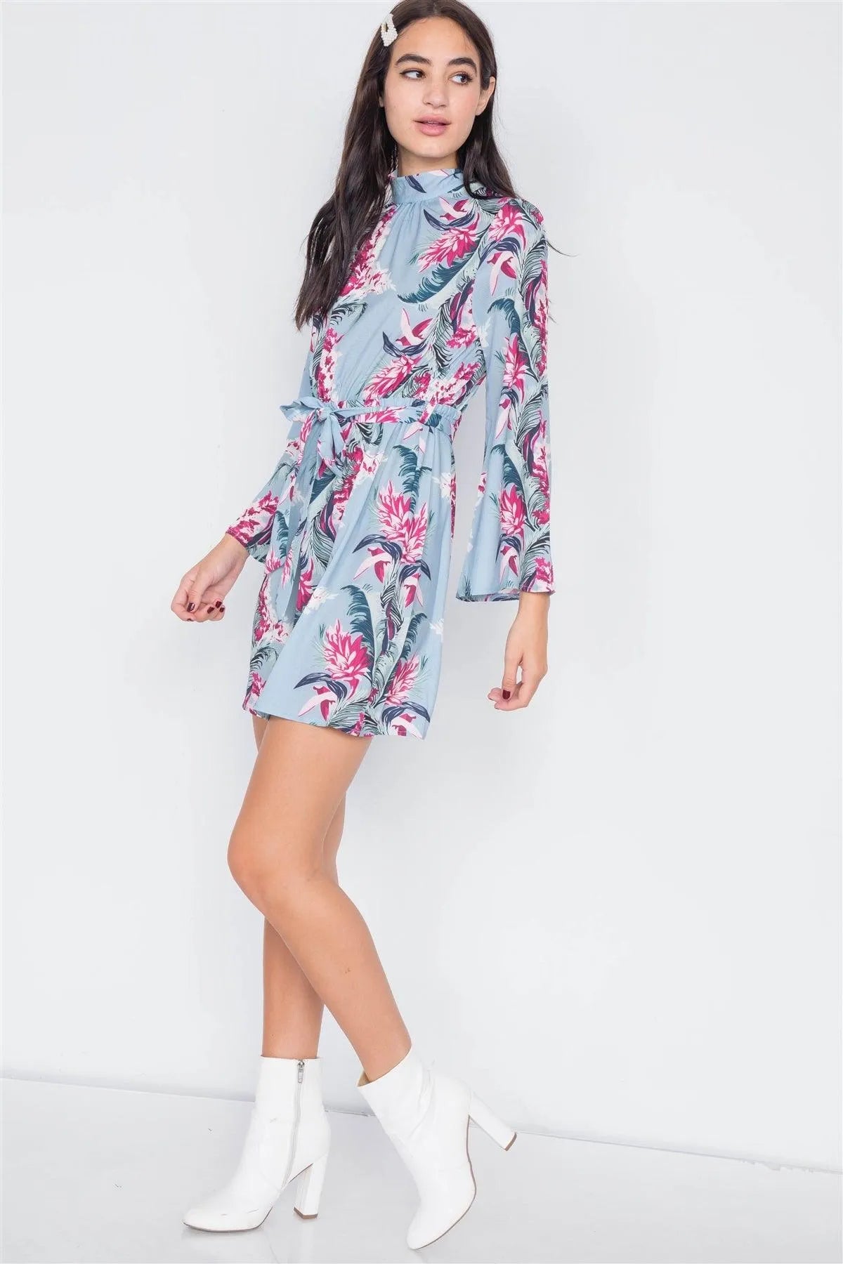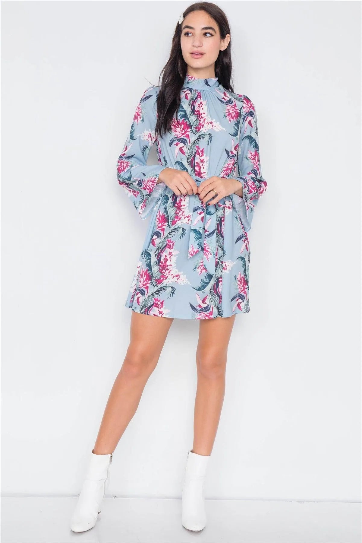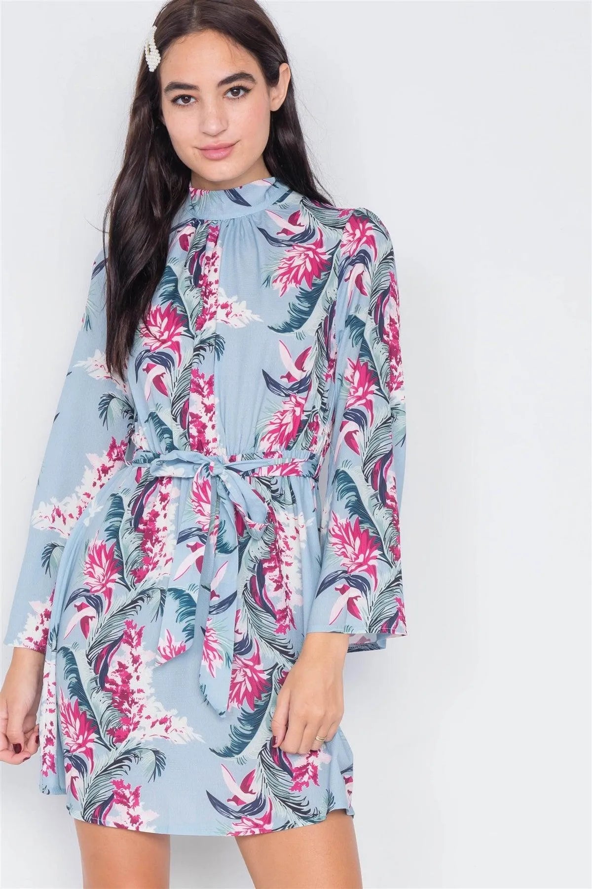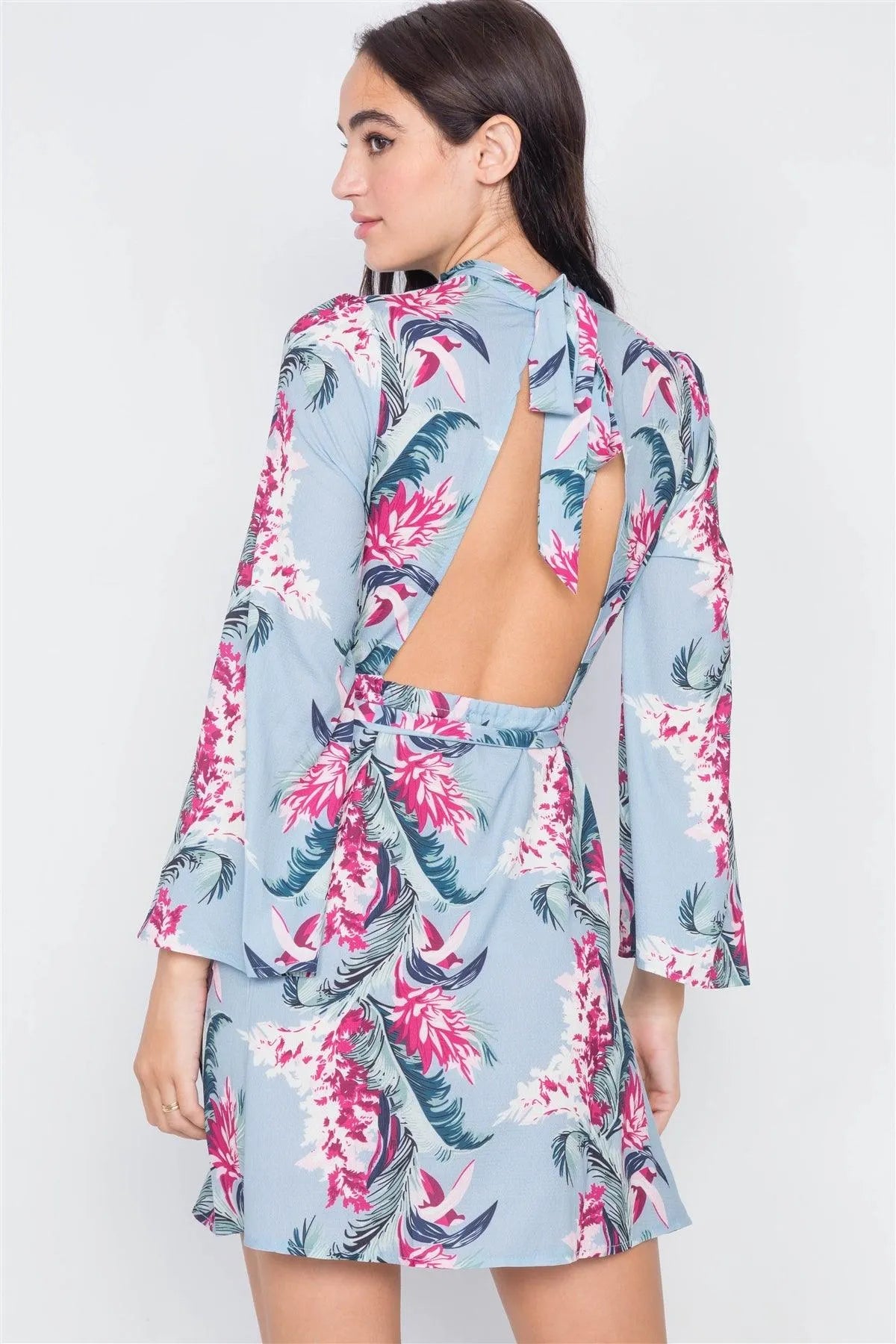 Dress features: open back, halter necktie, cinched neckline, elastic cinched waistline, bell sleeve, mini length, fit and flare, waist self tie, unlined, semi-sheer, stretchy, pink blue red white and green floral print, mini length.Model is 5'9 wearing a size Small (Waist: 24", Bust: 32A, Hips: 34")Item Measurements: Length: 33.5" Bust: 36" Sleeves 23"True to size