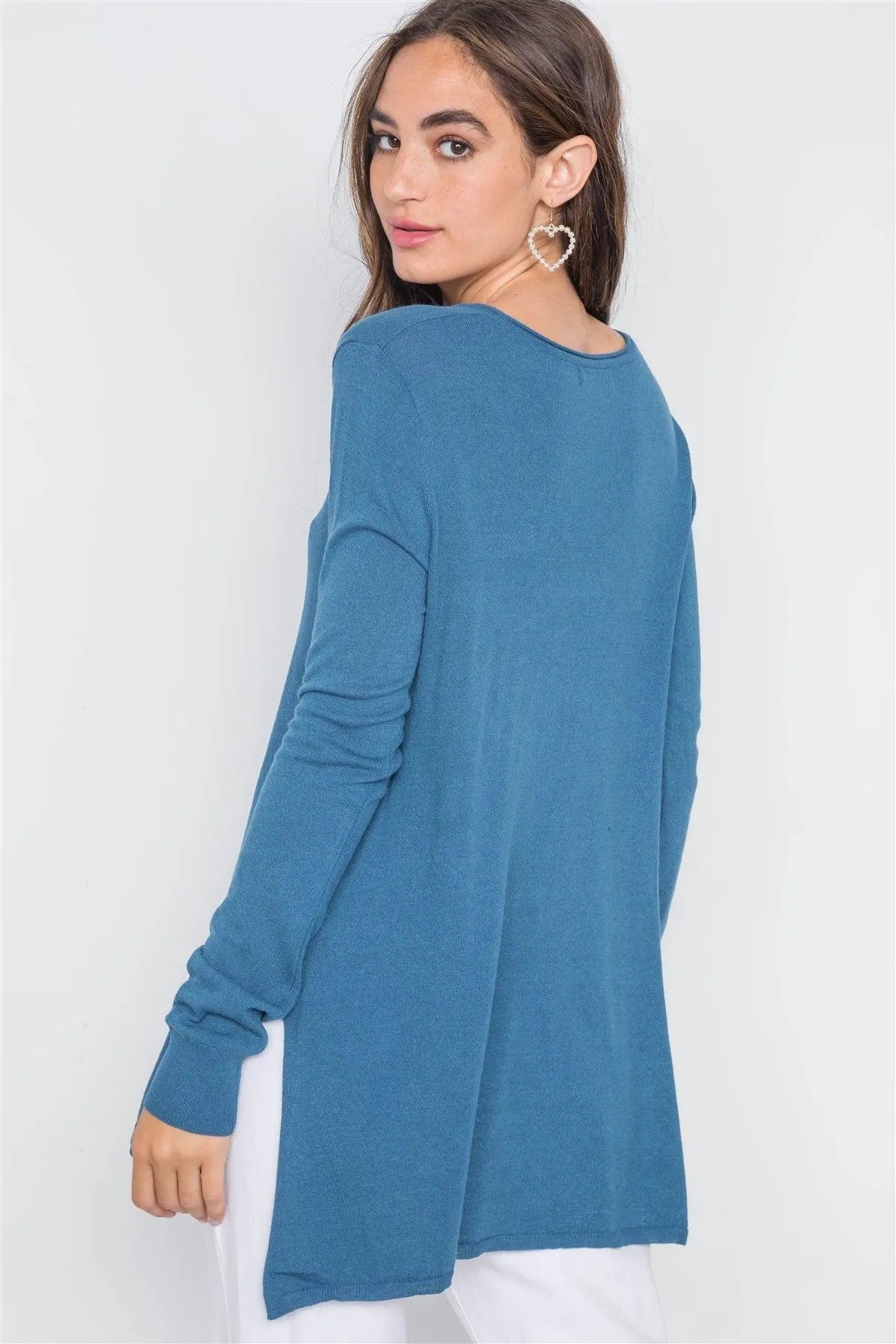 Blue Jean Knit V-Neck Casual Solid Long Sleeve Sweater