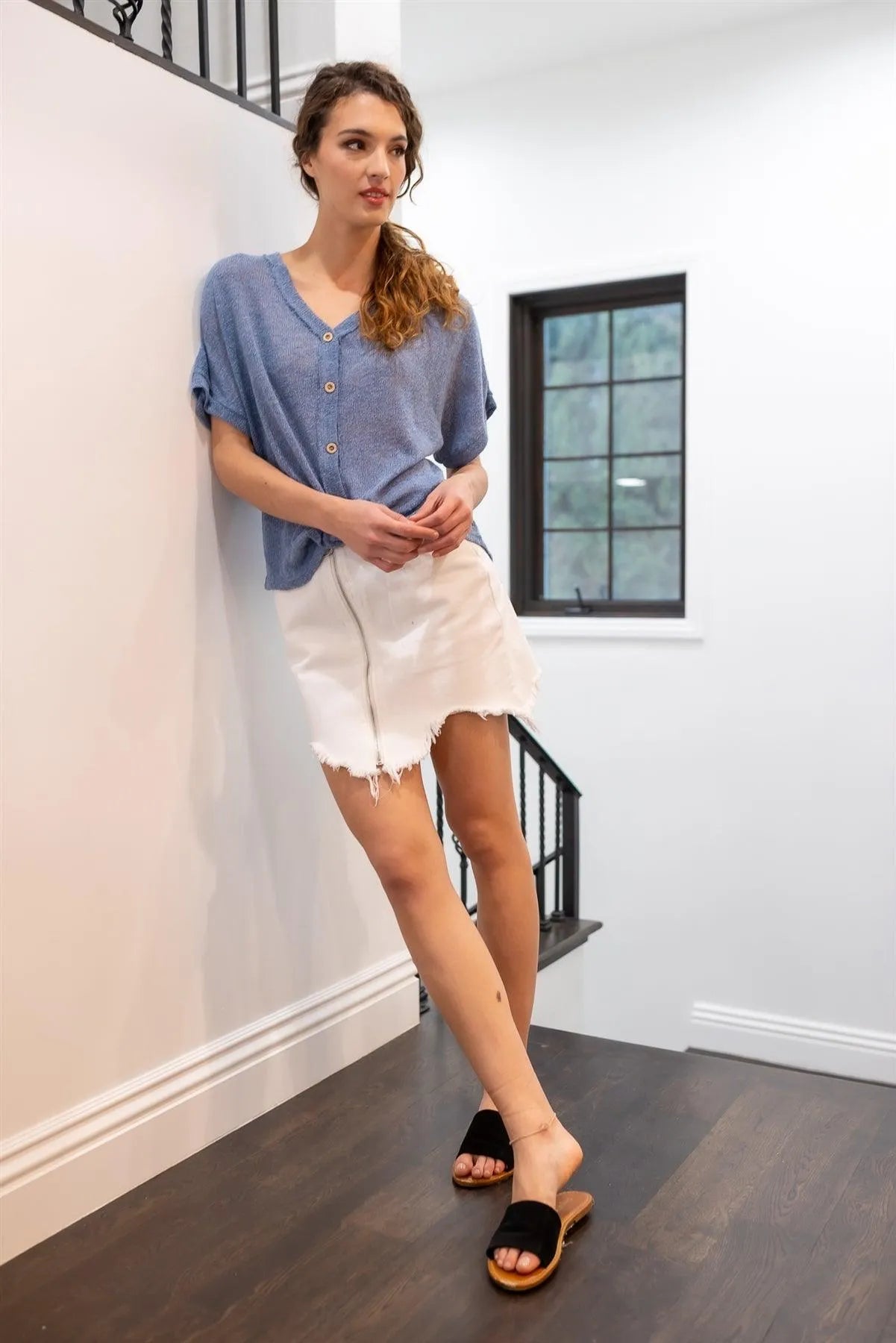 Blue Knit Button Up Semi-Sheer Twisted Front Detail Top /2-2-2